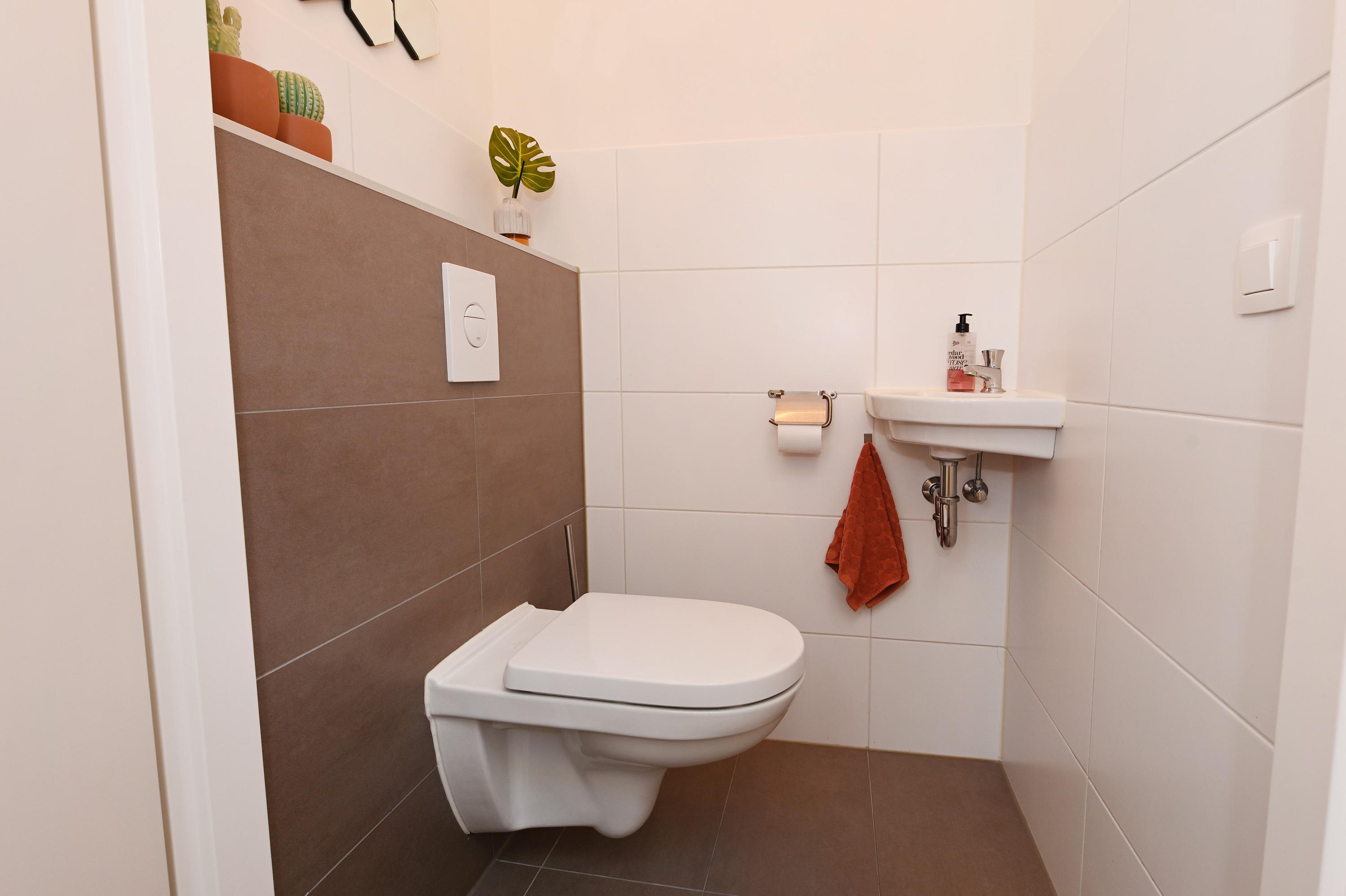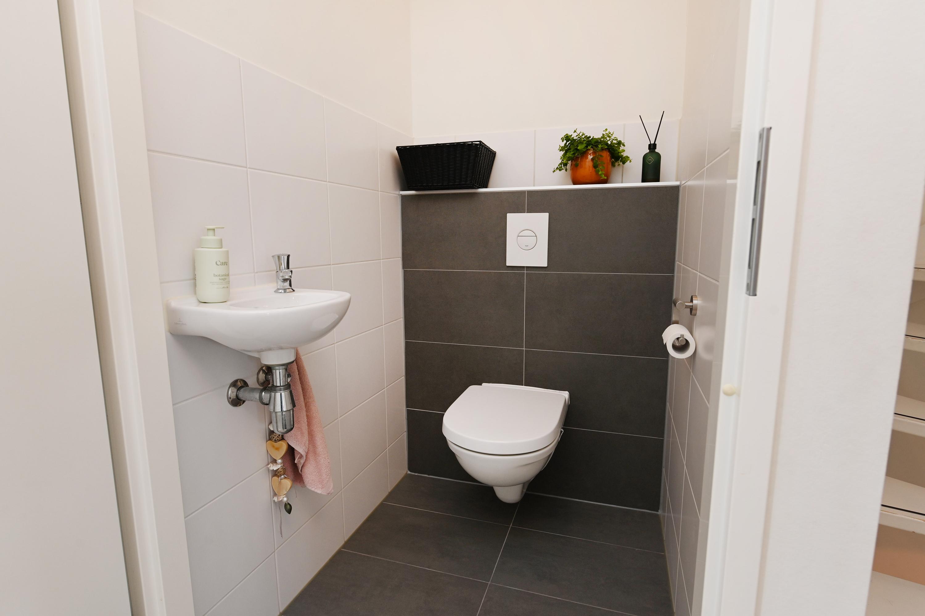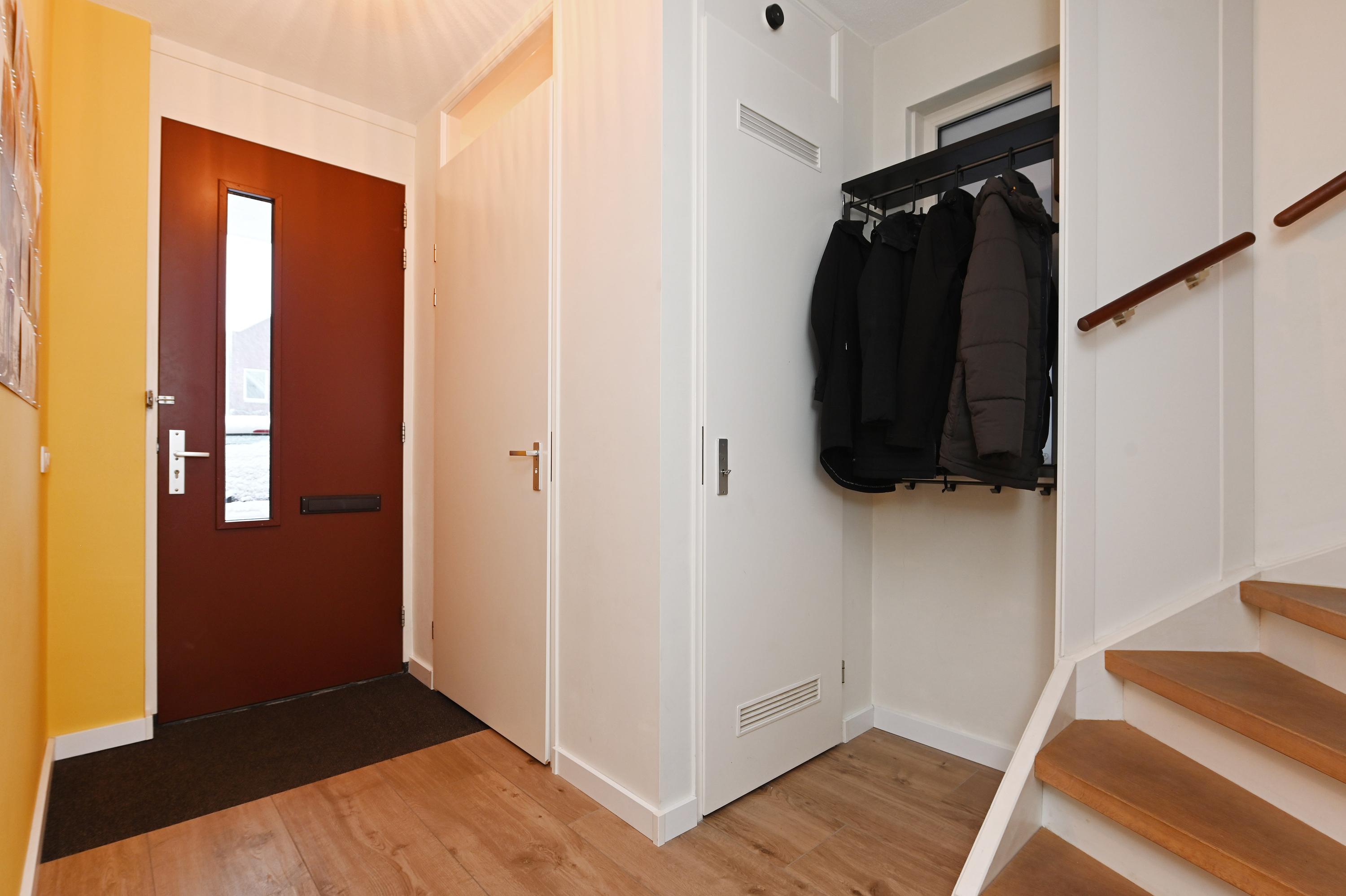 Entree van de woning met allereerst de ruime hal, moderne toiletruimte met wandcloset en fonteintje, meterkast en een praktische inloopkast.
