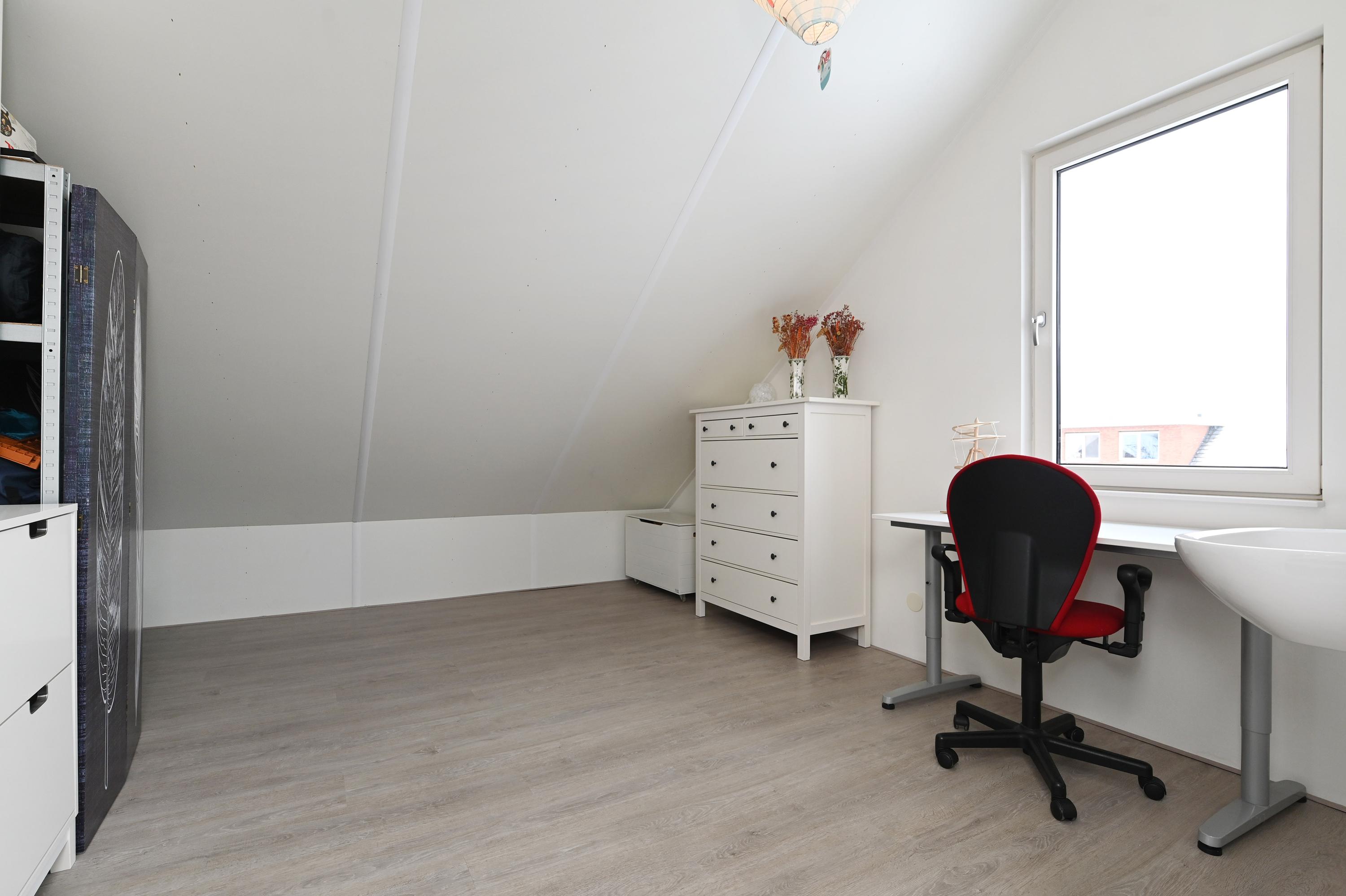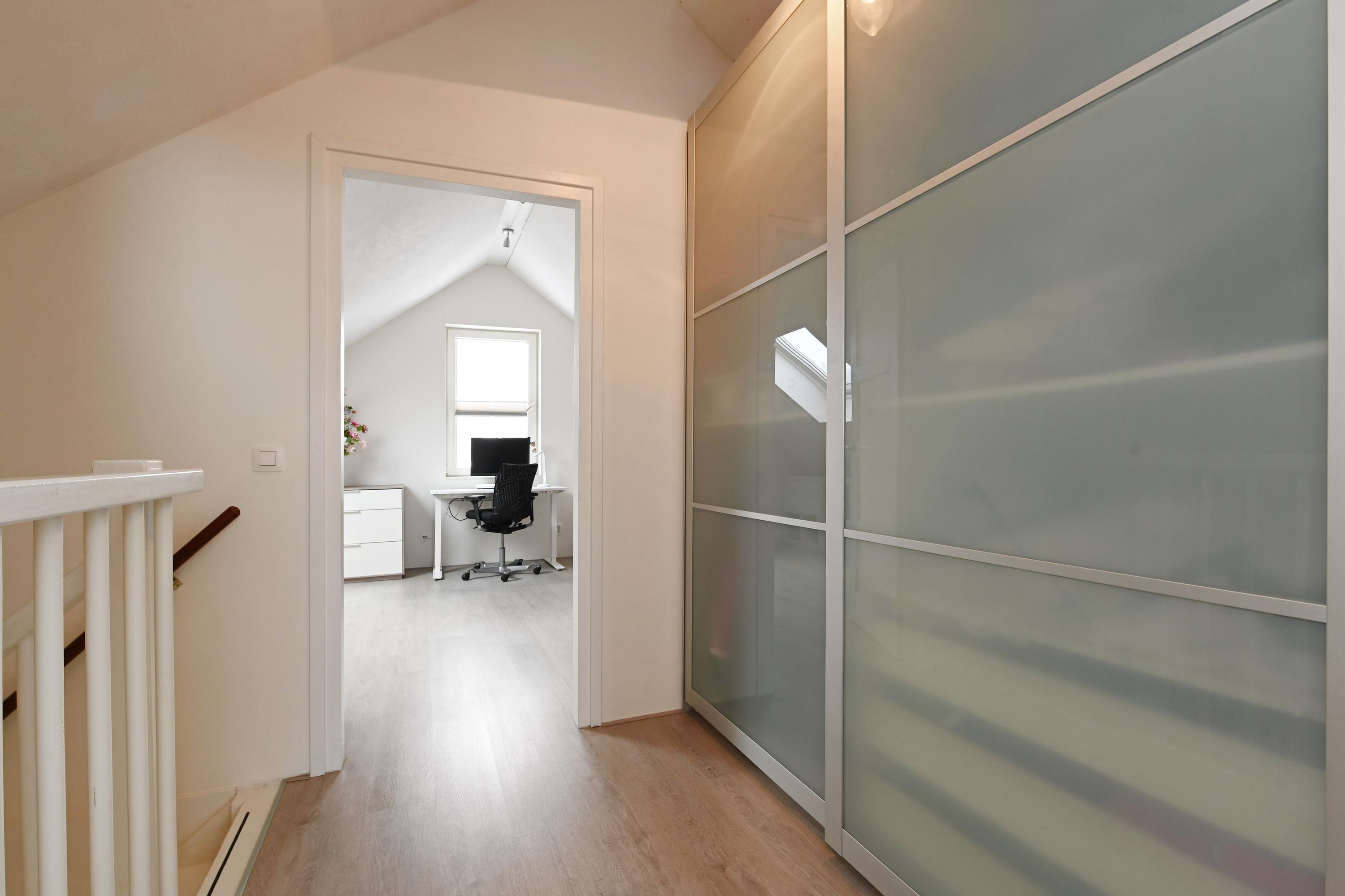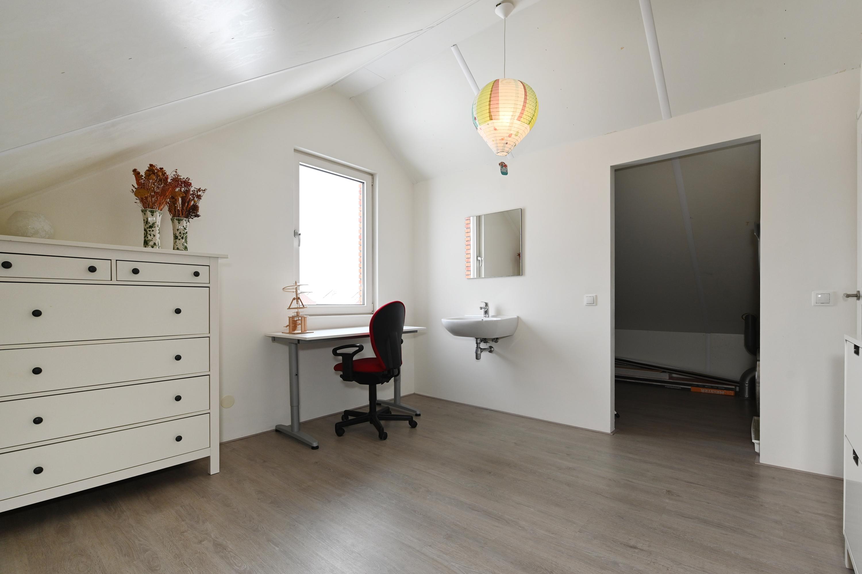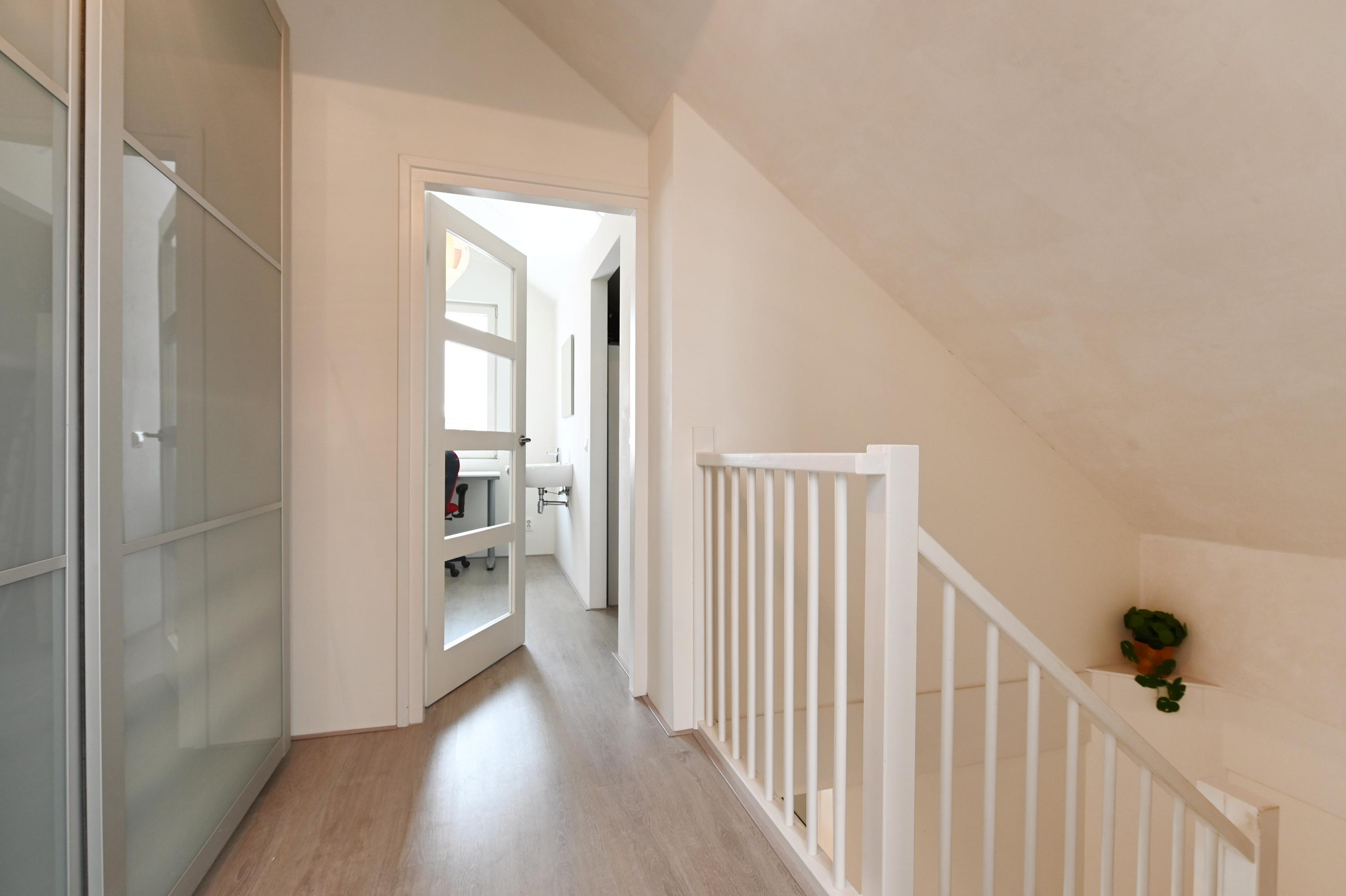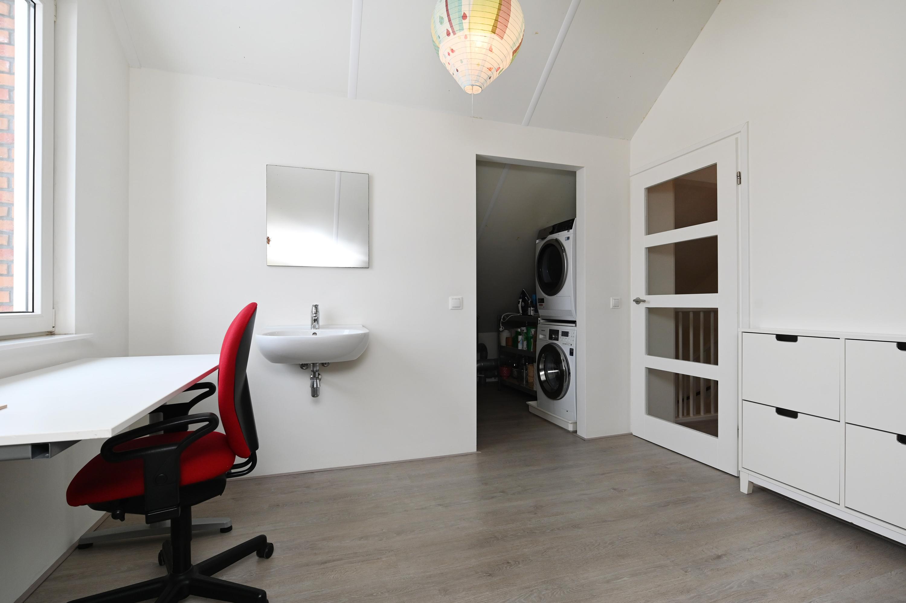 Overloop, twee slaapkamers, waarvan de slaapkamer aan de voorzijde is voorzien van een wastafel en tevens een semi-open ruimte heeft die in gebruik is als praktische berging. Hier bevindt zich tevens de aansluiting voor de wasmachine en de droger. De slaapkamer aan de achterzijde is eveneens heel ruim en deze heeft een extra dakvenster.