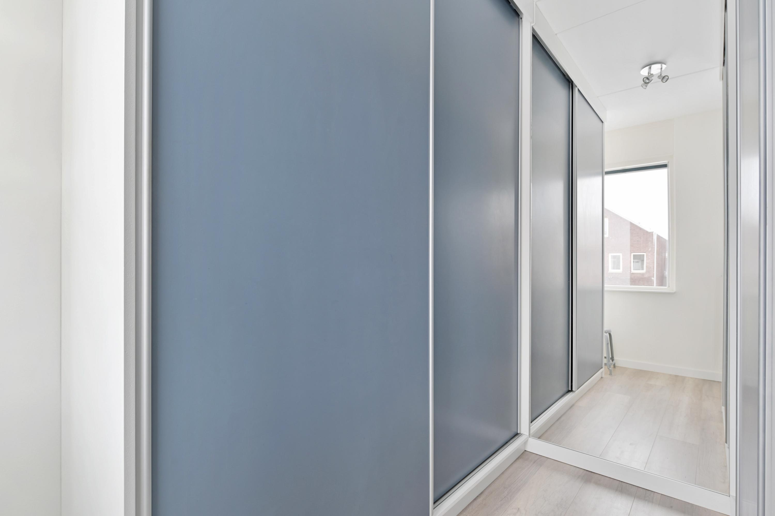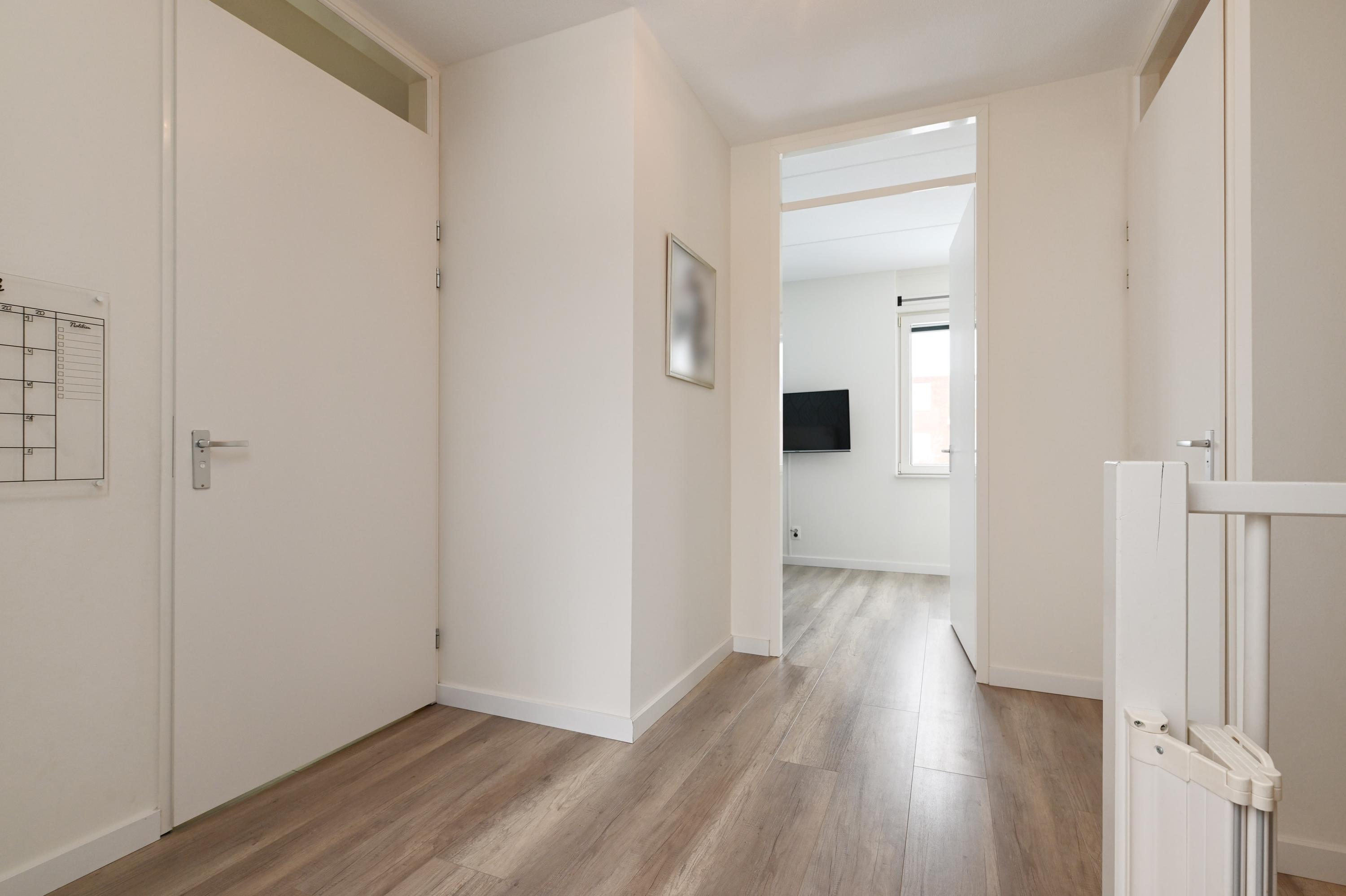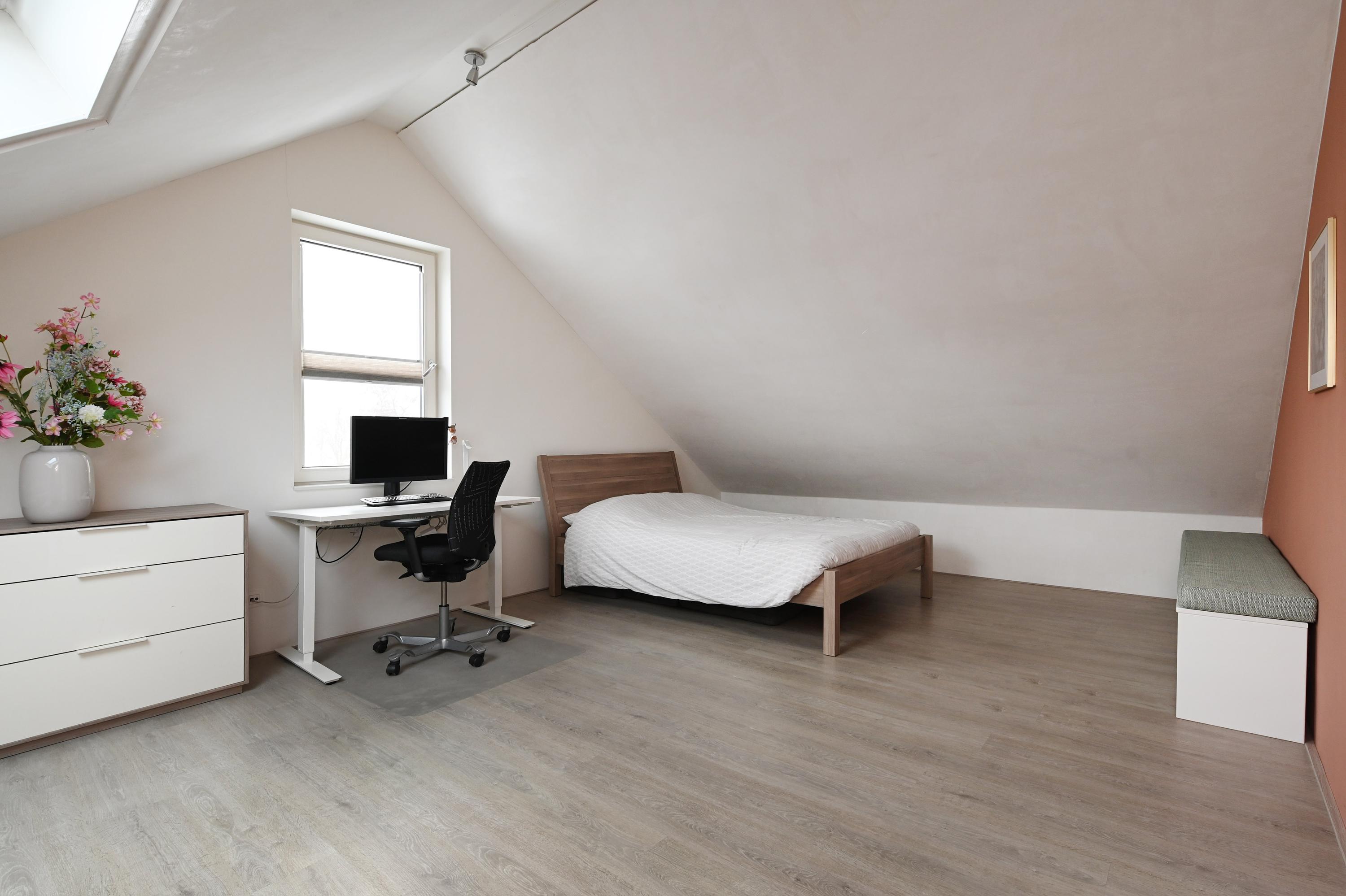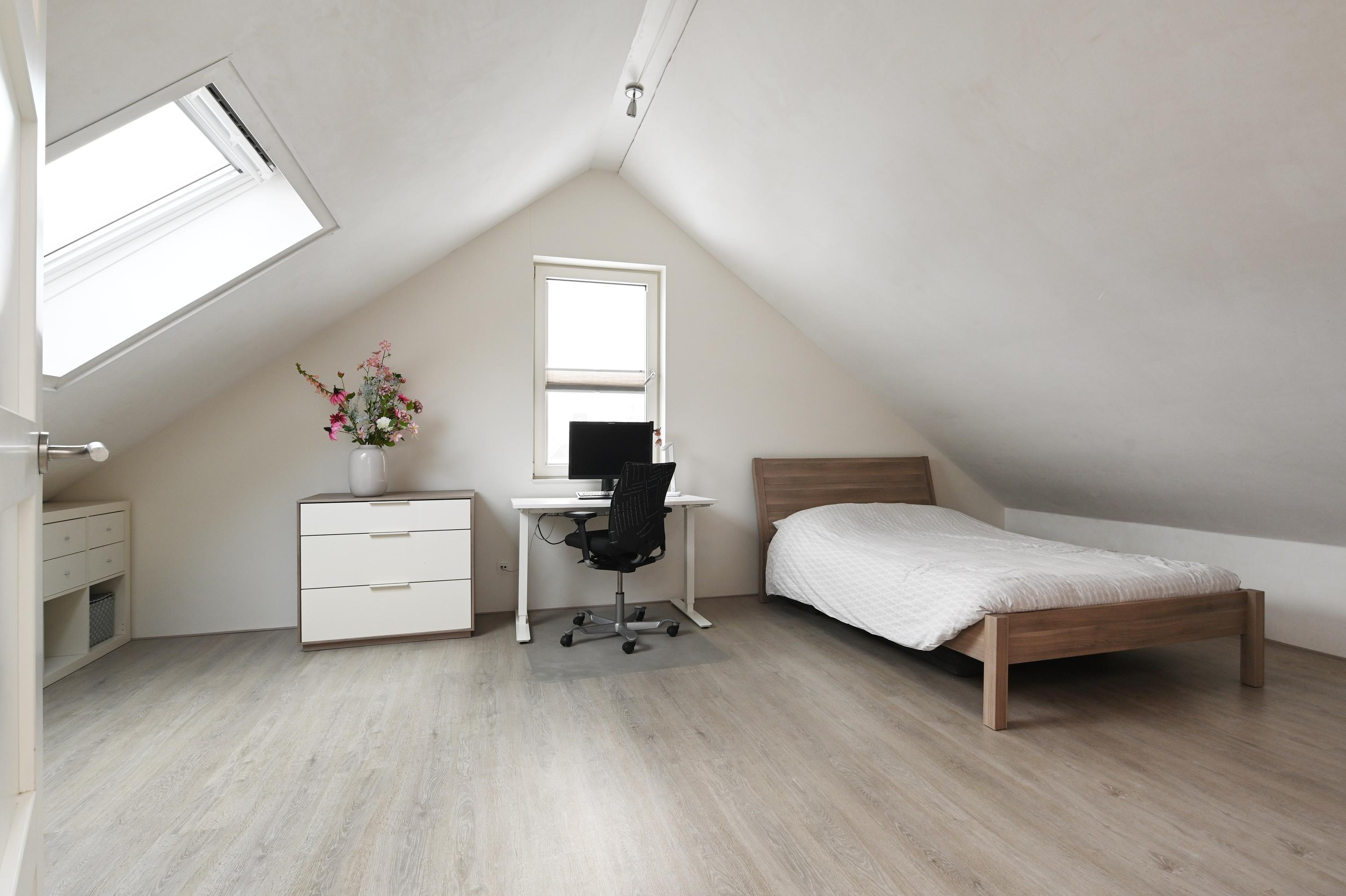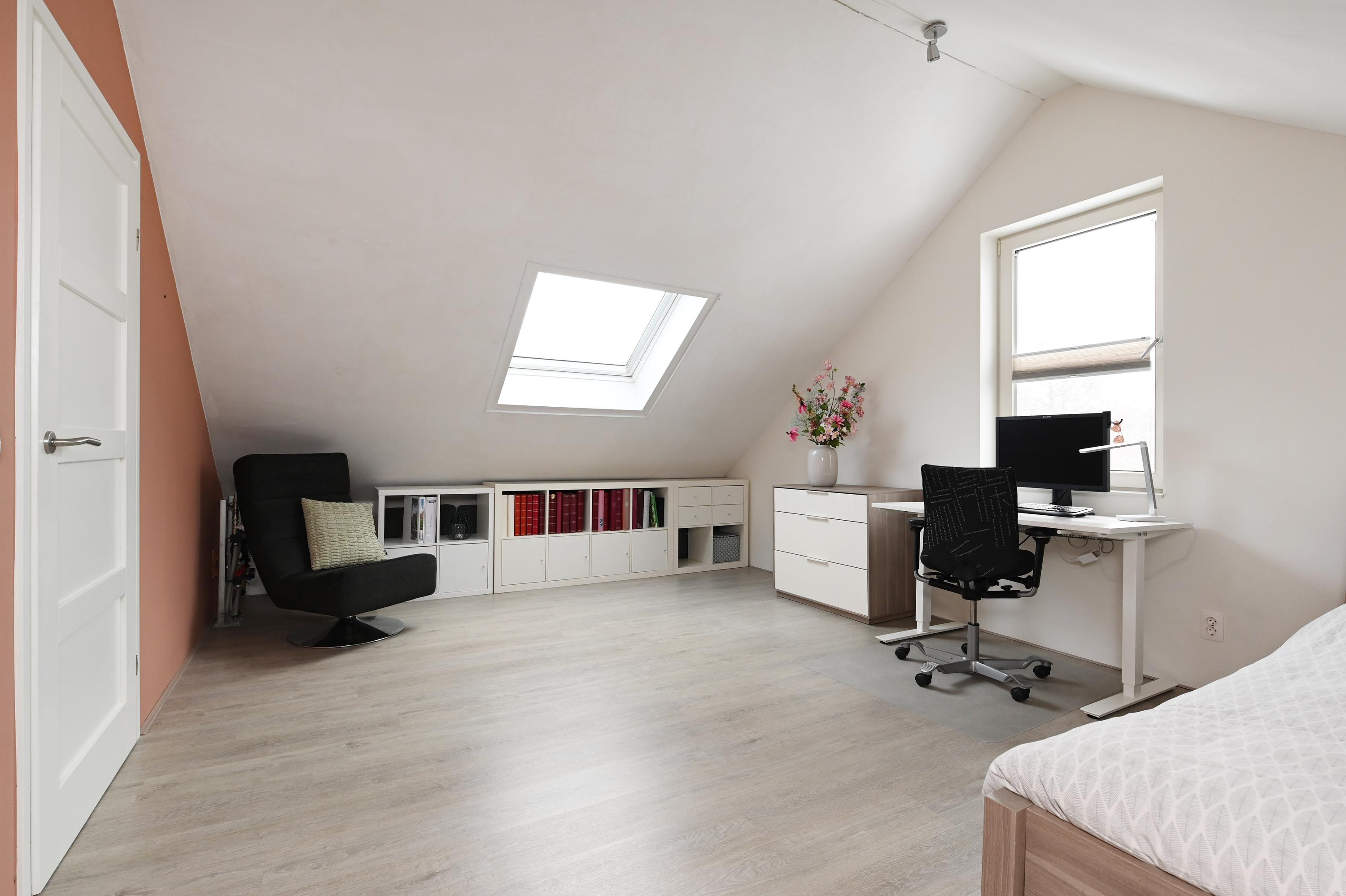 Overloop, twee slaapkamers, waarvan de slaapkamer aan de voorzijde is voorzien van een wastafel en tevens een semi-open ruimte heeft die in gebruik is als praktische berging. Hier bevindt zich tevens de aansluiting voor de wasmachine en de droger. De slaapkamer aan de achterzijde is eveneens heel ruim en deze heeft een extra dakvenster.