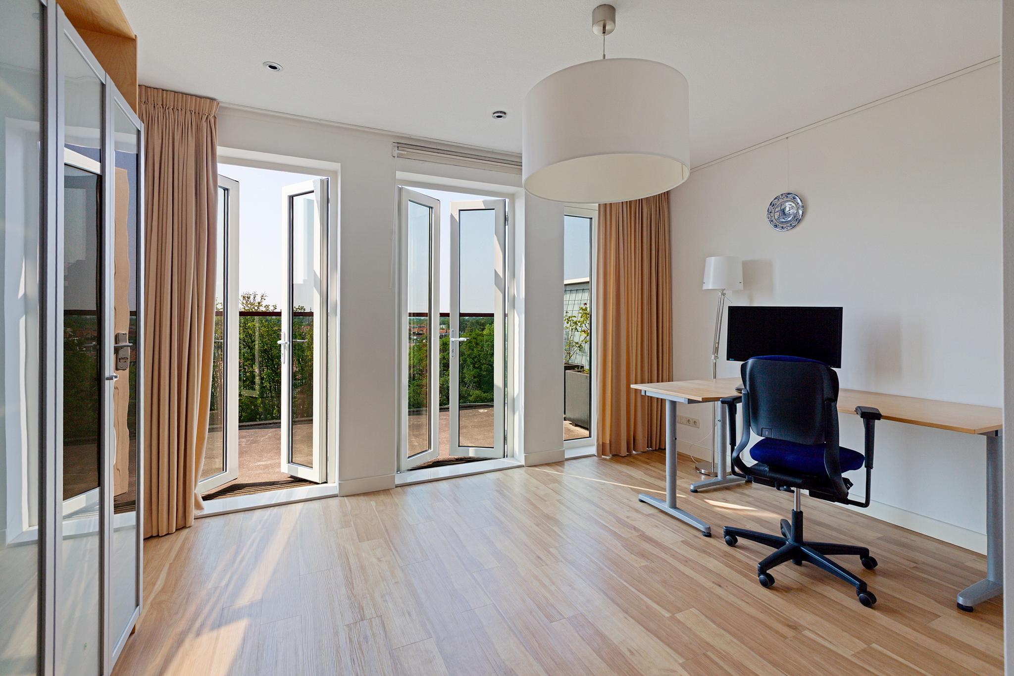 Entrance to the apartment. Spacious hallway providing access to various rooms. Exceptionally large living room with a cozy seating area and a large fireplace/stove. The bright dining area immediately stands out due to the unique ceiling height of no less than 5.50 meters, thanks to the mezzanine! During construction, this height was deliberately created to allow for the installation of a striking chandelier. The dining area provides access to a lovely sunroom on the terrace and to the open kitchen. The kitchen is modern, offers ample cupboard space, and is equipped with luxurious built-in appliances, including a fridge, freezer, microwave, oven, induction cooktop, extractor hood, dishwasher, and Quooker. The master bedroom is located on the northeast side of the apartment and is beautifully furnished with ample built-in wardrobes. From this bedroom, you can access a luxurious and spacious bathroom equipped with a walk-in shower, (whirlpool) bath with star ceiling, sauna, toilet, and a vanity unit – a wonderful space to fully unwind.