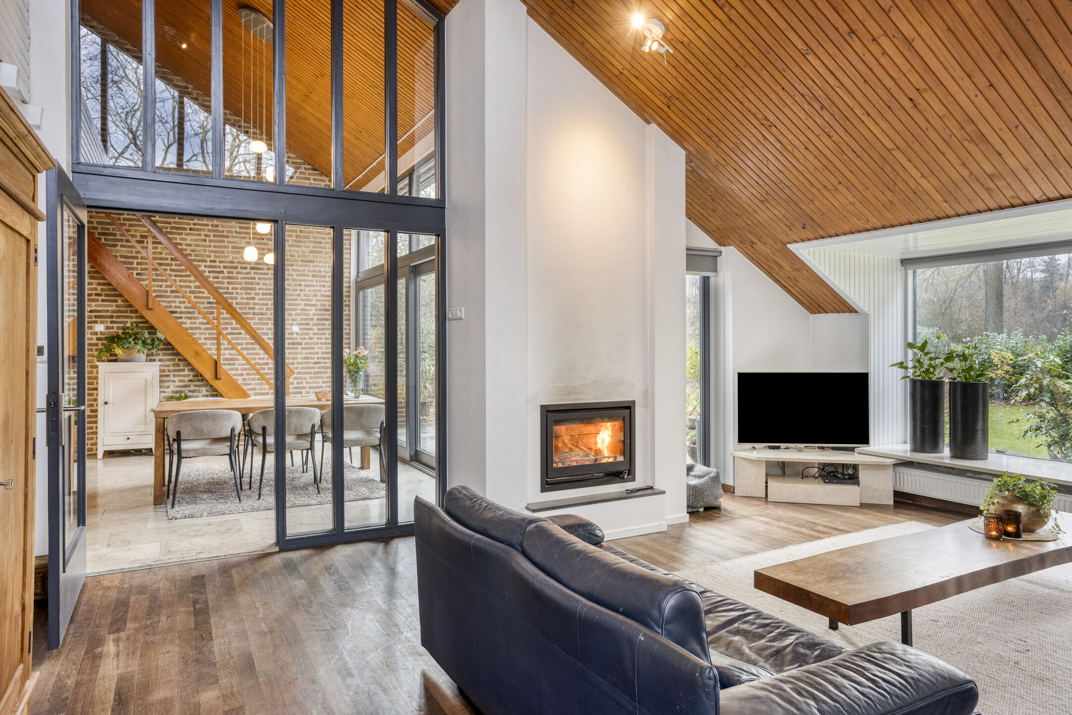Via de hal kom je in de eetkamer, een lichte en uitnodigende ruimte dankzij de grote schuifpui. De eetkamer is voorzien van een houtkachel. Hier bevindt zich ook de trapopgang naar de eerste verdieping. Vanuit de eetkamer loop je door naar de woonkamer en de keuken. De woonkamer is ook voorzien van een sfeervolle houtkachel. De dichte keuken heeft een speels effect dank zij de bar aan het keukenblad. De keuken is uitgerust met diverse inbouwapparatuur, waaronder een 4-pits inductiekookplaat met afzuigkap, oven, koelkast, vaatwasser, stoomoven, warmhoudlade en een keukenboiler.