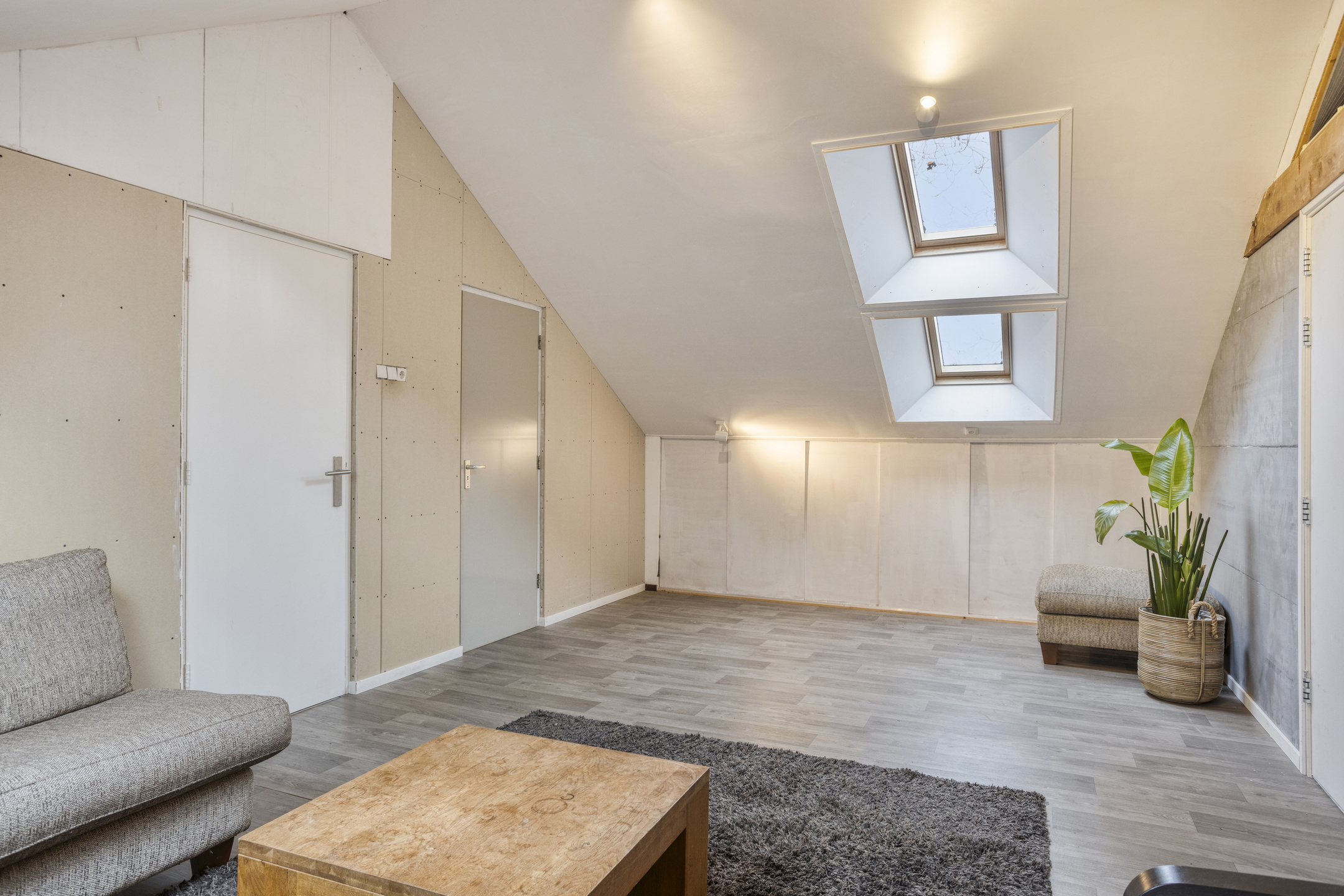 Eerste verdieping: bordes met toegang tot de vide die nu wordt gebruikt als atelier, de berging en de twee hele ruime kamers (30 m²). De berging is voorzien van een wastafel en daar zit tevens de CV-ketel. De ene kamer wordt nu gebruikt als slaapkamer en de ander als extra living. Dit kan uiteraard ook prima gebruikt worden als slaapkamer.