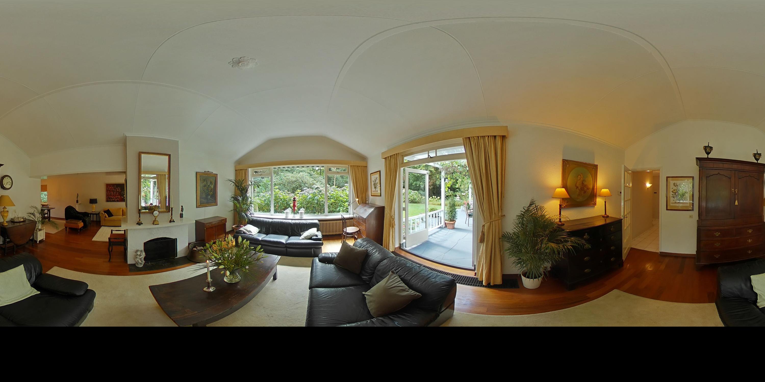 De elegante tuinkamer verbindt woonkamer met de serre, maar is een heerlijke zitruimte op zich, met uiteraard het prachtige uitzicht. De houtvloer contrasteert fraai met de frisse witte wanden.