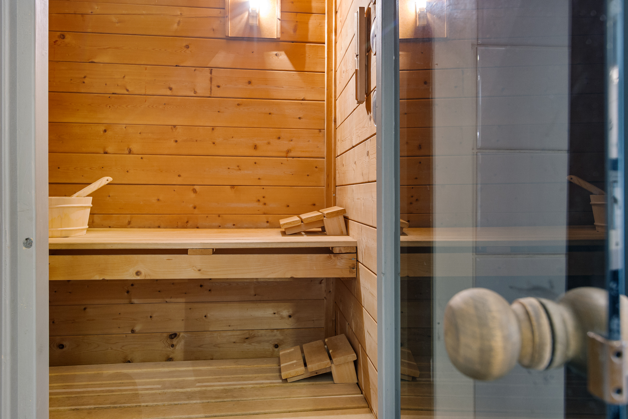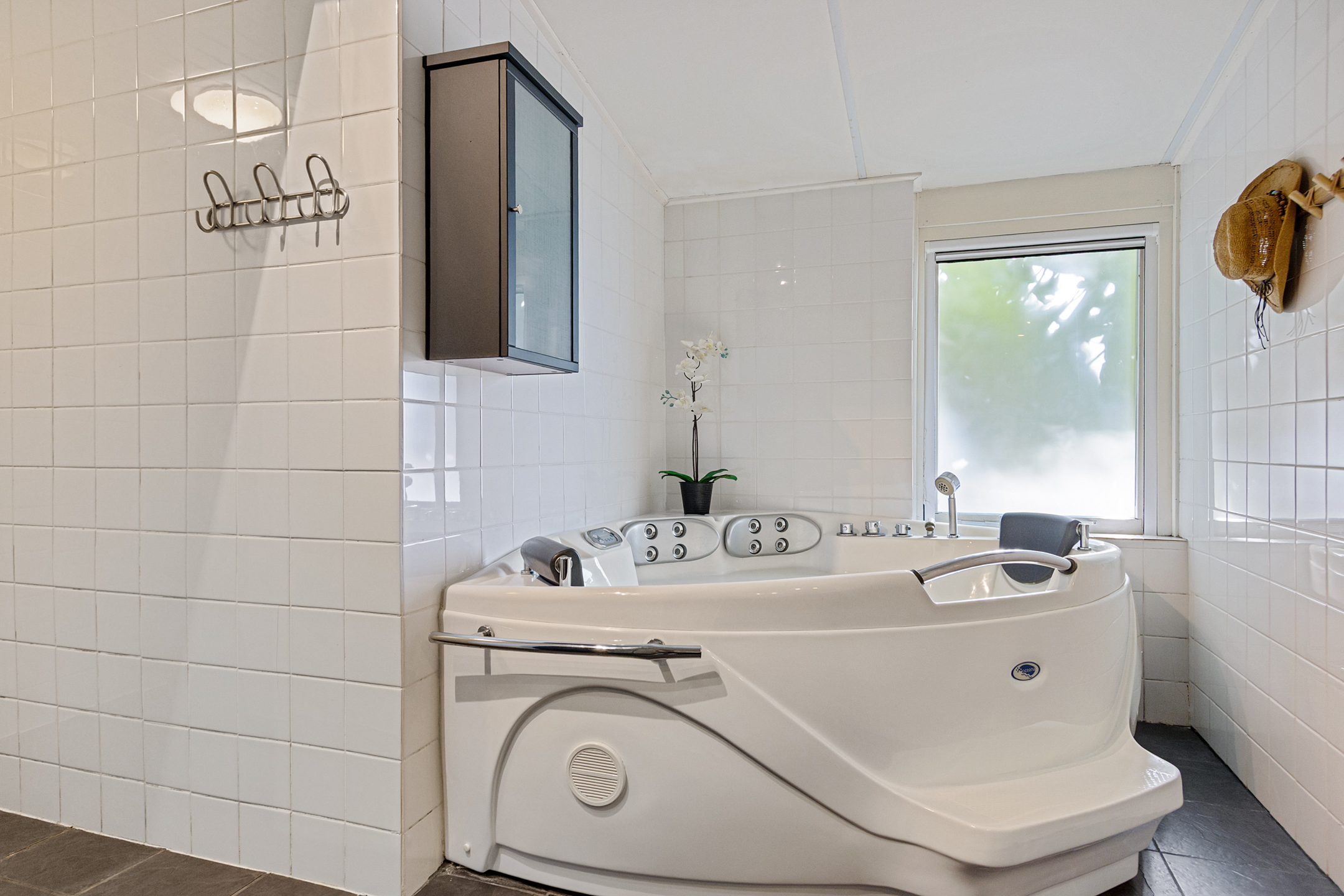 The master bedroom is located at the rear of the house and overlooks the stables. The ground-floor bathroom features a walk-in shower, whirlpool bath, double washbasin, and sauna.
