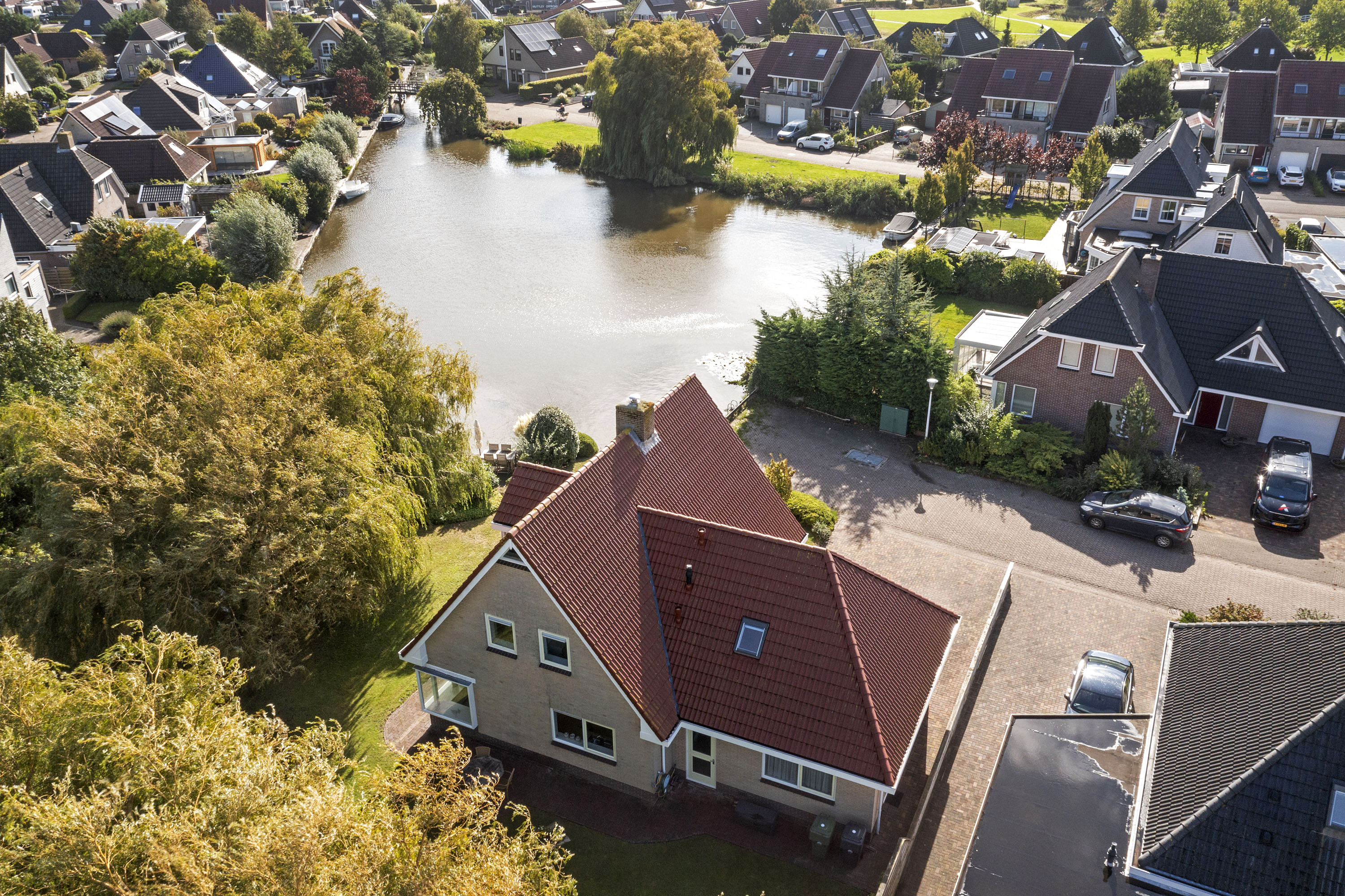 This well-maintained villa with indoor garage is situated directly on the water in one of Harlingen’s most desirable and spacious residential neighbourhoods, bordering the bird reserve *It Hegewiersterfjild*. From both the living room and kitchen, the home offers panoramic views of wide waterways and lush greenery.