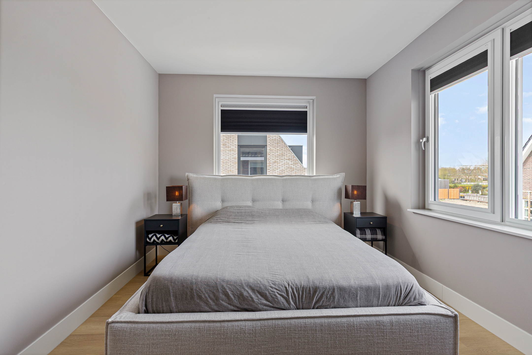 The luxury bathroom is finished in the same elegant style as the rest of the sanitary areas in the home and exudes a calm atmosphere. The bathroom includes: bathtub with panoramic countryside views, spacious walk-in shower, double vanity unit, toilet. The entire first floor is equipped with underfloor heating and the same high-quality PVC flooring in plank pattern, ensuring a consistent and tranquil interior appearance. All windows are fitted with insect screens and pleated blinds.
