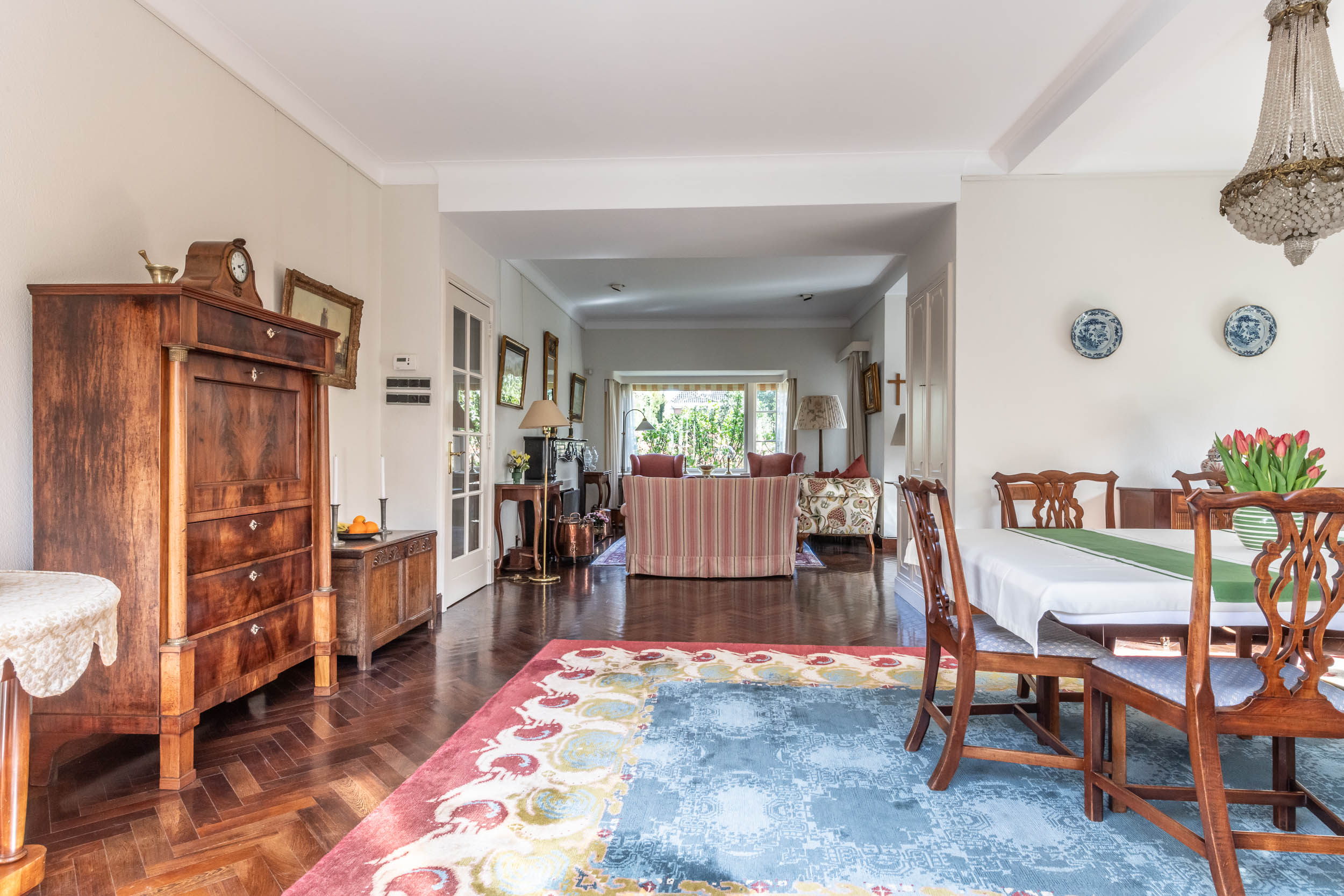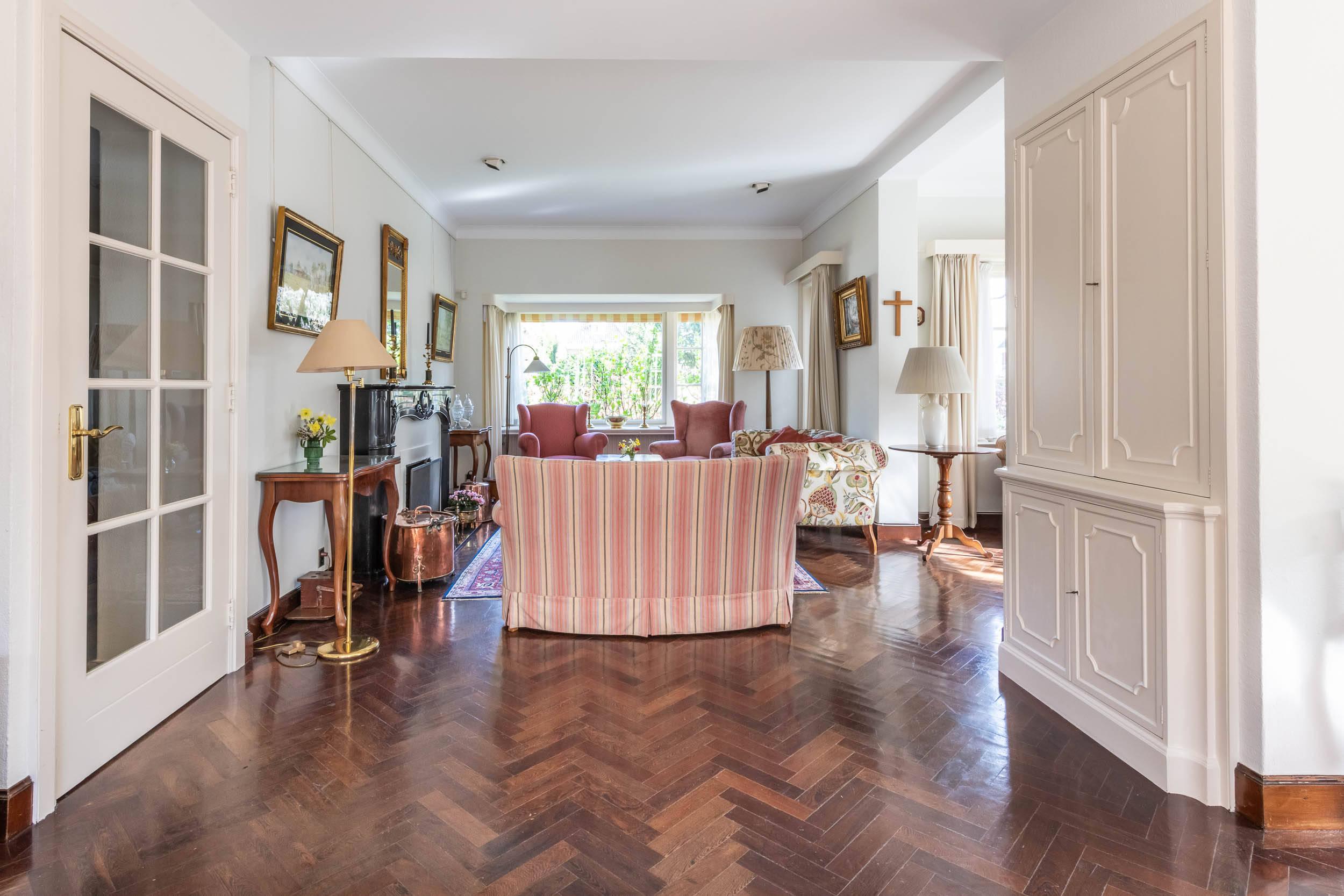 A private drive introduces the property, while the beautifully tended west-facing back garden—with sun-drenched terraces—ensures privacy and tranquility. Inside, original wenge wood flooring, a stone chimney with open fireplace, and authentic 1930s details combine with abundant natural light and generous proportions. The large, integrated studio of 17.2m² offers flexibility for work or creative pursuits, accessed through French doors from the front garden.