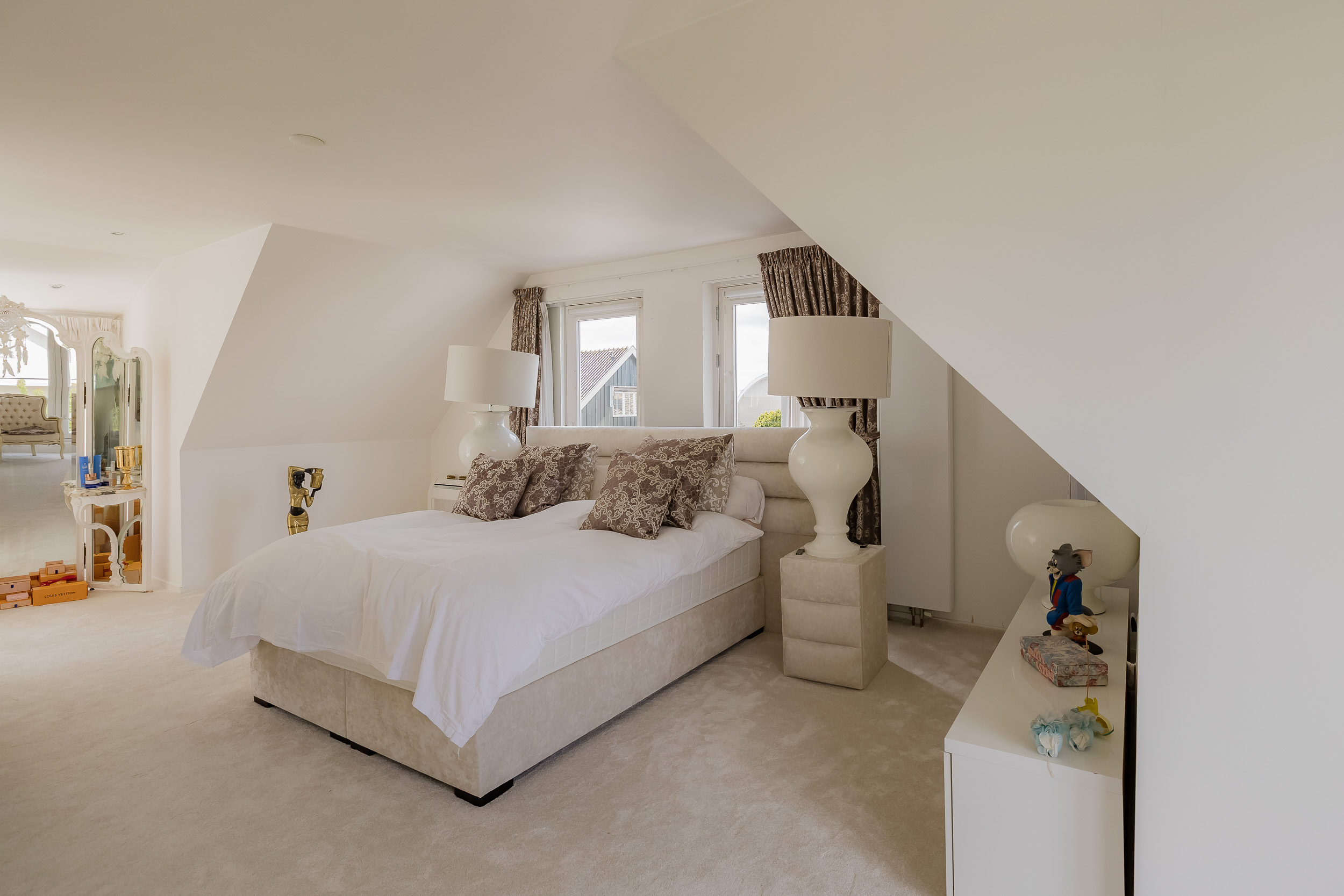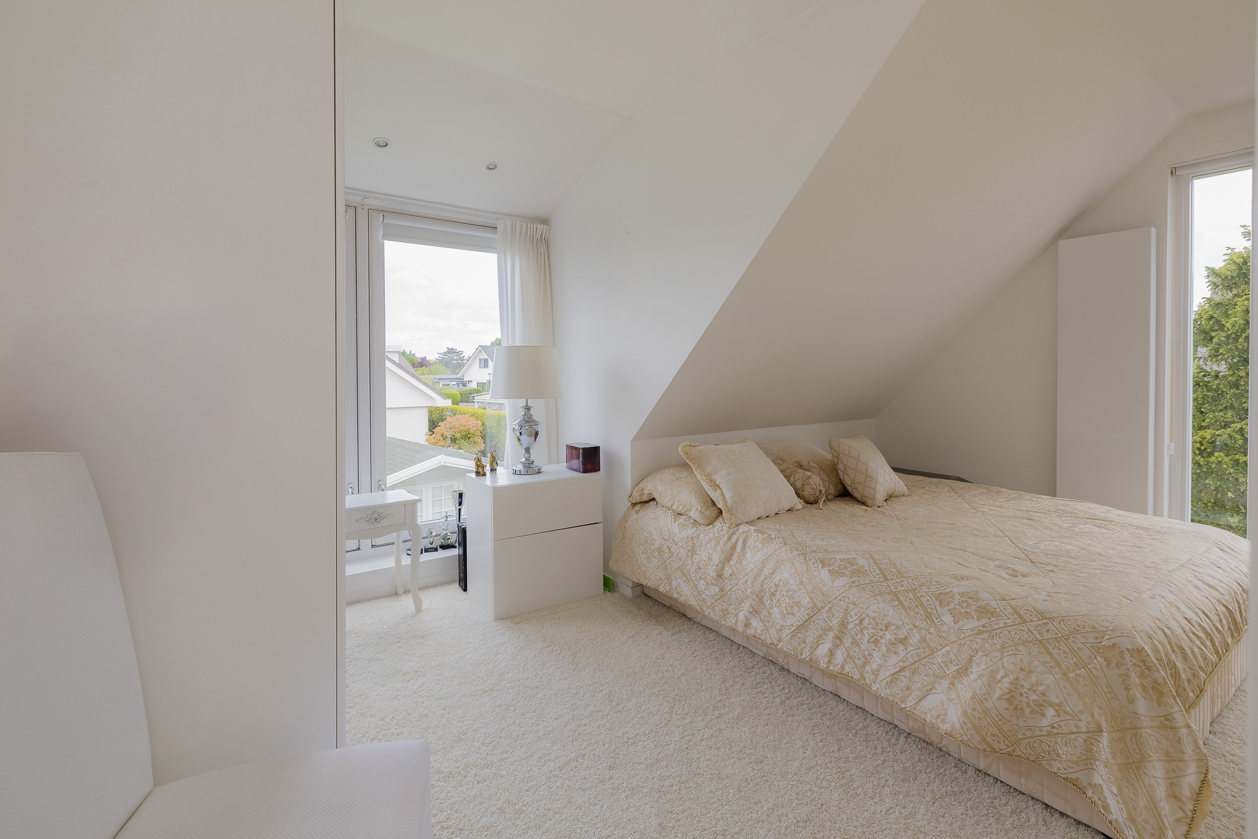 On the second floor you will find access to the attic, three spacious bedrooms and a bathroom. All rooms have a dormer window for extra headroom and a spacious feeling and the doors have a charming French balcony. The luxurious bathroom, accessible from both the master bedroom and the landing, is a place of relaxation that includes a soaking tub/jacuzzi.