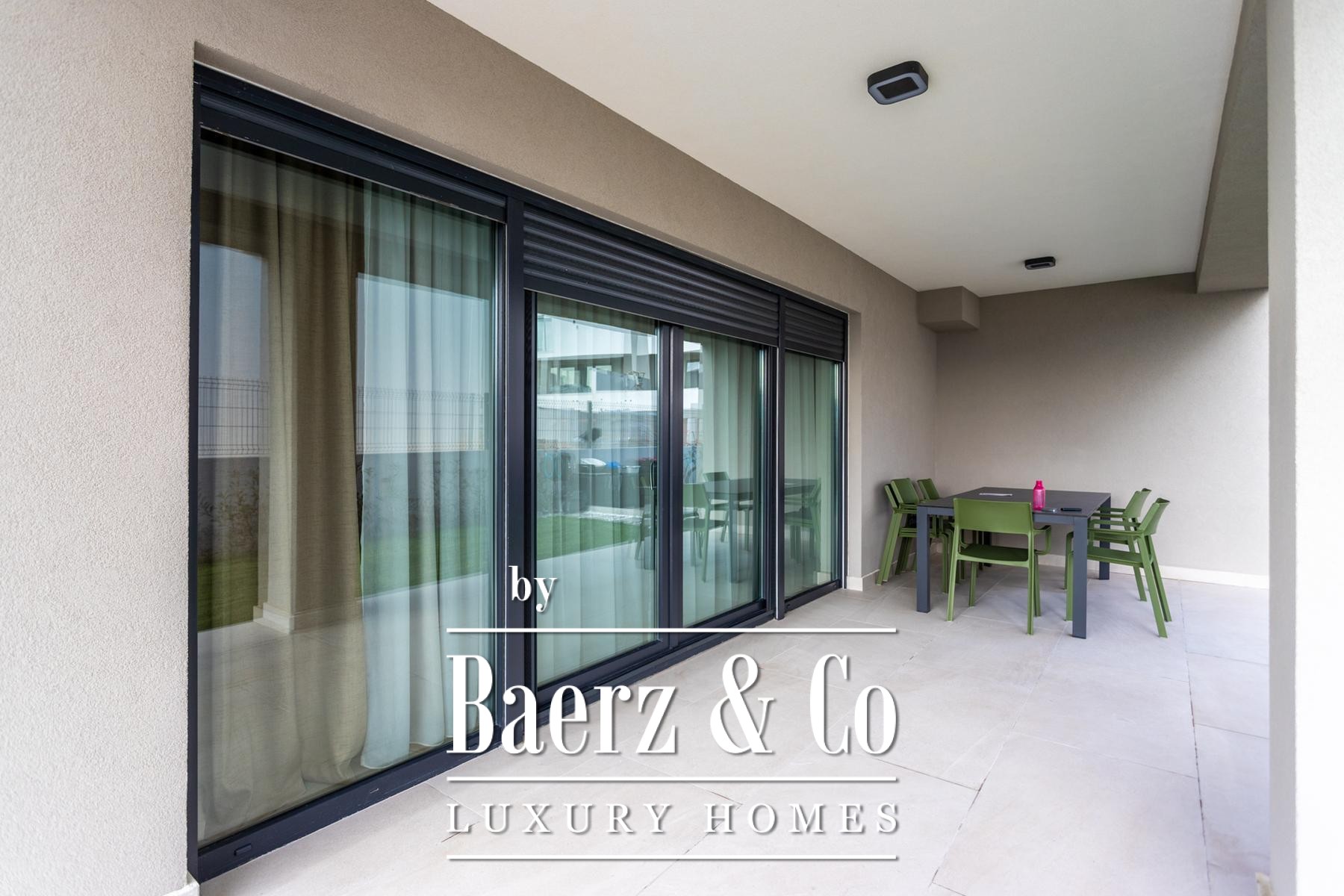 The ground floor establishes the rhythm, with an entrance hall leading to a functional sequence of rooms including a laundry, guest toilet, and storage. The heart of the home is an expansive, light-filled living area where kitchen, dining, and lounge flow as a single continuum. Full-height glass merges the interior with a generous covered terrace, sun deck, and a private swimming pool, underscoring a lifestyle attuned to the Mediterranean climate.