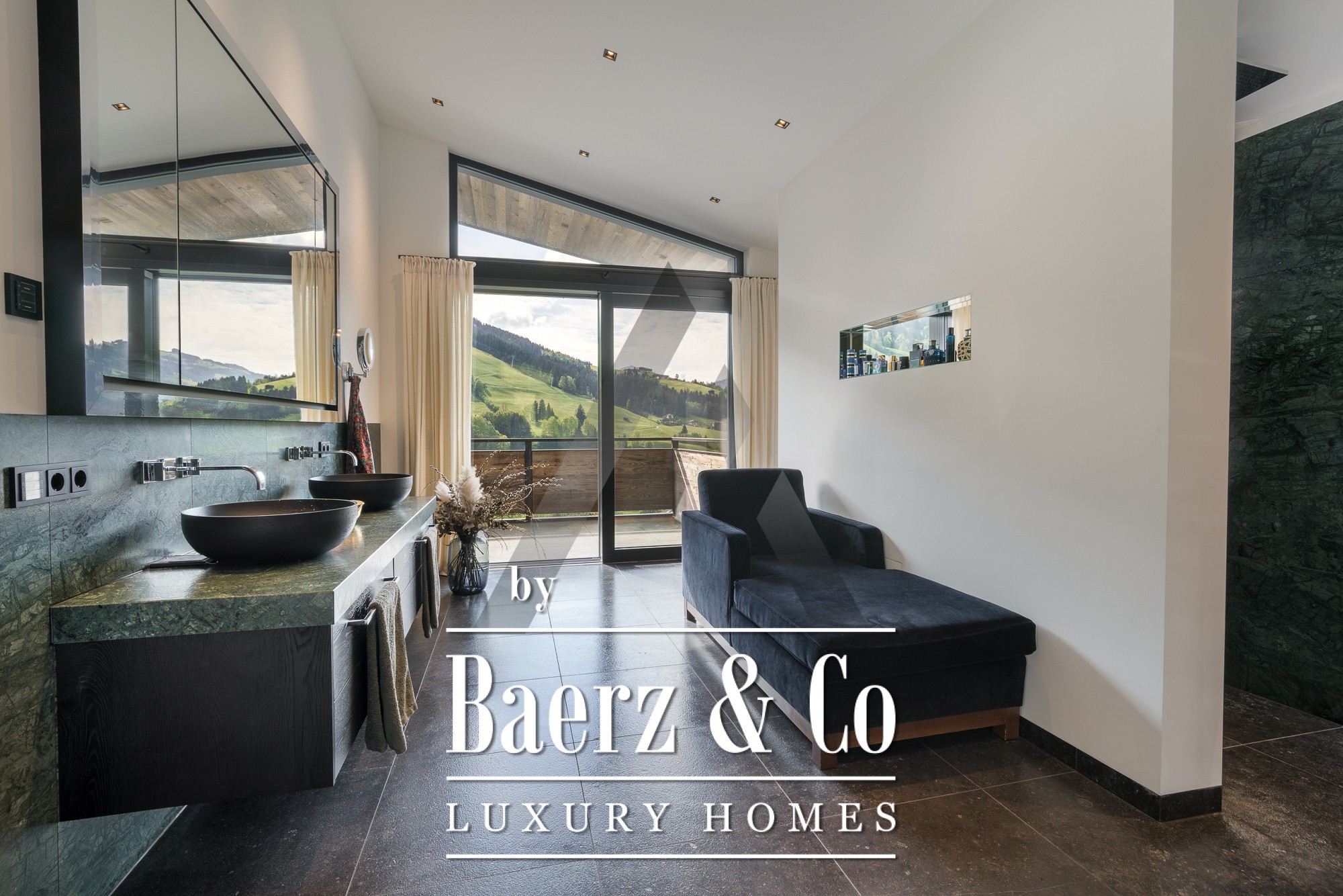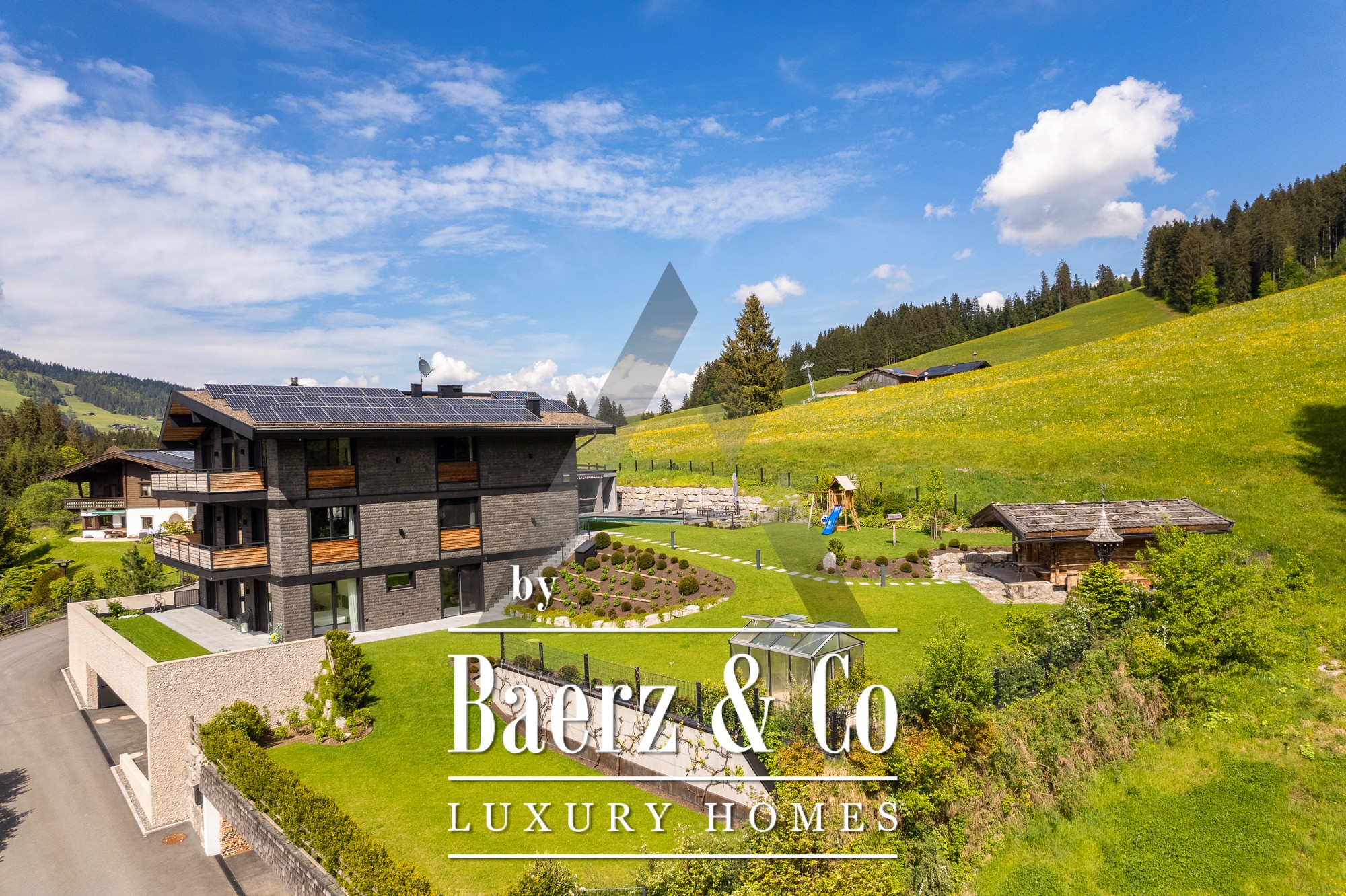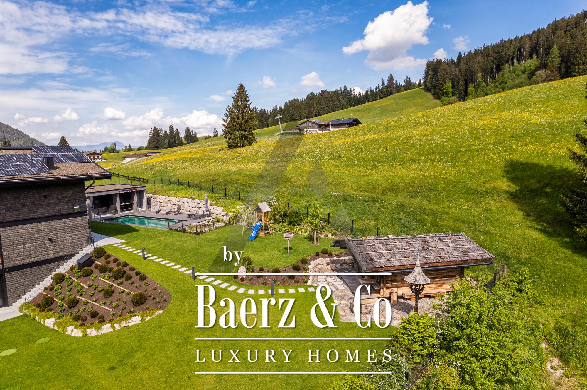 Villa Kirchberg in Tirol commands an exceptionally quiet and sunlit position on a 1,971 m² lot at the edge of the village, its boundaries opening to meadows and woodlands to the south and east. From this vantage, uninterrupted panoramas sweep from Gaisberg and Hohe Salve to Kirchberg and the Kitzbüheler Horn, capturing the rhythm of seasonal light and Alpine clarity.