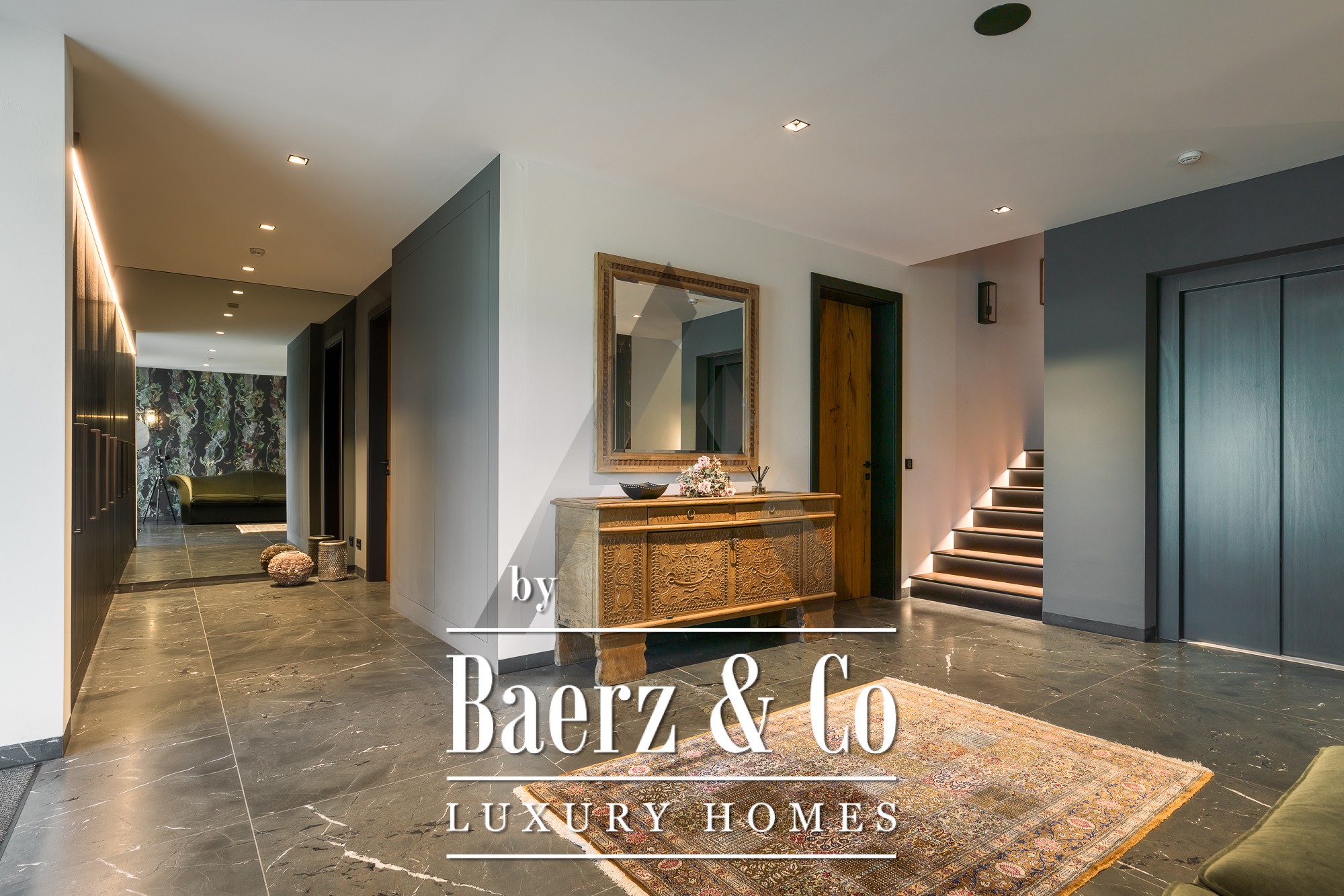 Entering on the ground floor, guests are welcomed by a generous vestibule and a refined coatroom. This level includes a separate apartment featuring a living and dining area, fully appointed kitchen, and two bedrooms, each with dressing room, en-suite bath, and direct access to the patio and garden. A secluded wellness area, with sauna and steam bath, is dedicated to relaxation and privacy.