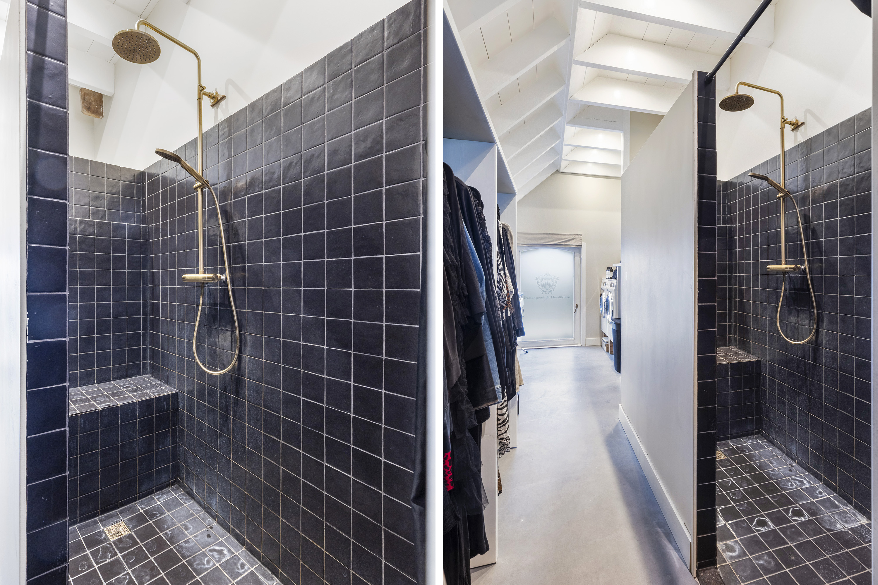 On the ground floor, there is also a generous principal bedroom with an open, loft-style layout and views over the garden. This space is connected to an en-suite dressing area and a modern bathroom, featuring a walk-in shower with dark tiling, a vanity unit, toilet and a separate, spacious utility room.