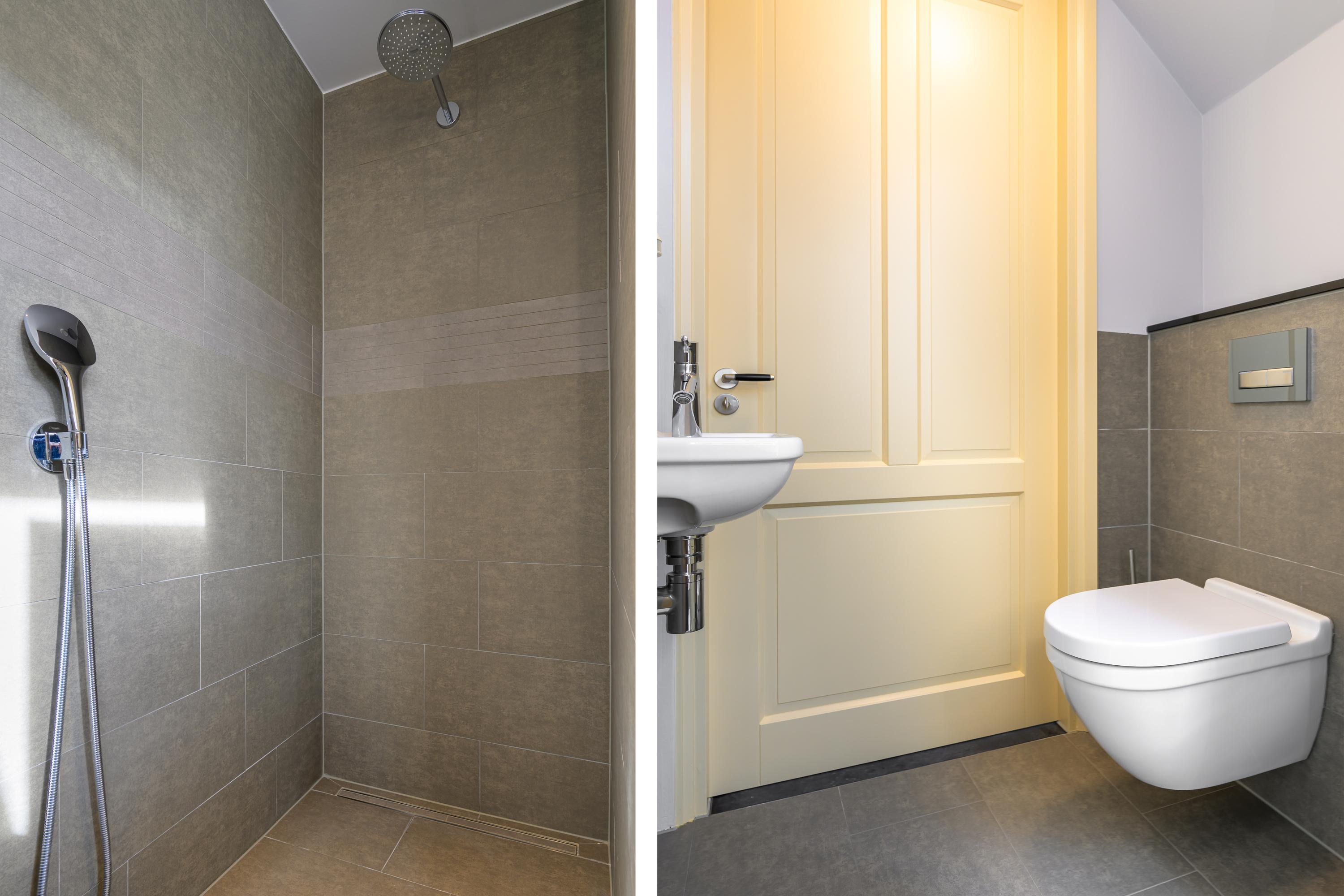 De eerste verdieping is toegankelijk via zowel de binnen- als de buitentrap. Ook hier is de ruimte verdeeld in twee delen. Het ene deel bevat een royale overloop, technische ruimte, zeer ruime slaapkamer en een bergzolder. Aan de andere kant bevindt zich een zelfstandig appartement, compleet uitgerust voor autonoom wonen. Via de buitentrap komen we binnen in een hal met toilet. Vanuit hier bereiken we de royale woon-/eetkamer. Deze is voorzien van een luxe keuken. De badkamer is uitgerust met: een wastafel, inloopdouche en witgoedaansluitingen. De slaapkamer heeft een handige schuifdeurenkast. Ook deze verdieping beschikt over vloerverwarming en profiteert van veel daglicht door de dakramen.