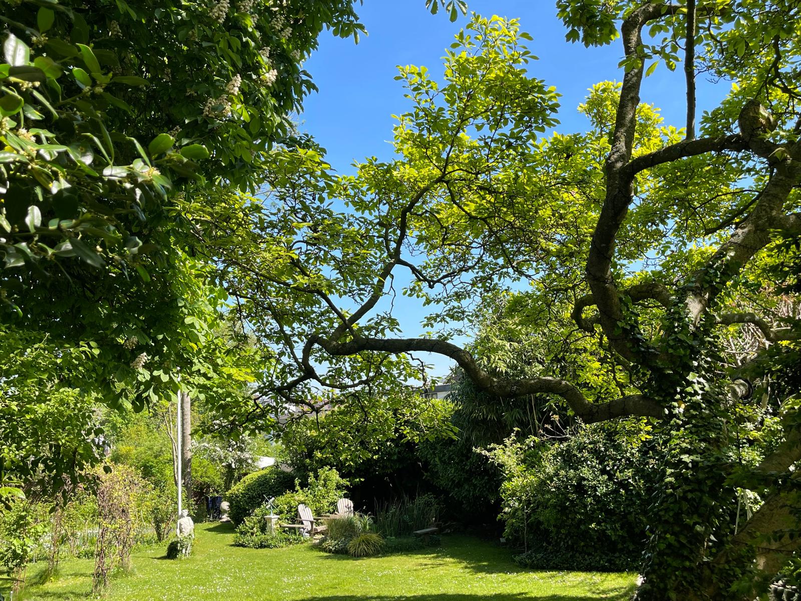 Characterful chestnut trees, winding gravel paths, a pond, and several terraces create a unique experience.