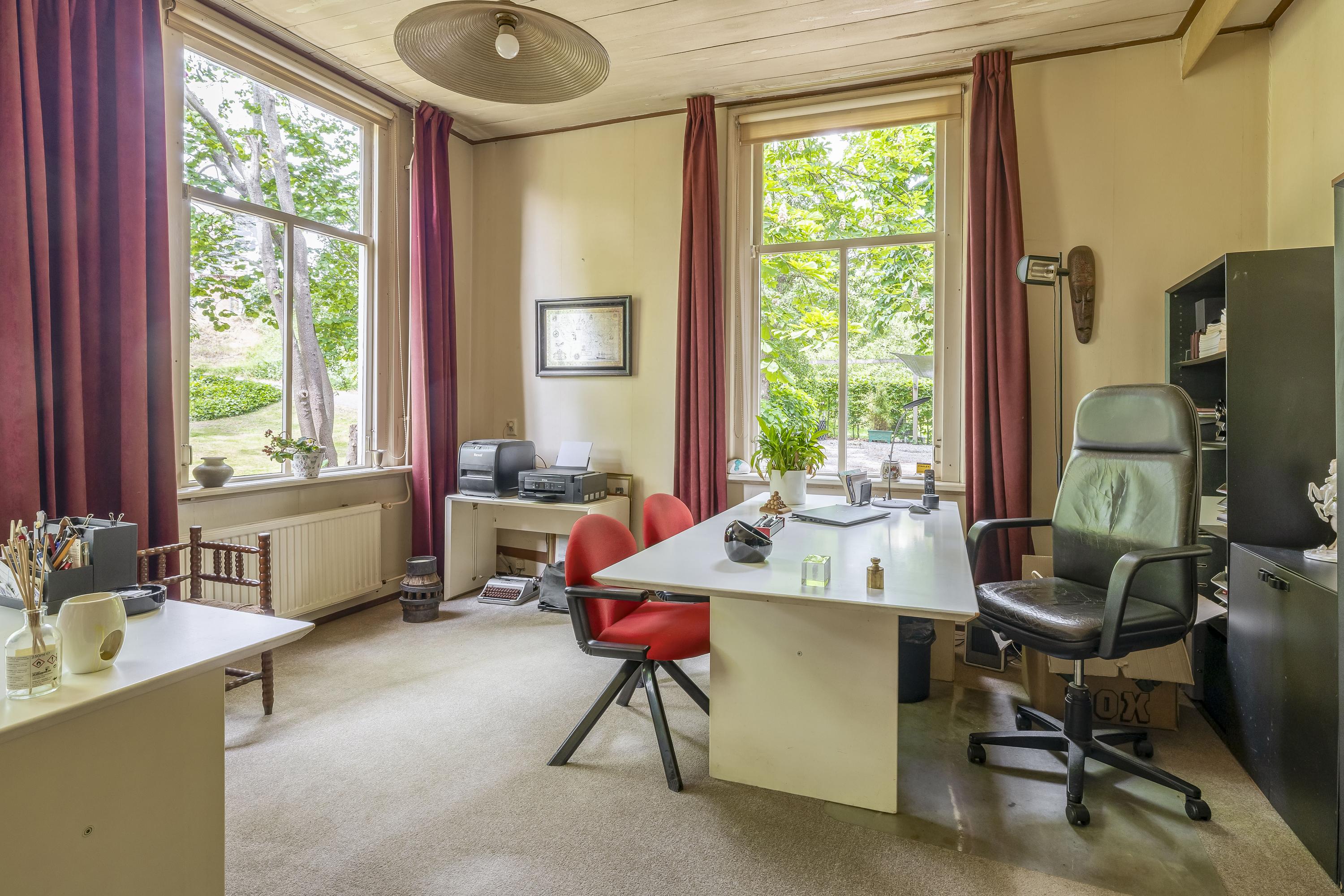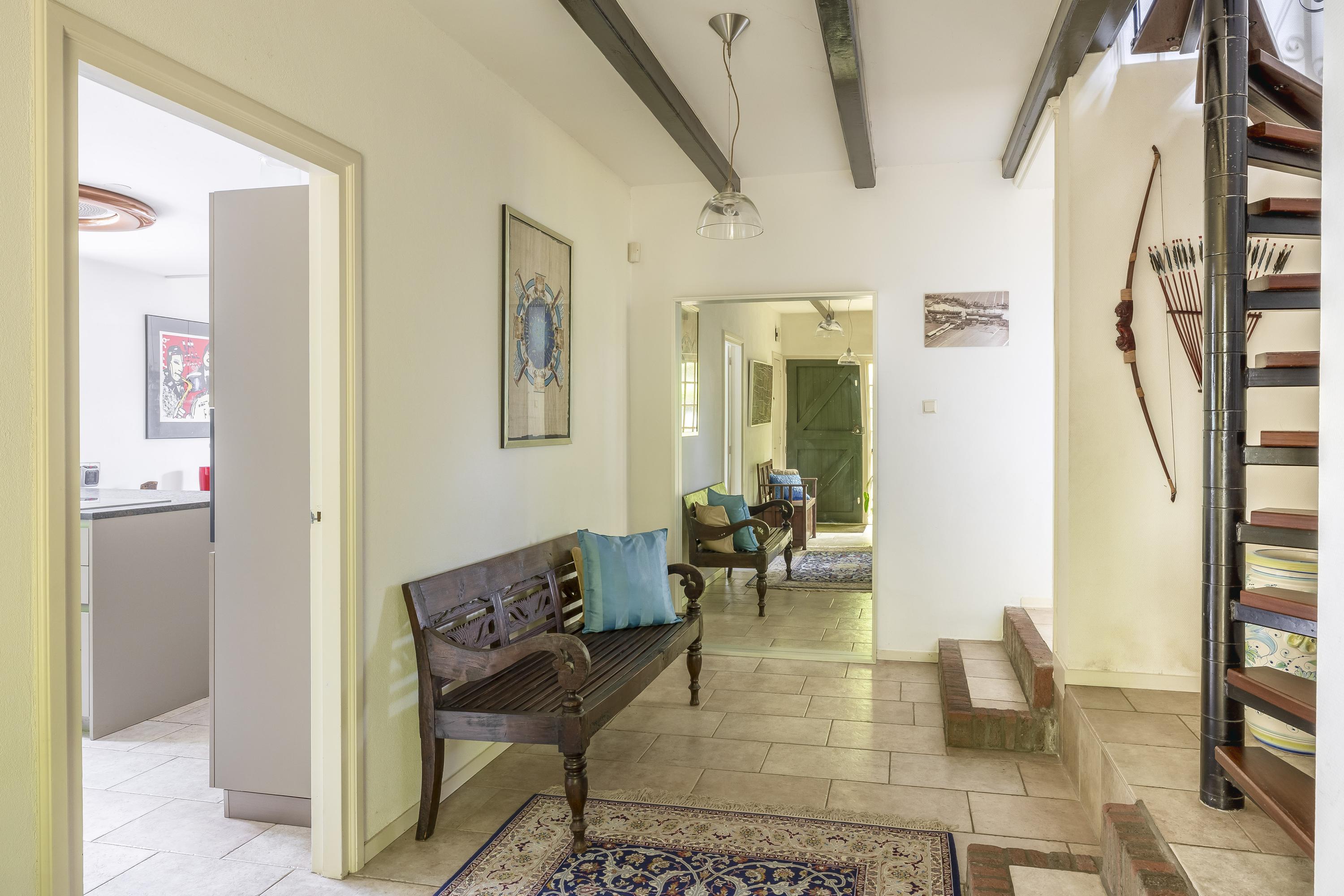 The house has a charming side entrance and an additional entrance at the front. From the hallway with cloakroom and toilet, you walk into the office—a bright and pleasant space with original sliding windows and carpeted flooring. The generous living room features a cozy open fireplace (a wood stove with a renewed flue) and seamlessly flows into the dining area, which has double French doors opening onto the sun-drenched garden.