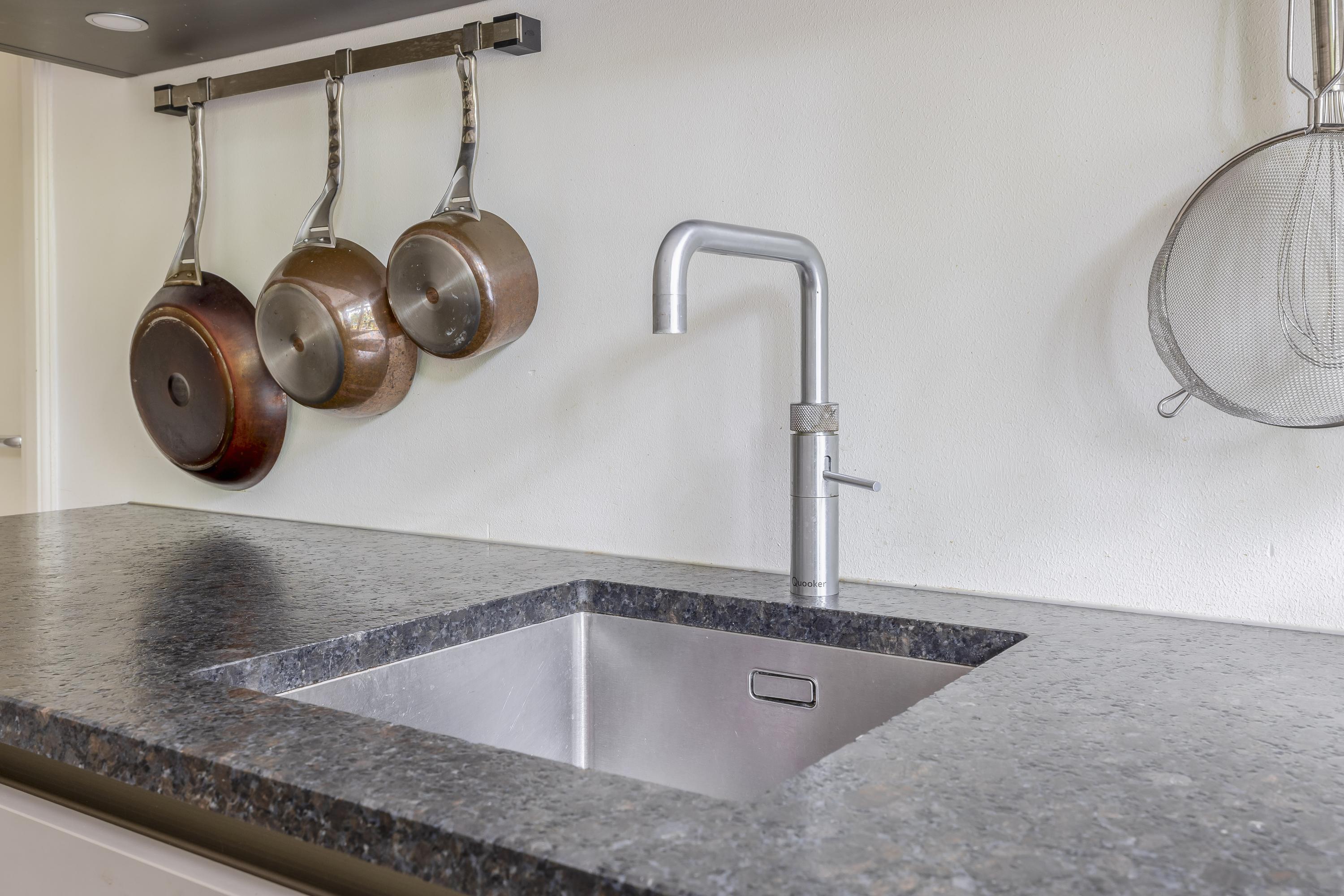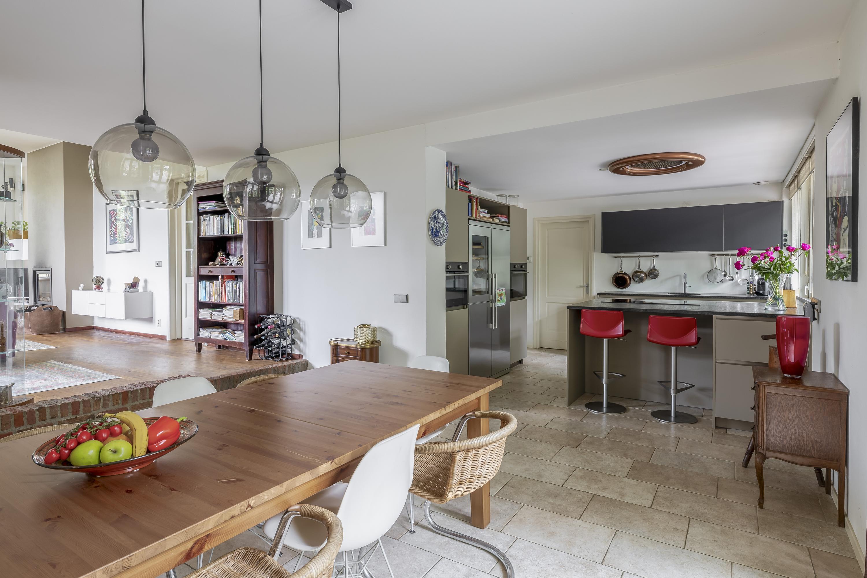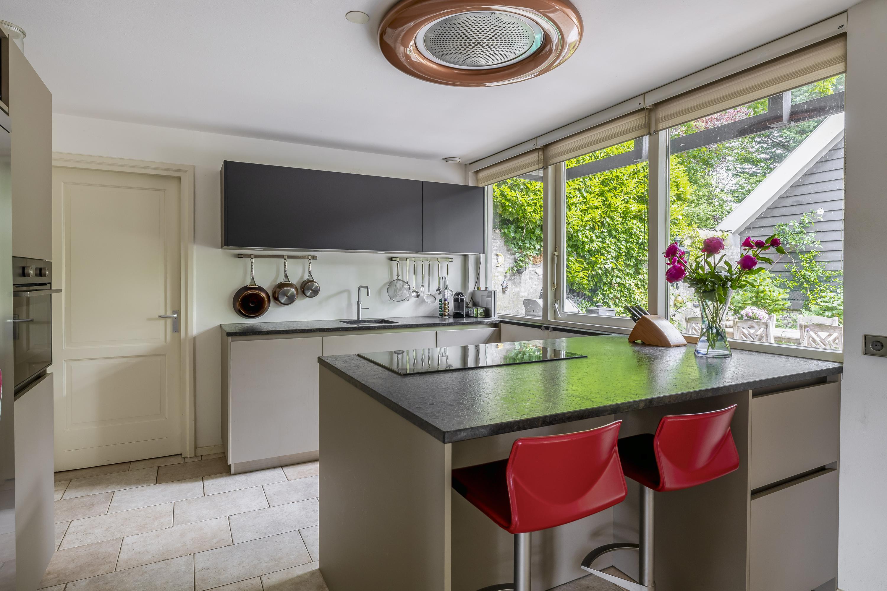 At the rear of the house lies the spacious kitchen, renovated about eight years ago. With a luxury layout and modern design—stone countertop, cooking island with induction hob and extractor, combi oven, steam oven, wine fridge, refrigerator, freezer, and dishwasher—it’s a dream for any cooking enthusiast. From the kitchen, you overlook the terrace and lush garden that surrounds the home.