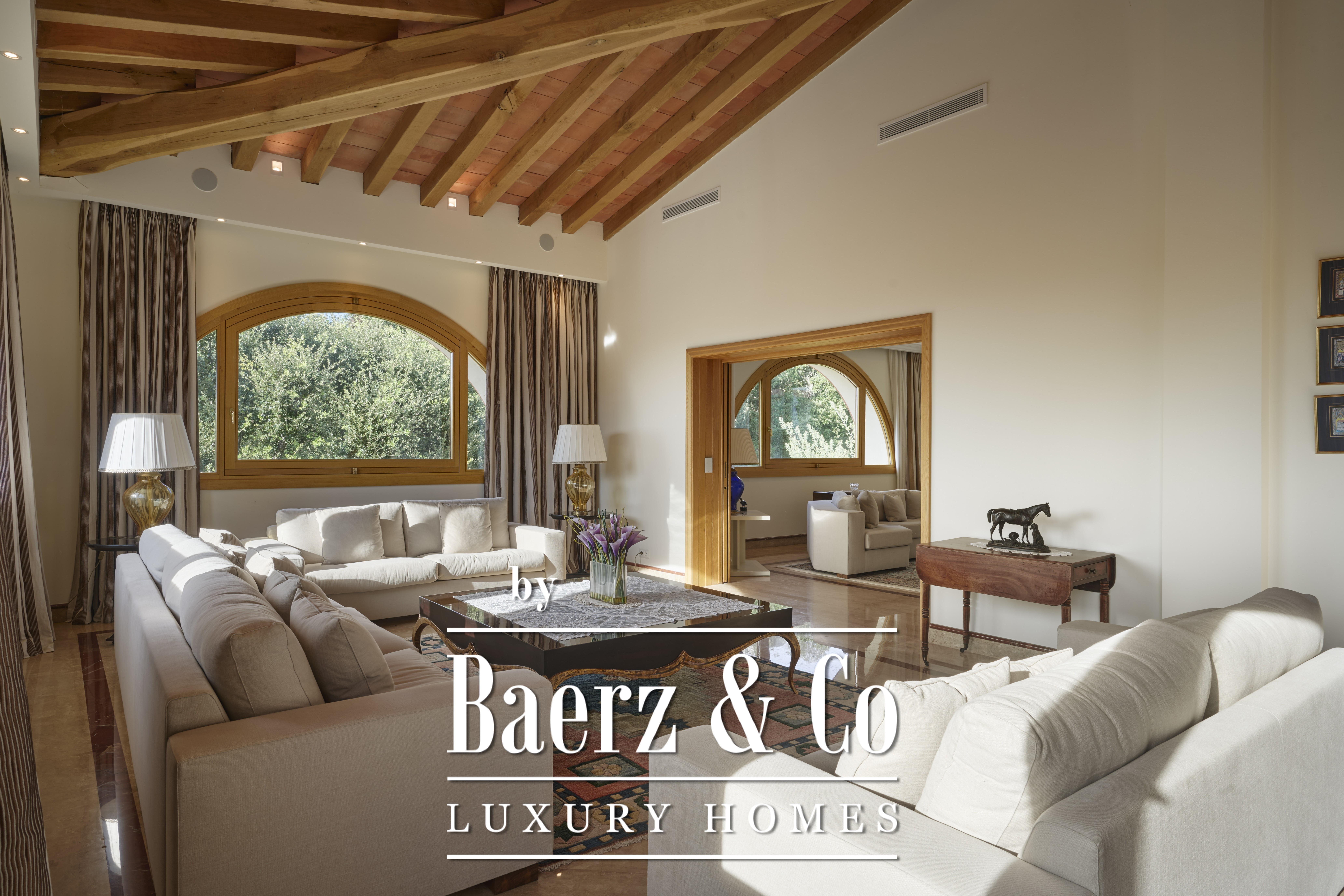 The **main residence** (616 m²) features a spectacular double-height cathedral entrance hall, a triple-aspect living room, a formal dining room, a private office, a family kitchen, four principal suites, two additional WCs, and a large laundry room.
