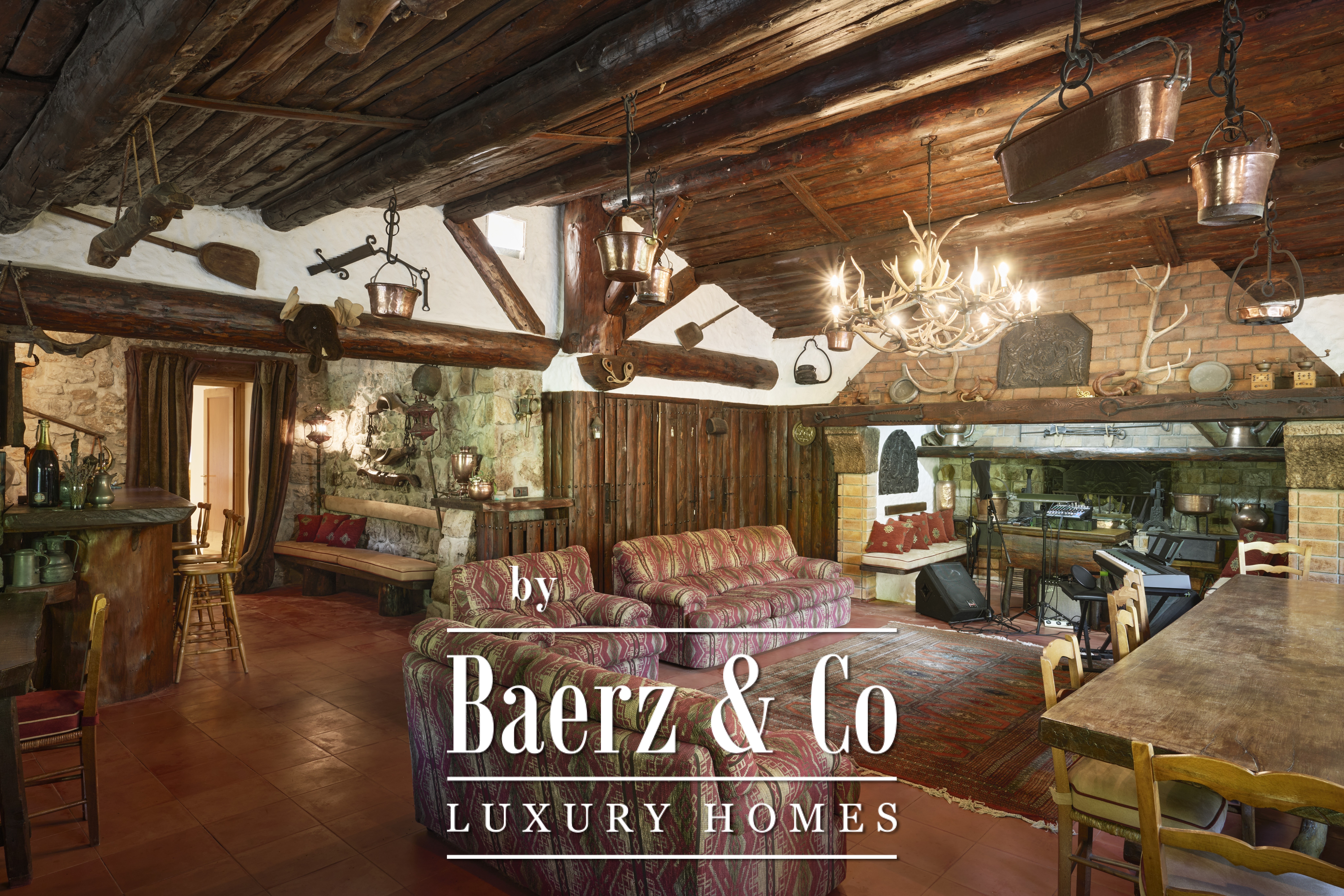 The **guest house and professional suite** (approx. 120 m²) include a self-contained studio with kitchenette, a spacious garden-level business suite with independent access, and a traditional “hunting pavilion” with a large bar and fireplace.