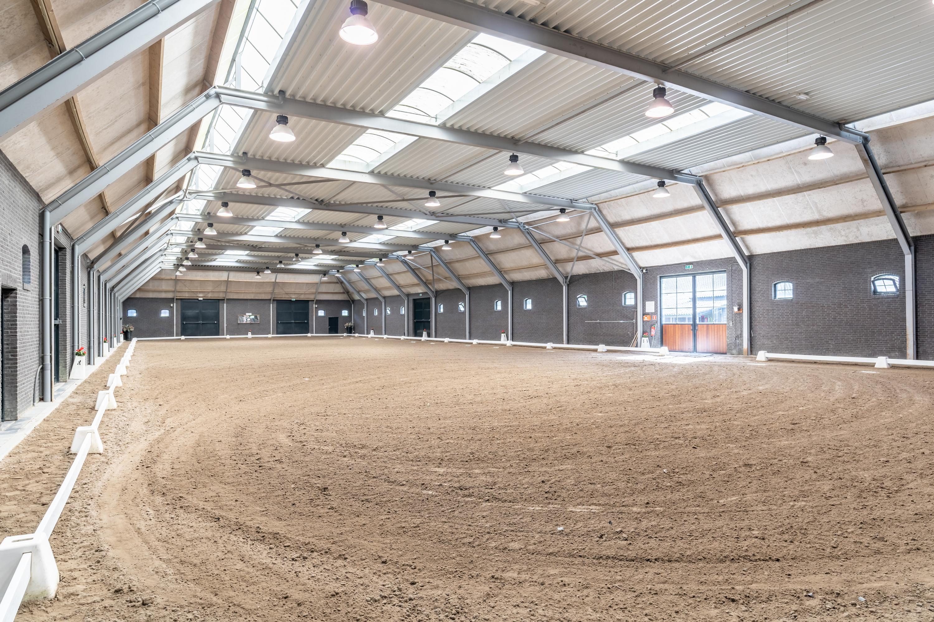The detached riding hall is constructed of masonry facades with steel trusses. The roof of the fully insulated hall is covered with tiles. Various doors in the front, side and rear façades provide access to the yard from the indoor arena. Various windows and skylights in the roof provide plenty of natural light. LED lighting is also available. The riding hall is also equipped with mirrored walls.