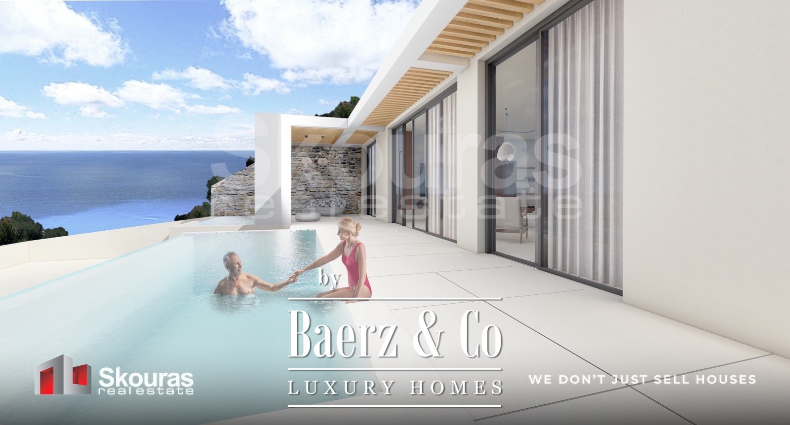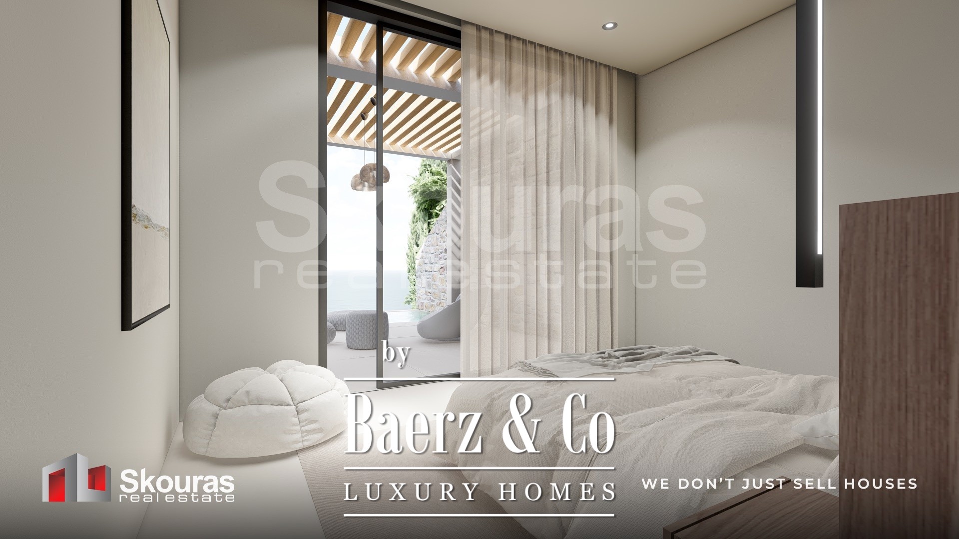 The villa features three generously proportioned bedrooms, each with its own en-suite bathroom and walk-in closet, ensuring both autonomy and refinement for residents and guests. Expansive glazing defines the open-plan living area, drawing in sea views and natural light, while the modern kitchen and dedicated wine cellar create a setting attuned to quiet luxury. Smart home technology elevates the experience of daily living.