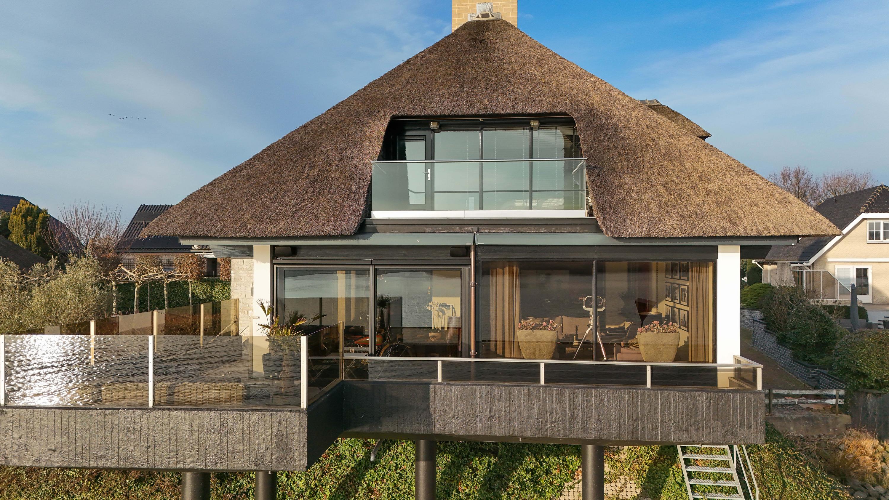 De Werf 5 in Lekkerkerk is a home for people who know what they want. Peace, space, water at your feet and comfort at a high level. This thatched villa is located in a truly rare spot, directly on the river Lek, with its own private jetty and boat lift. Here, you can step straight from your garden onto the boat and sail towards the Biesbosch, Dordrecht or Rotterdam. The view over the water never gets old and changes every moment of the day. This is living with allure, freedom and privacy.