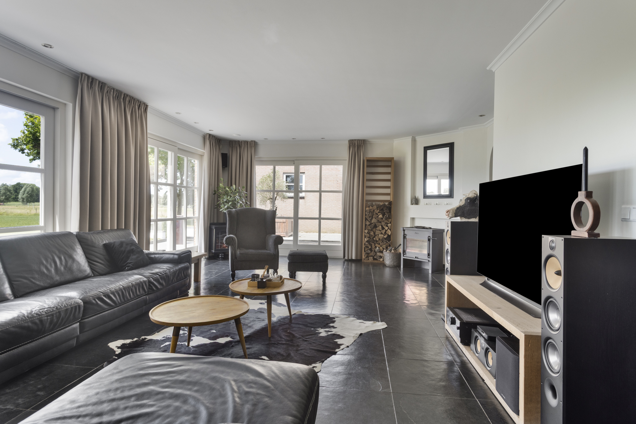 woonkamer (ca. 75 m² incl. keuken en werkhoek) voorzien van een drietal schuifpuien, houthaard en een werk-/leeshoek met inbouwkastenwand, wandafwerking stucwerk, natuurstenen vloer, plafond afgewerkt met stucwerk vv. inbouwspots;