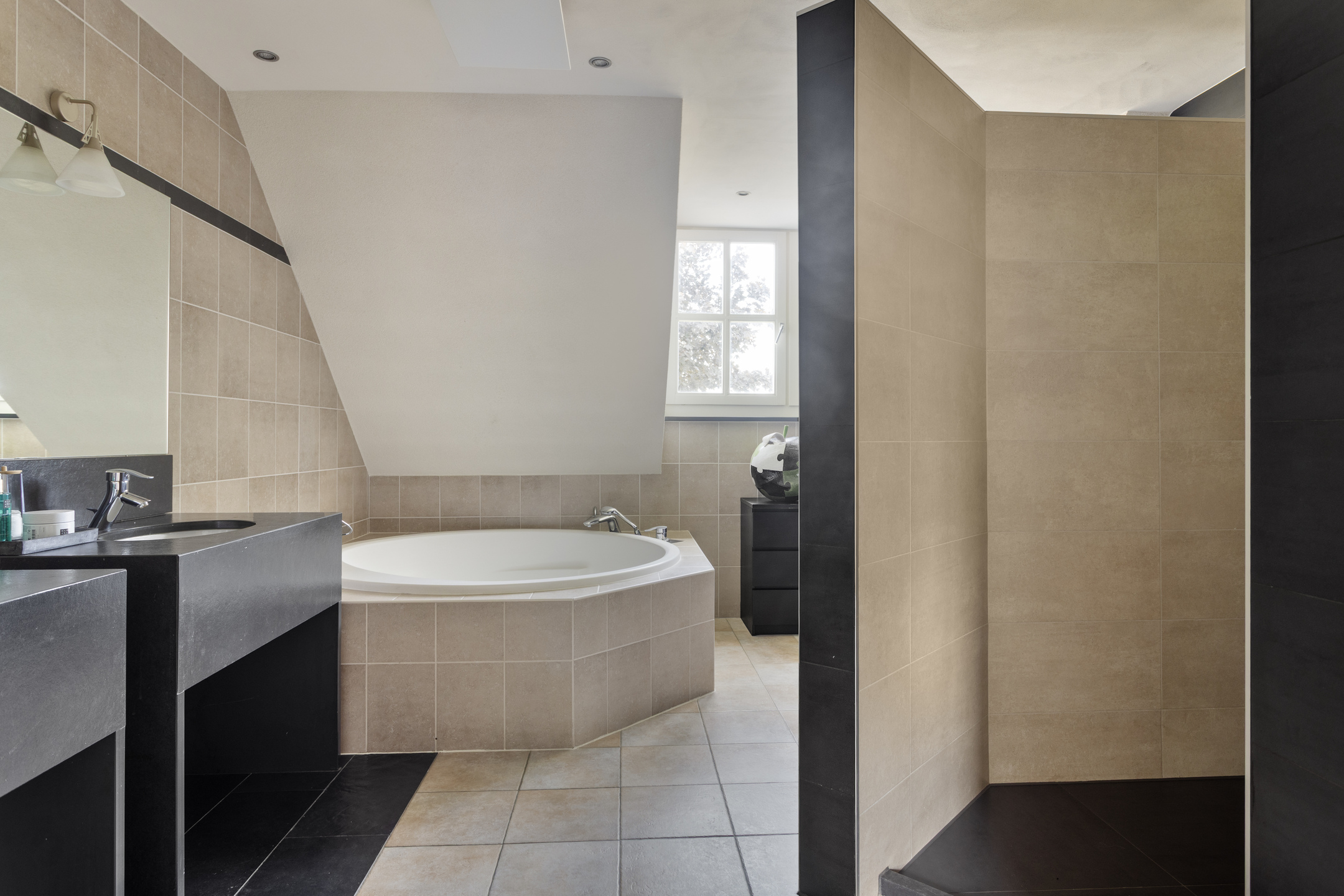 royale badkamer voorzien van een 2-persoonsligbad, inloopdouche, infraroodpaneel, badkamermeubel met dubbele wastafel, elektrische designradiator, dakkapel en vloerverwarming;