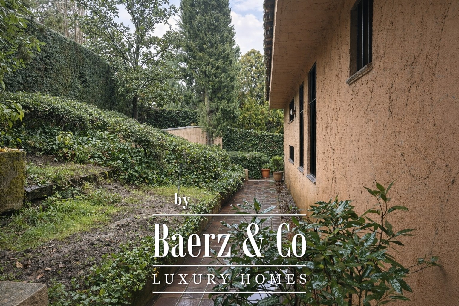 Six bedrooms are arranged throughout, complemented by multiple reception rooms and generous ceiling heights, establishing a subtle rhythm between openness and privacy. The upper level houses a dedicated master suite, emphasizing discretion and exclusivity. The lower level supports a garage, storage, and various multifunctional spaces, presenting an appealing canvas for personalisation or modernisation.
