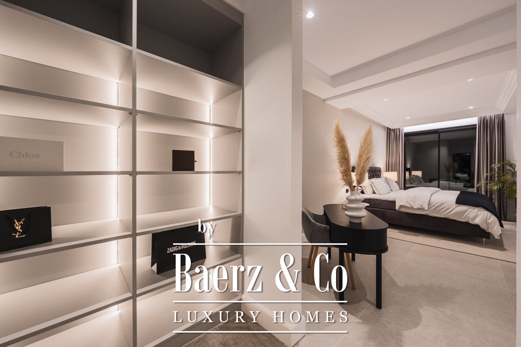 On the first floor, the en-suite master bedroom offers a serene retreat with a private bathroom, featuring a freestanding bathtub positioned to capture the views, access to the large terrace, and an expansive walk-in closet. Two additional en-suite bedrooms on this floor ensure comfort and privacy for all family members.
