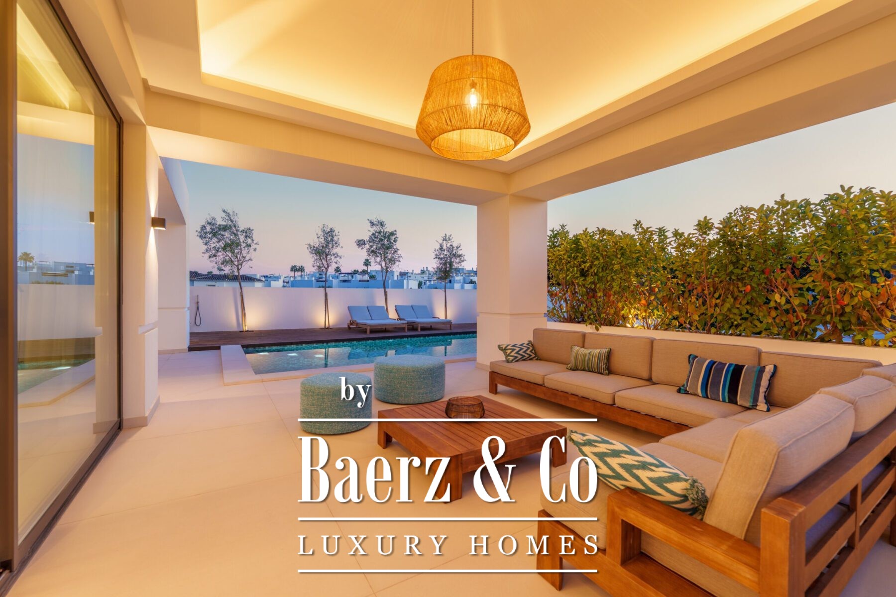 This contemporary villa in the sought-after neighborhood of San Pedro de Alcántara combines sleek architecture with luxurious amenities. Set behind clean white walls and landscaped greenery, the property offers a private oasis with a sparkling pool bordered by a stylish wooden deck and an expansive covered terrace for dining and lounging. Generous outdoor spaces, including a rooftop solarium, create the perfect setting for relaxation and entertaining.