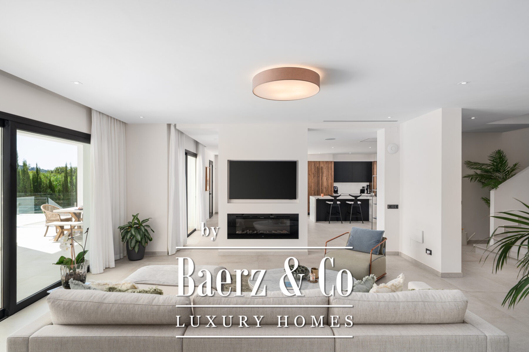 The residence’s architecture balances contemporary clarity with warmth, employing ceramic stone and wood finishes to create a poised atmosphere. Miele appliances, solar panels, electric blinds, and an advanced irrigation system speak to its sustainable detailing. Terraces open from all bedrooms and main spaces, leading to a covered swimming pool, outdoor barbecue area, and sauna, while panoramic golf course and Mediterranean Sea views act as a constant aesthetic backdrop.