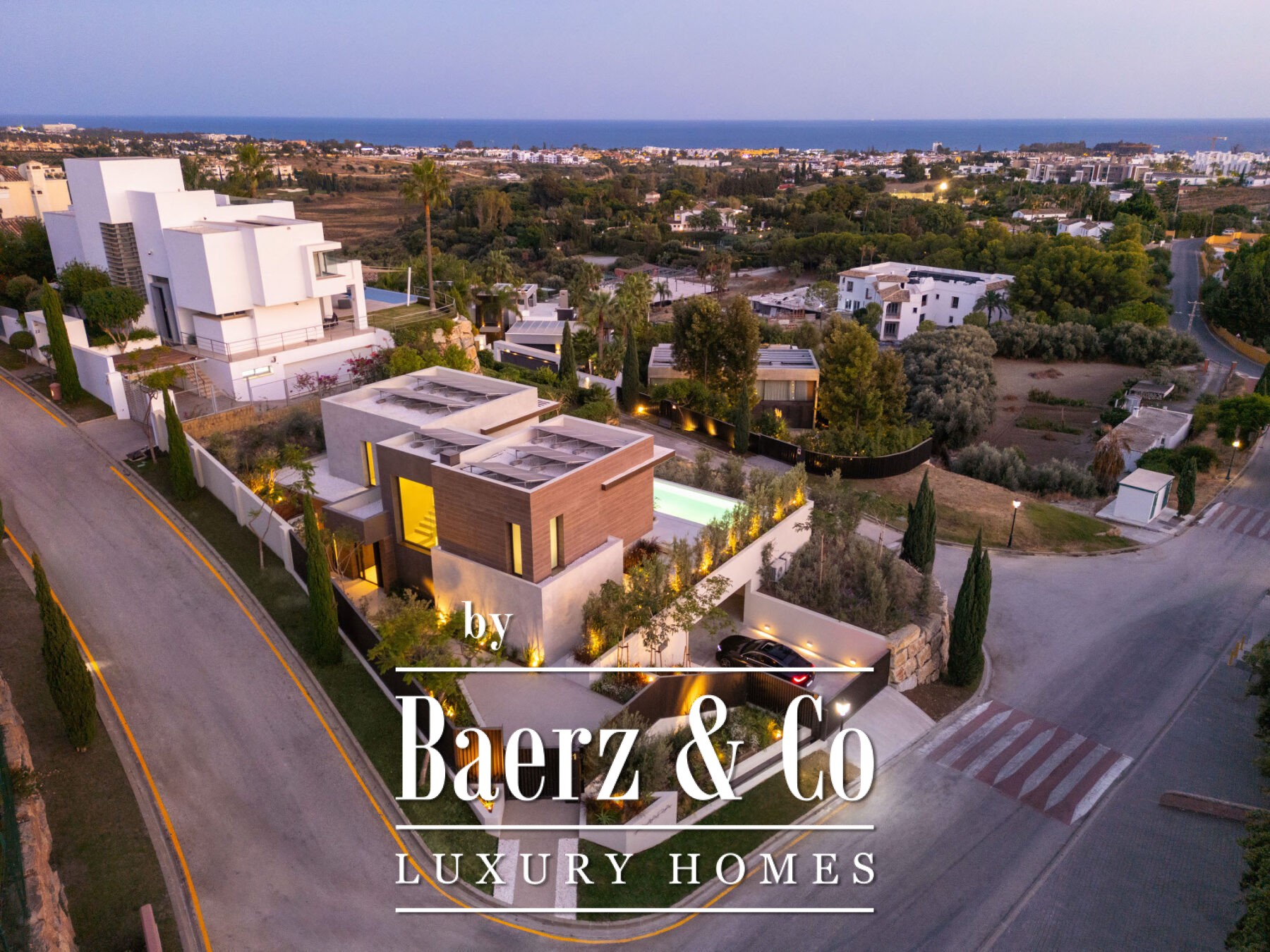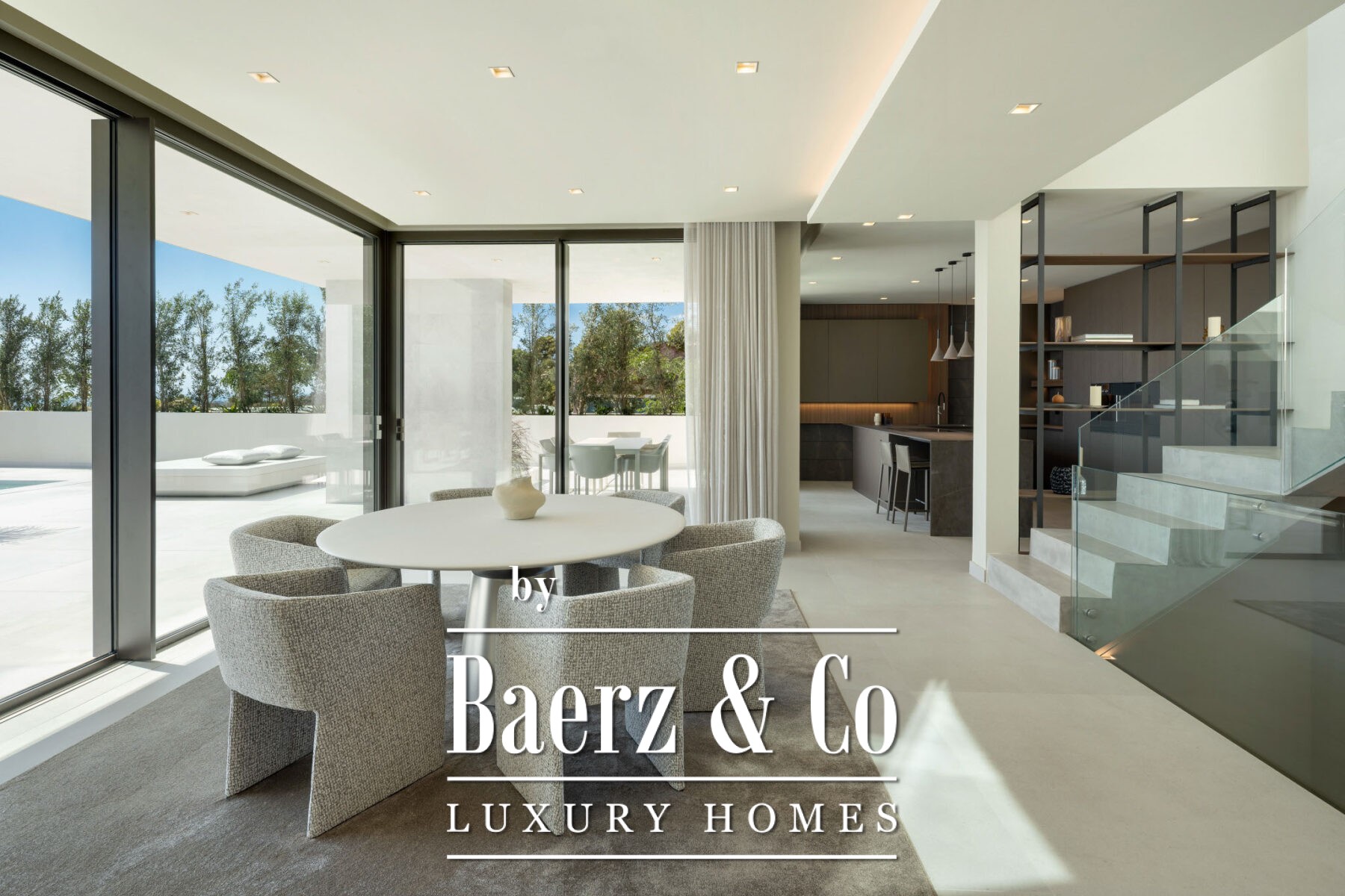 Villa Marbella in Los Flamingos is an architectural sanctuary set within a coveted gated community, embracing 540 m² of refined living space on a 1,330 m² plot. This villa Marbella in Los Flamingos welcomes you with five spacious bedrooms and five bathrooms, balancing sophisticated comfort with a sense of ease. Clean modern lines echo throughout, from the Modulnova kitchen to the polished concrete staircase and expansive Schüco windows, opening interiors to the Andalusian light.