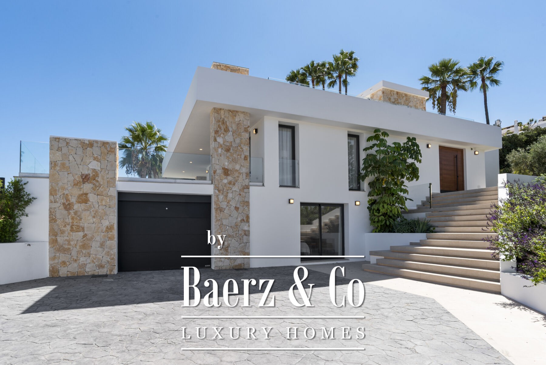 On the rooftop terrace, panoramic views of the sea and mountains invite moments of quiet reflection. Built-in wardrobes include LED illumination, combining practicality with subtle sophistication. The villa offers a garage for one car with a charging point, and additional enclosed parking for up to three further vehicles within the gate.