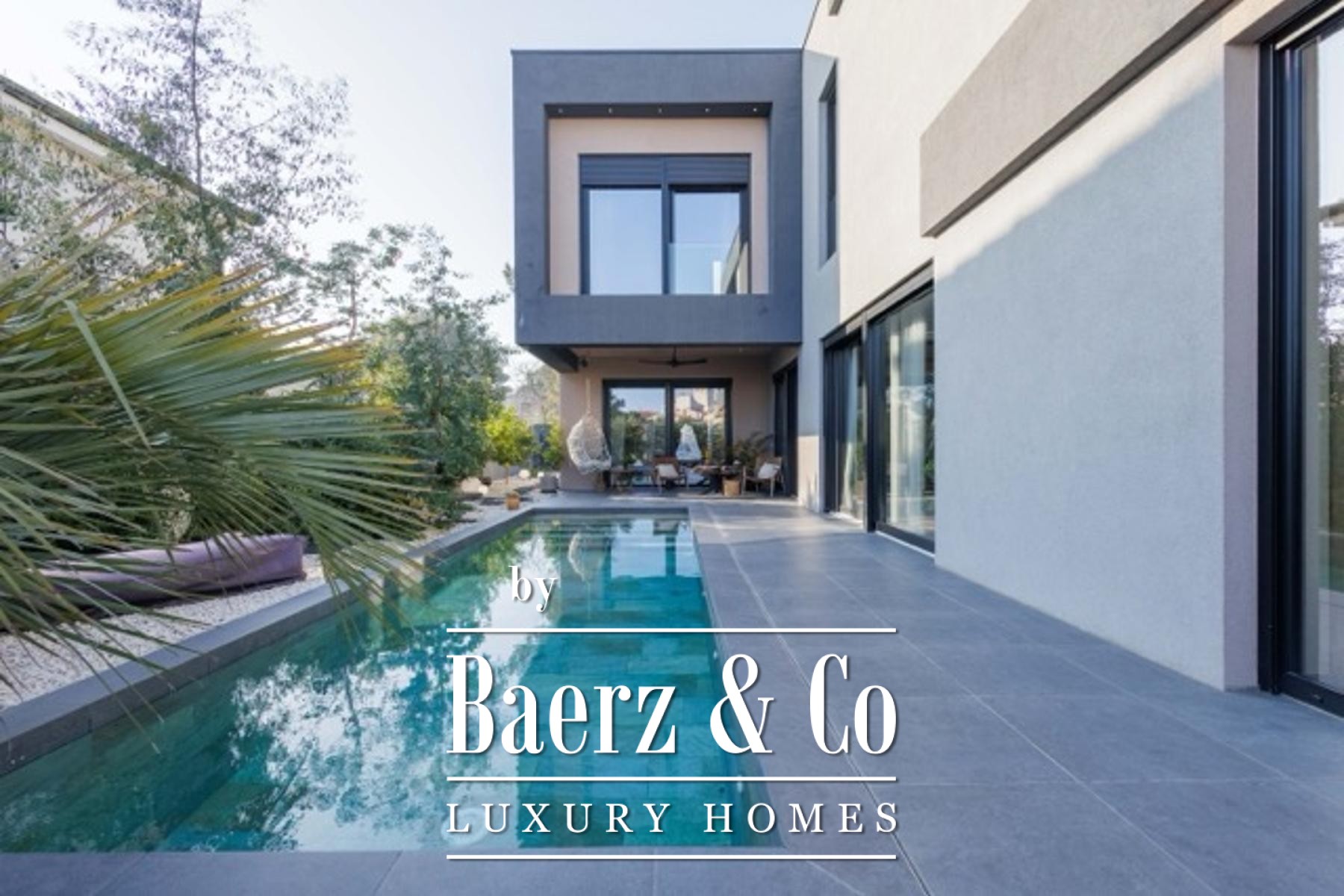 On the ground floor, an expansive living room anchors the home, featuring bespoke furnishings sourced from Germany, Italy, and the Czech Republic. The interplay of soft color palettes, a statement fireplace, and generous glazing blurs indoor and outdoor life, opening to the private pool and surrounding terrace. Adjoining rooms include a thoughtfully equipped kitchen, a guest bedroom, a toilet, additional service spaces, and direct garden access.