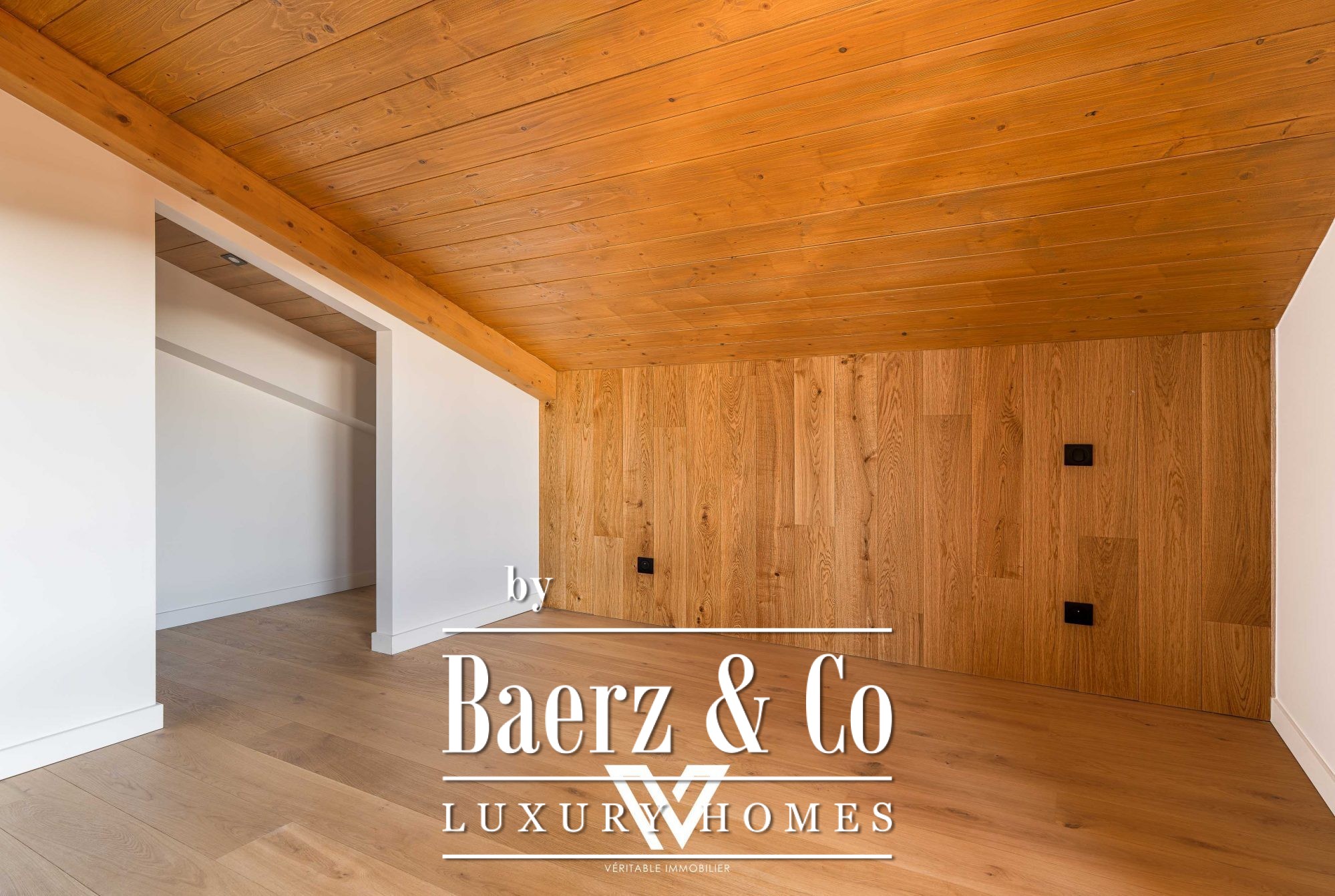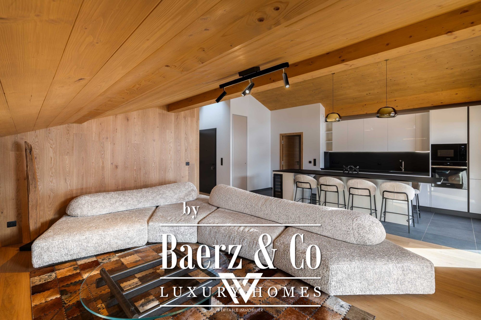 A cathedral-style living room of over 40 m² anchors the apartment, defined by its generous volume and thoughtful materials. Solid oak parquet underfoot and refined wood finishes set a tone of enduring quality, complemented by a fully equipped open kitchen. The living area flows seamlessly onto a spacious south-west-facing balcony, inviting you to linger over sweeping alpine vistas.