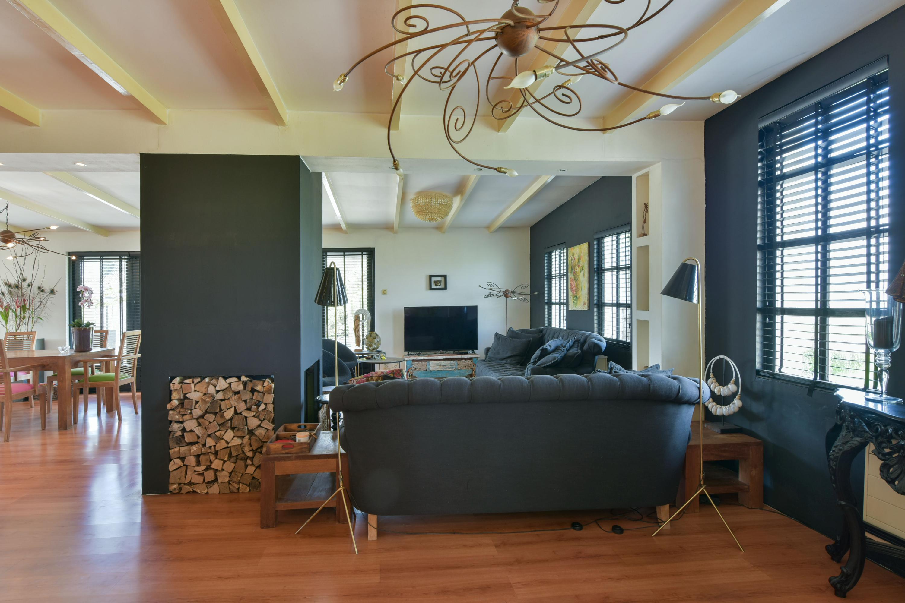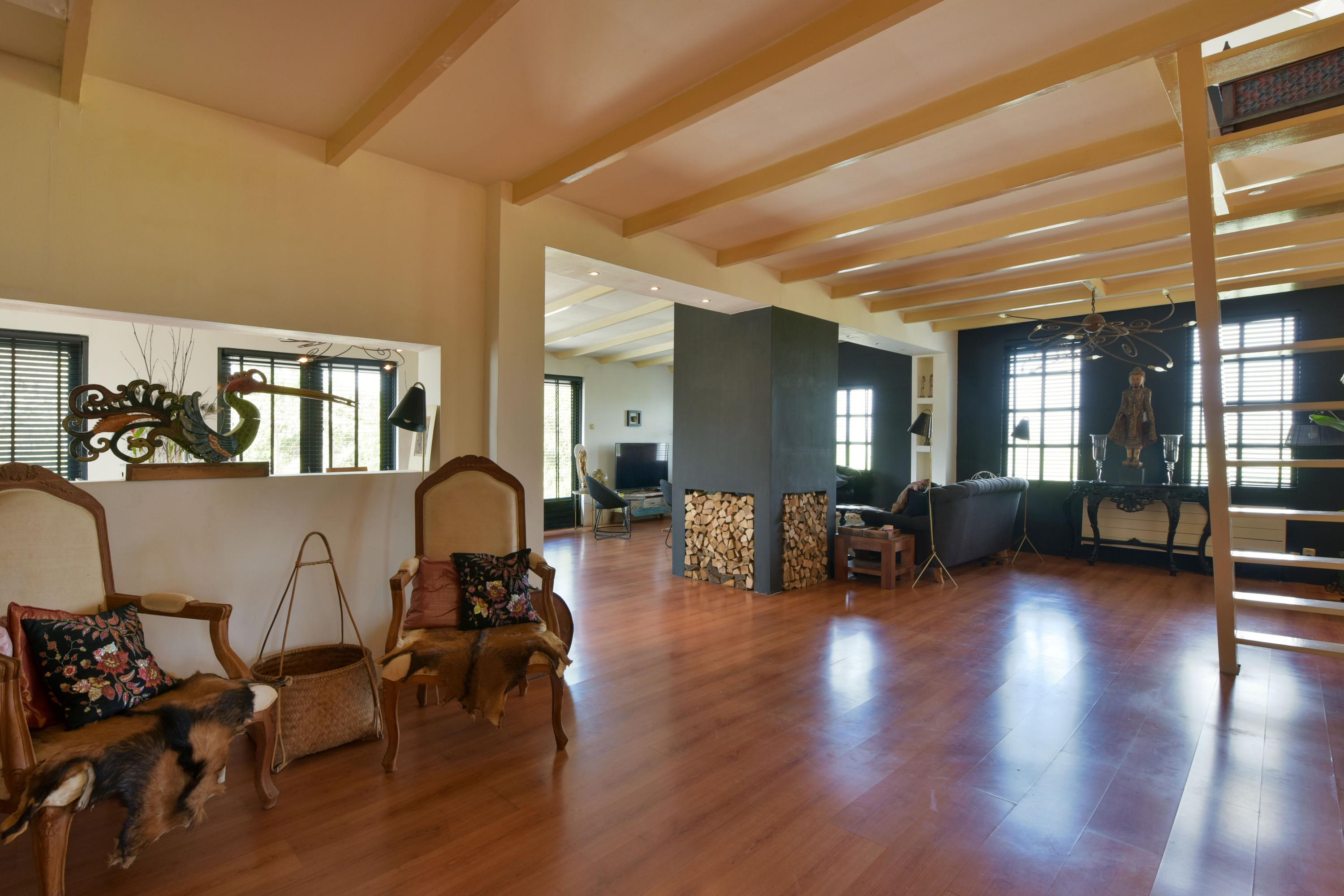 The large fireplace with wood-burning stove forms the warm heart of the space, while the wooden ceiling beams add to the charming, country-style atmosphere. In addition, a separate corner has been created, currently set up as a home office—ideal for working from home or as a quiet reading or hobby space.