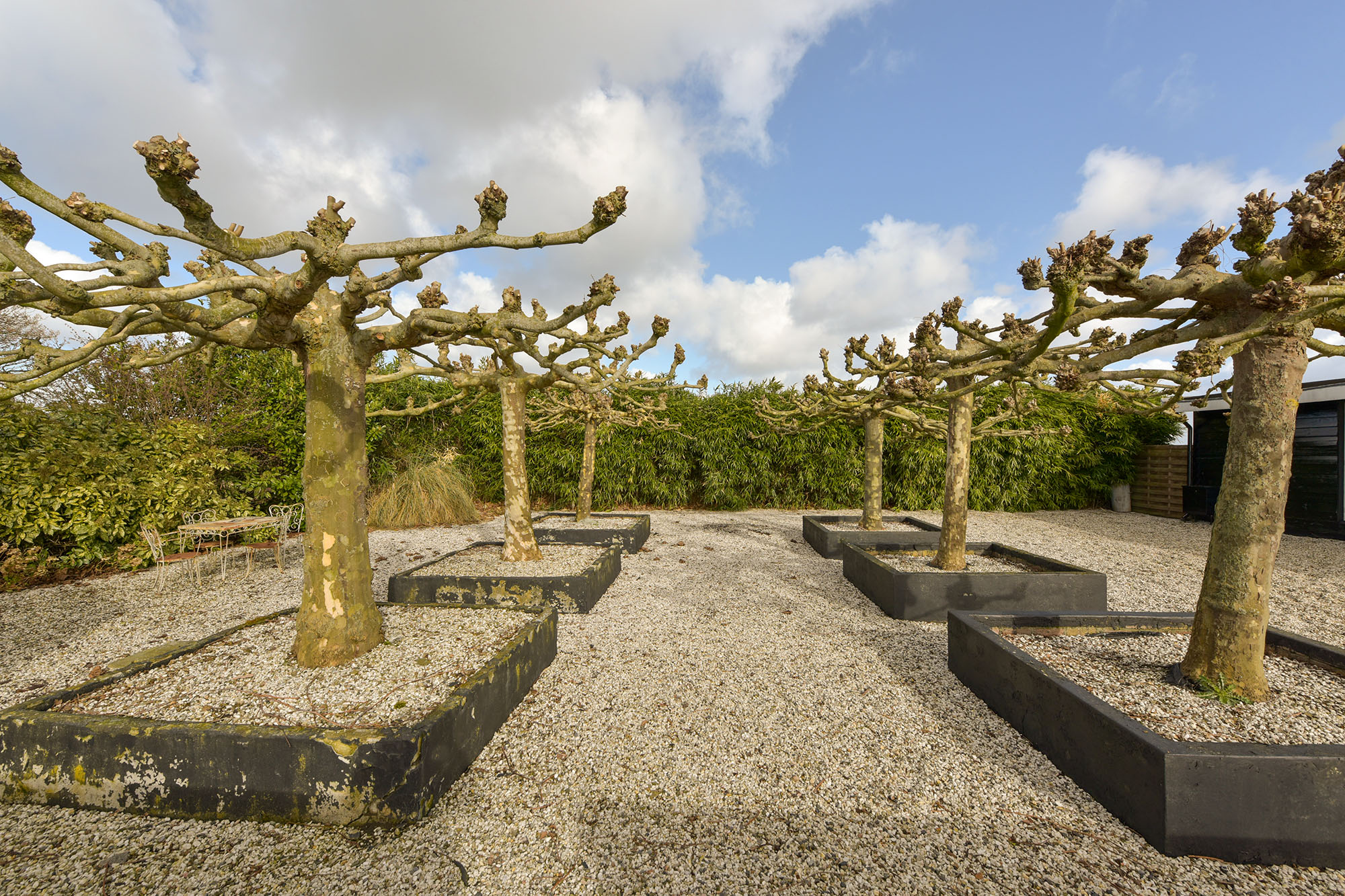 The garden surrounding the home is well maintained and offers ample space to enjoy outdoor living. With a playful layout of gravel, lawn, and terrace, there is always a spot to be found in the sun or shade. The large plane trees provide cooling on warm days and give the garden a distinctive character.
