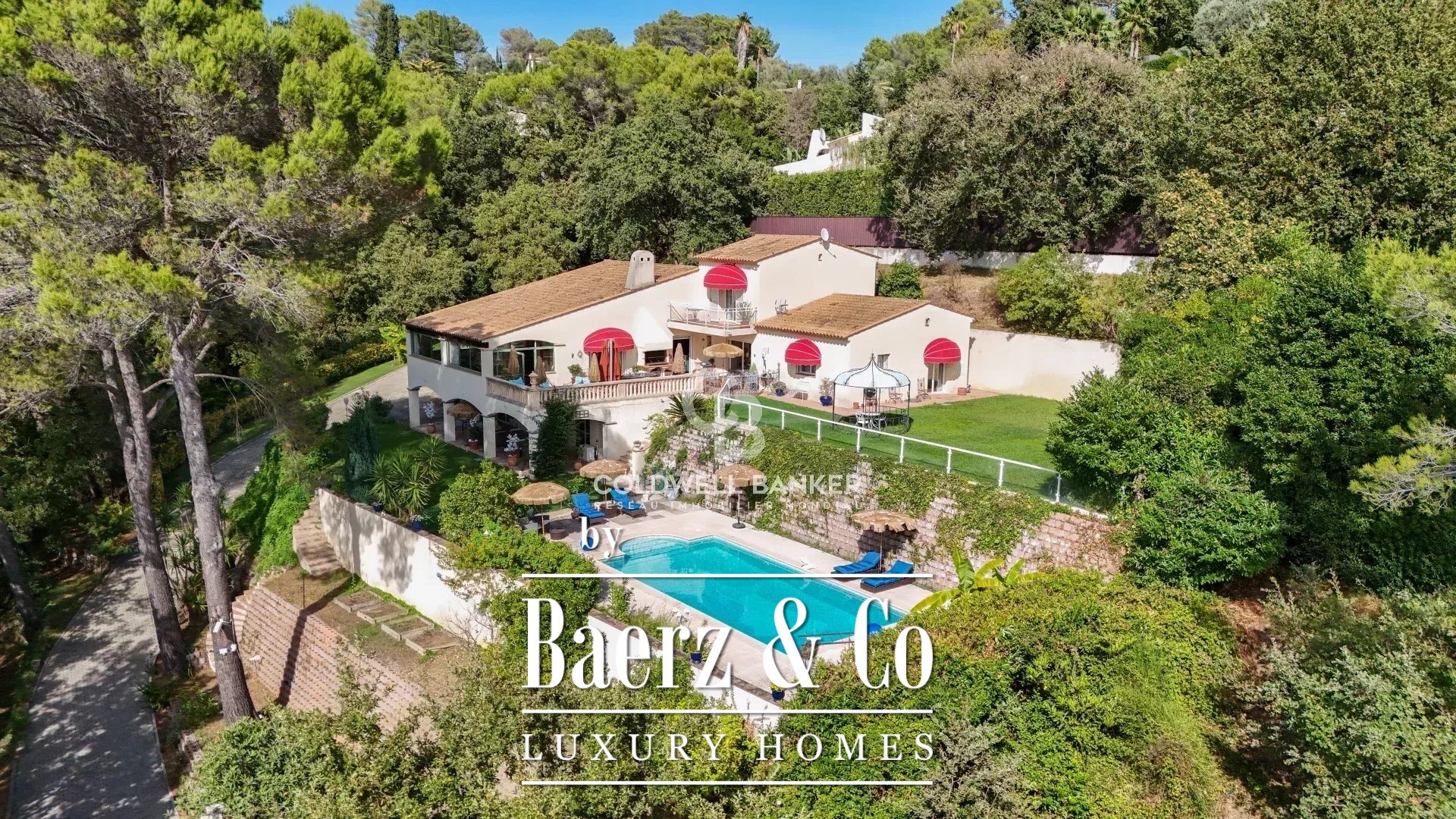 Co-Exclusivity - Nice property located in absolute calm and enjoying a very beautiful view of the sea and the Esterel as well as on the surrounding hills, a few minutes from the center of Mouans Sartoux or international schools. The villa is structured on three levels: - on the ground floor: an imposing living room of 95 m2, a kitchen opening onto the pretty terrace, a master suite and a second independent suite (possibility to create a very large master