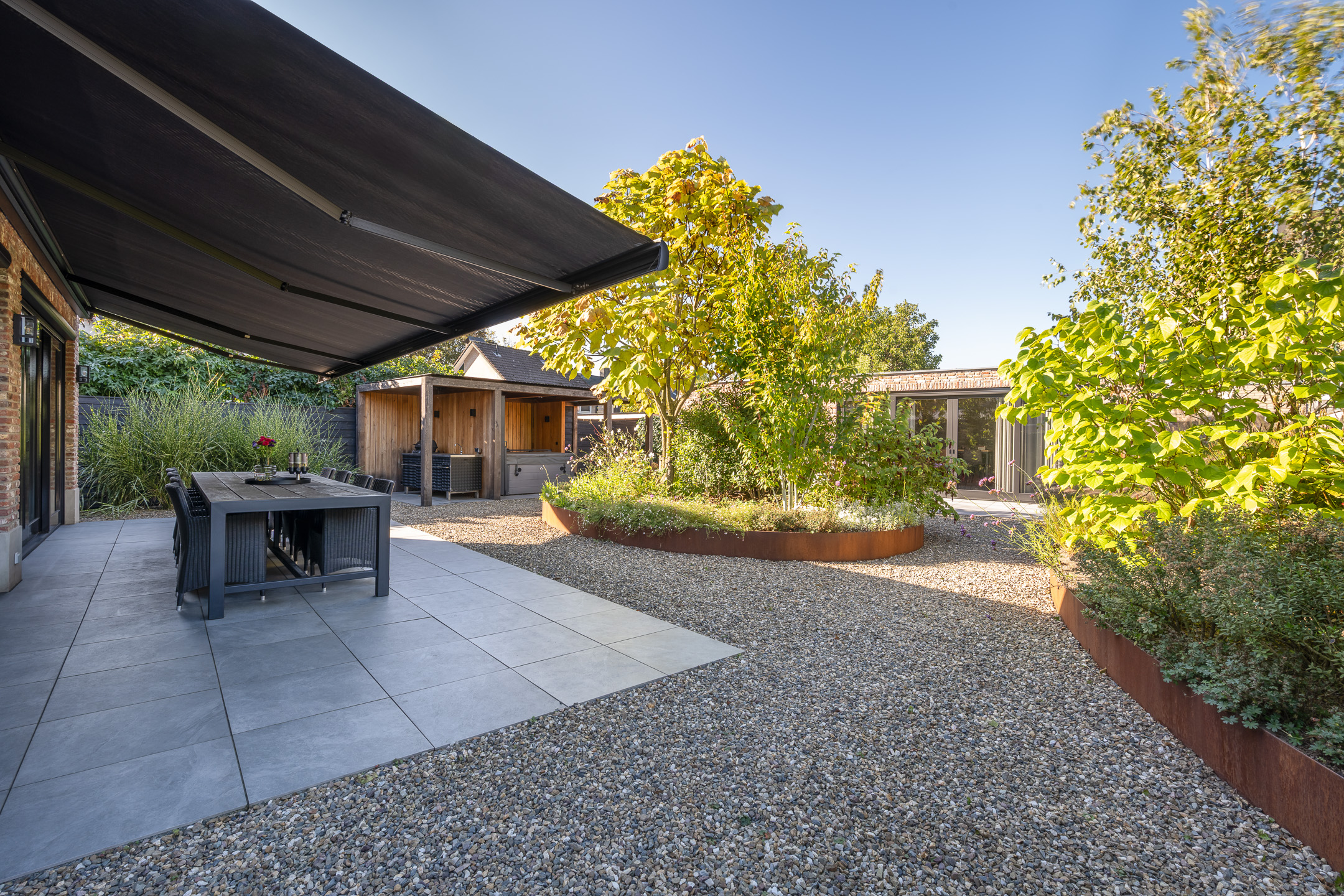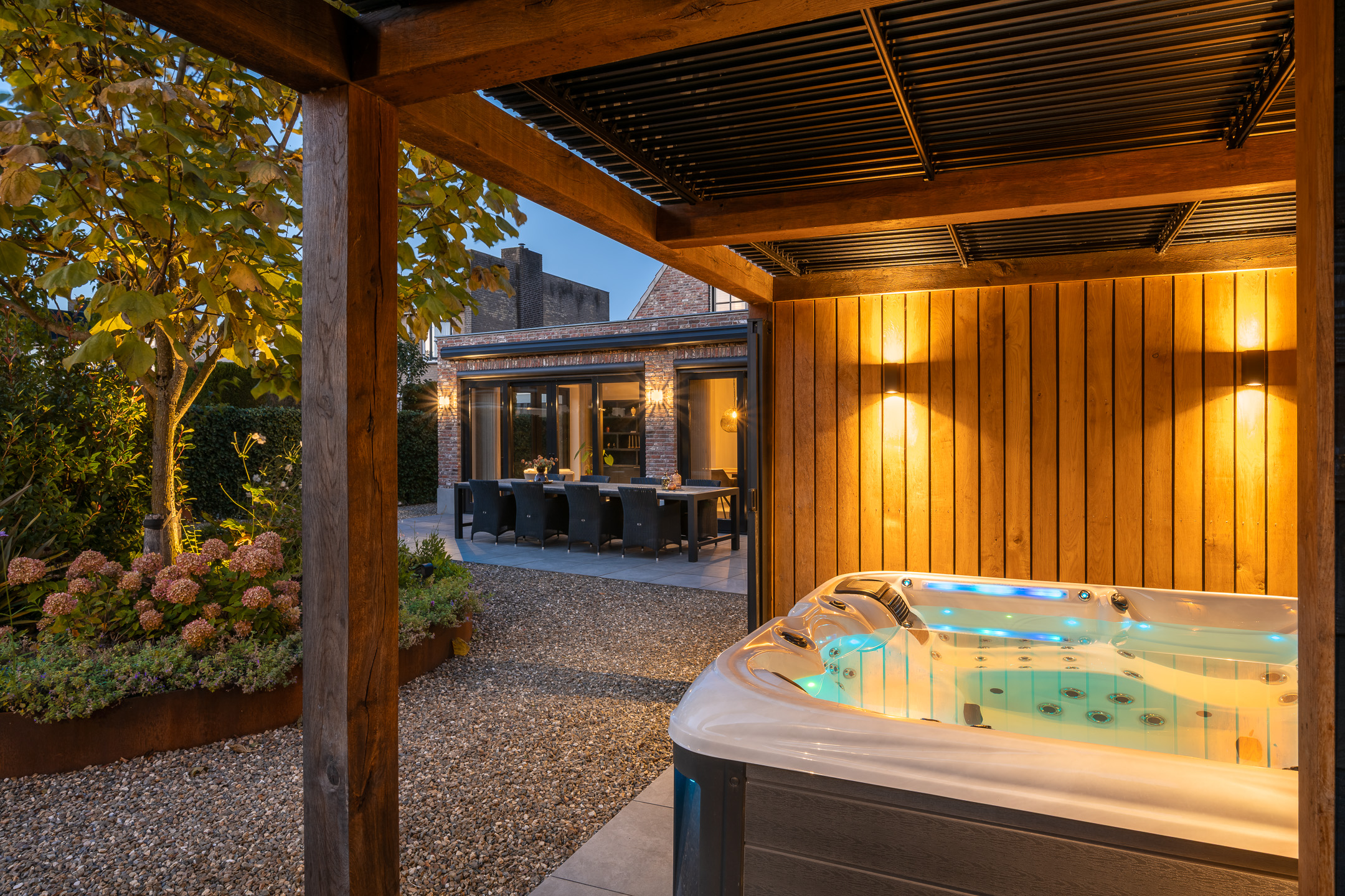 The garden has been professionally designed by an architect and offers a high degree of privacy. It includes a jacuzzi and a covered outdoor kitchen, allowing residents to fully enjoy outdoor living throughout the seasons.