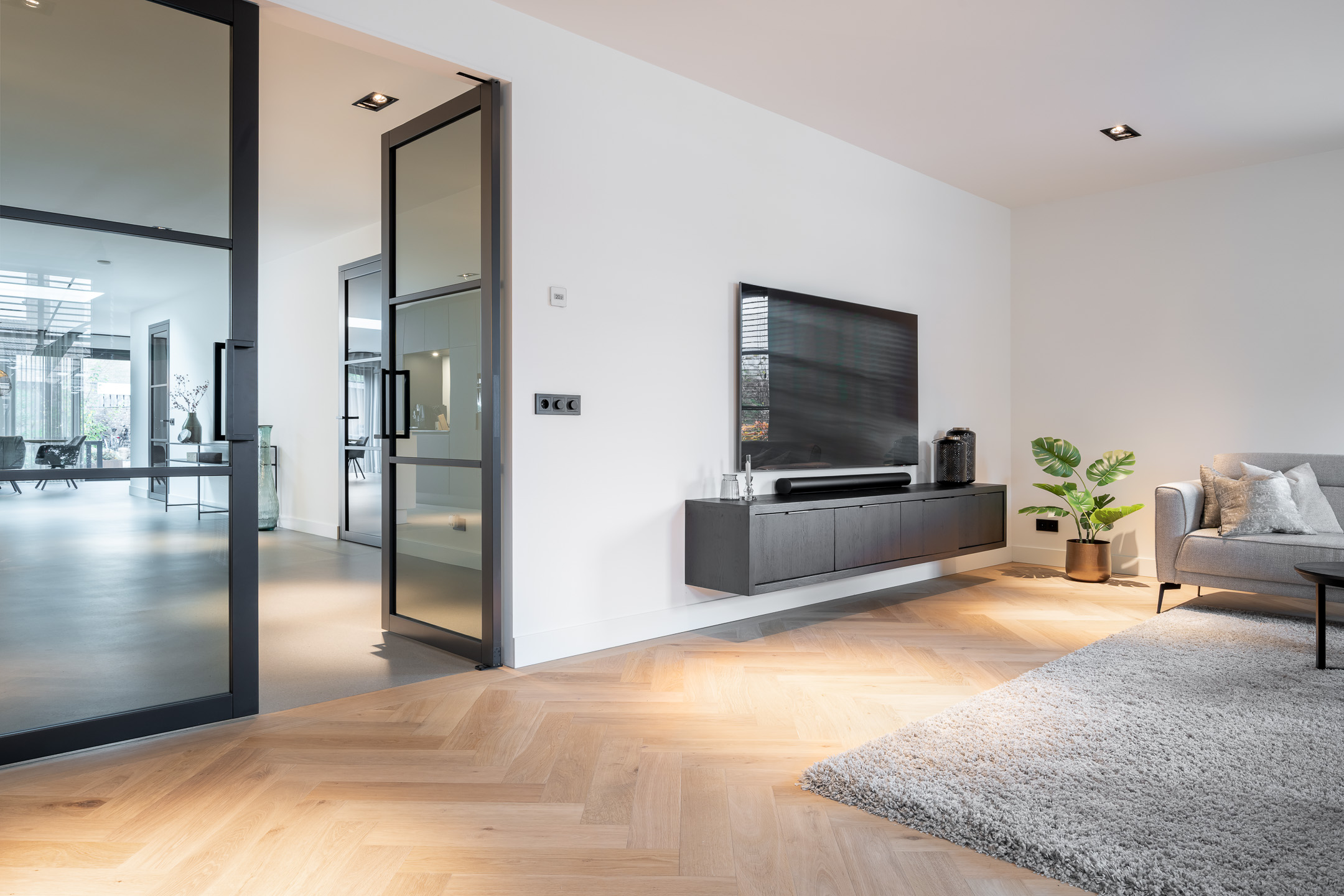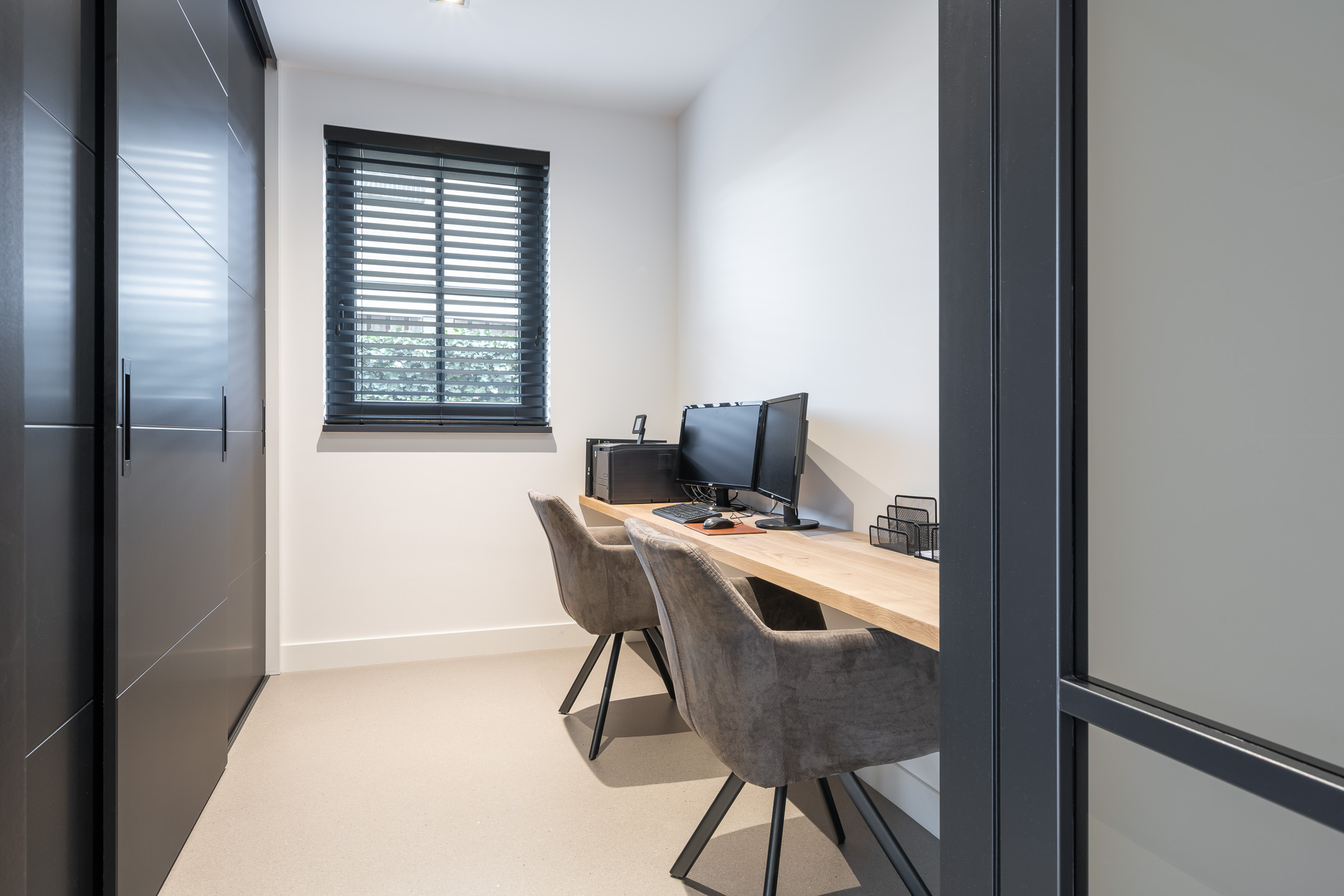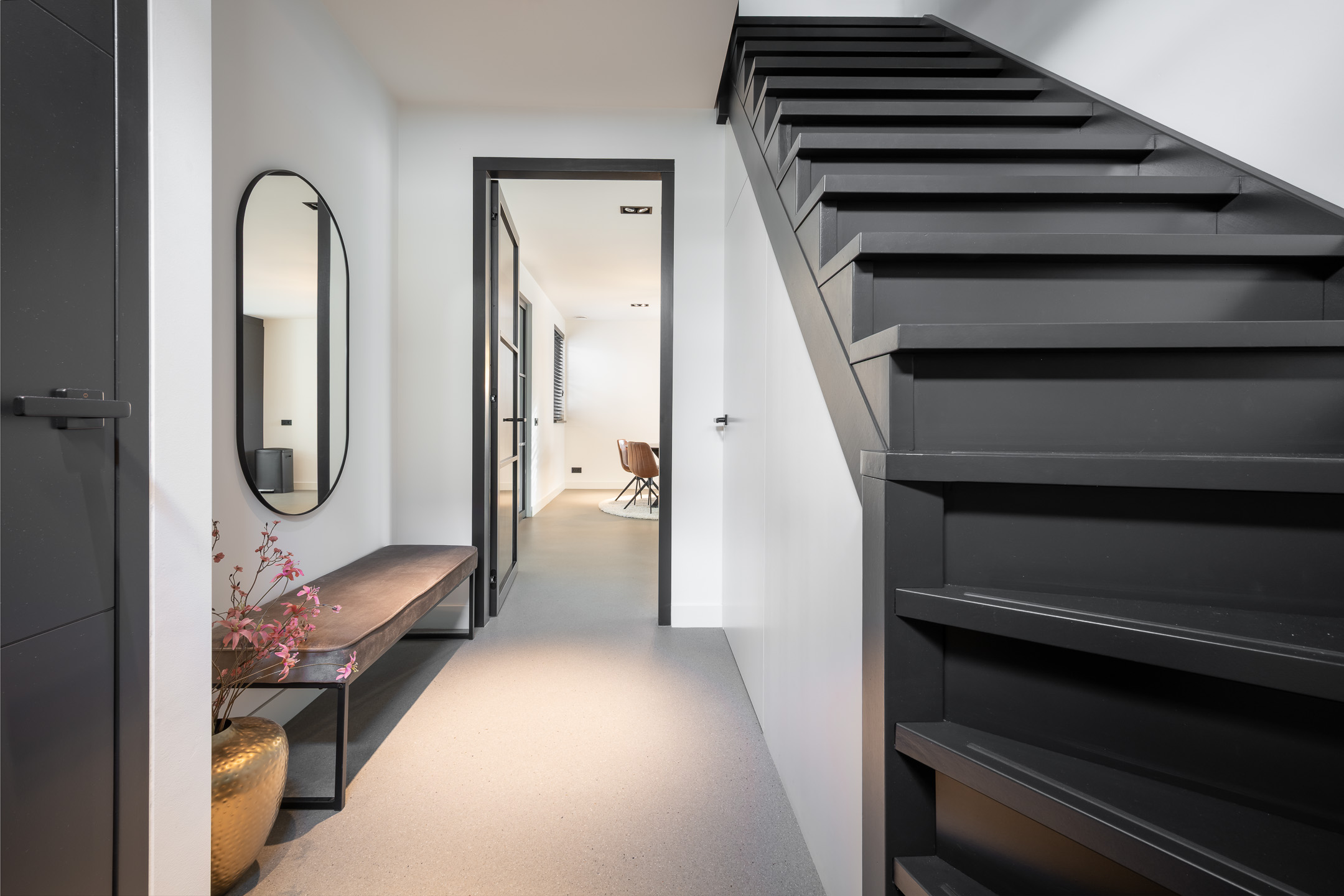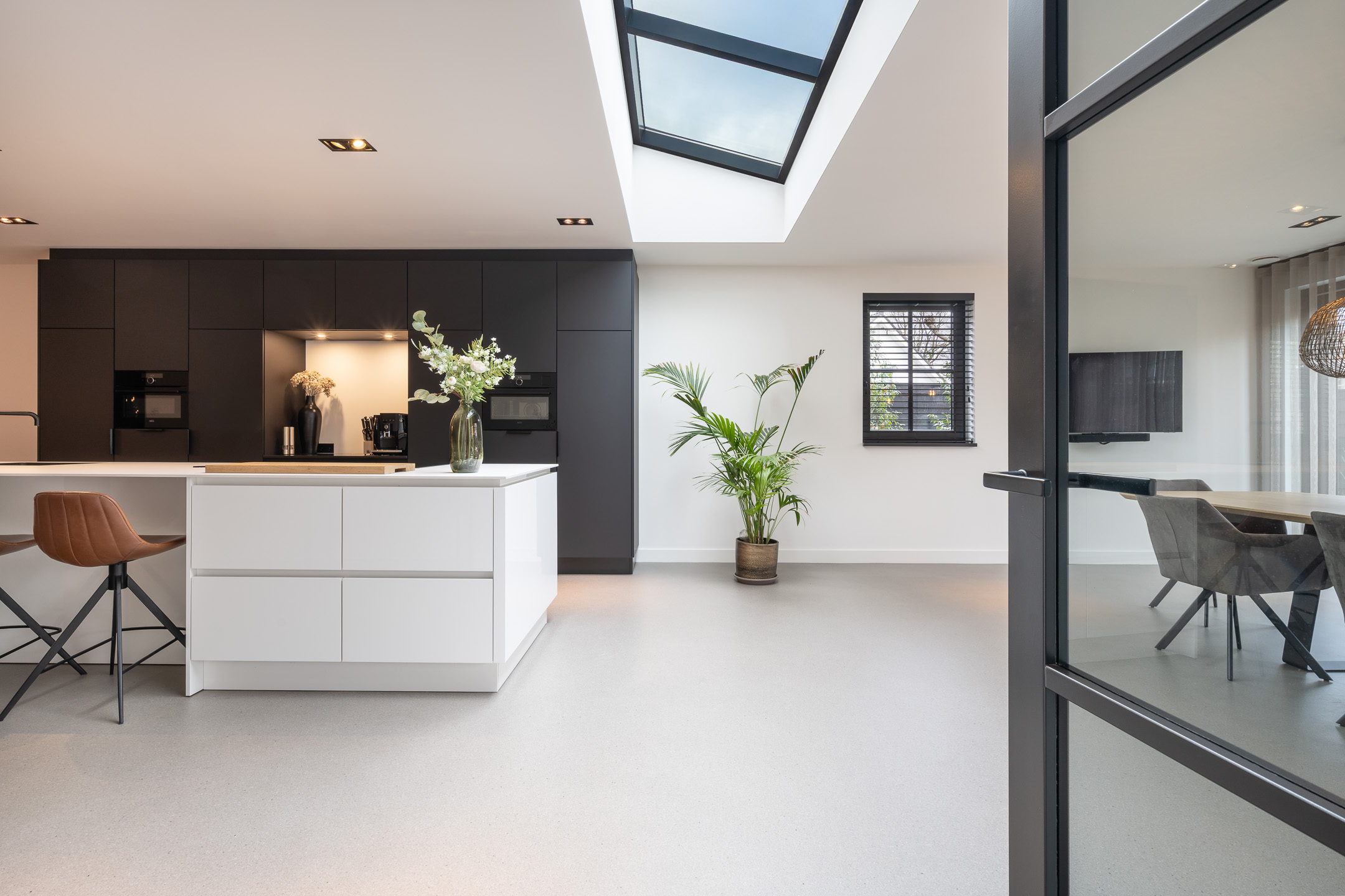 Adjacent to the kitchen is the spacious and inviting living room, characterized by abundant natural light. The ground floor further includes a home office, a separate laundry room, and a seamless connection to the garden. Throughout the main level, underfloor heating is installed beneath an extremely durable, scratch-resistant seamless floor finish. The interior is enhanced by sleek wall and ceiling finishes and interior doors with magnetic closures, contributing to a clean and modern aesthetic.