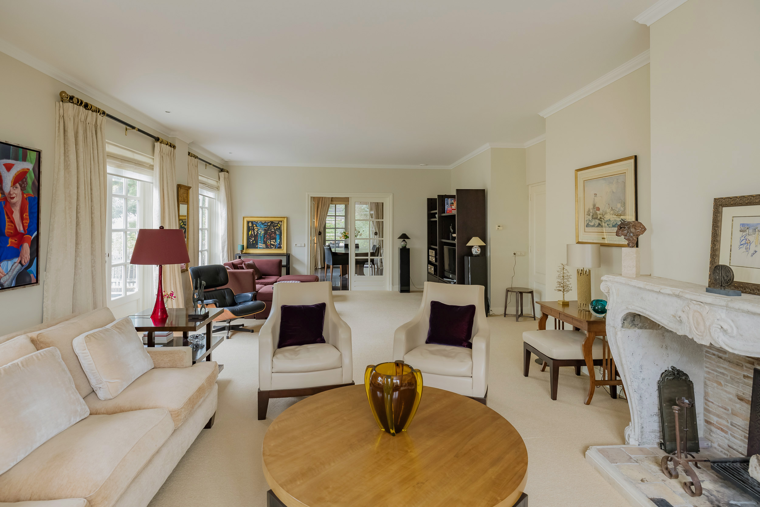 The villa exudes tranquility, space, and elegance. An elegant entrance, richly surrounded by flowers, welcomes you at the door. The spacious hall leads to the cozy living room with fireplace, adjacent dining room, and delightful kitchen with French doors to the garden. A place that invites you to spend long evenings cooking, dining, and enjoying life. A practical utility room and a spacious study on the ground floor complete the picture. All rooms have direct access to the garden, veranda, or one of the balconies.