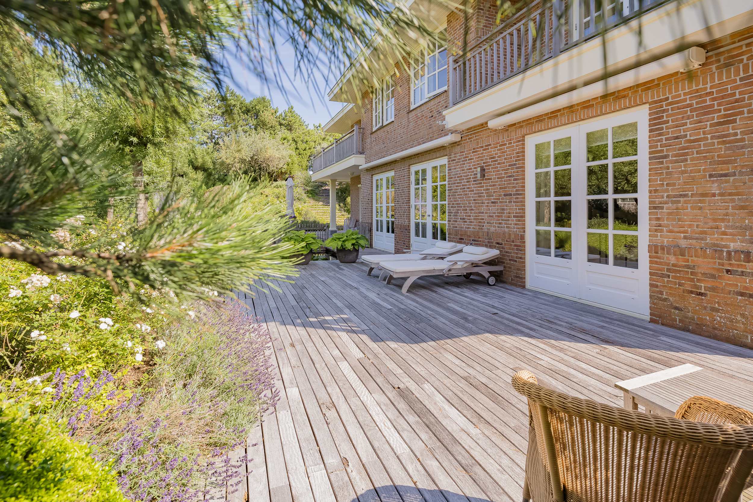 The garden is truly enchanting. Designed by architect Arend Jan van der Horst, it slopes gently with the dune landscape and offers an oasis of peace and beauty. Terraces, various seating areas, large trees, richly flowering borders, a pond with a deck terrace, and elegant shell paths create a unique outdoor experience. A place to enjoy endlessly.