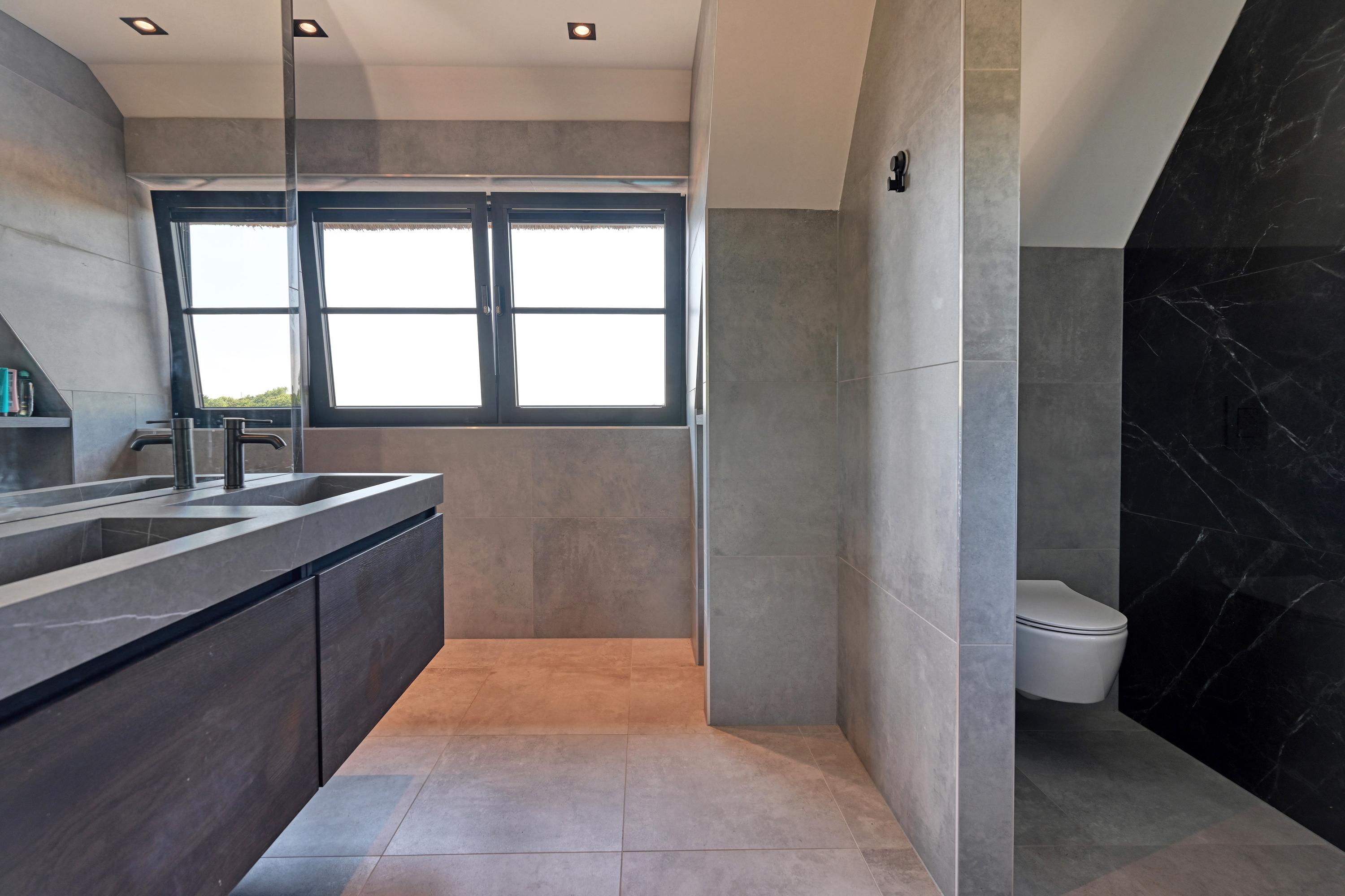 The first floor features two spacious bedrooms and two luxurious bathrooms, both exuding the same warm ambiance but offering varying views of bulb fields and dunes. The master bedroom has its own elegant walk-in closet, leading directly to an en-suite bathroom equipped with a bathtub, a luxurious double vanity, a shower, and a separate toilet.