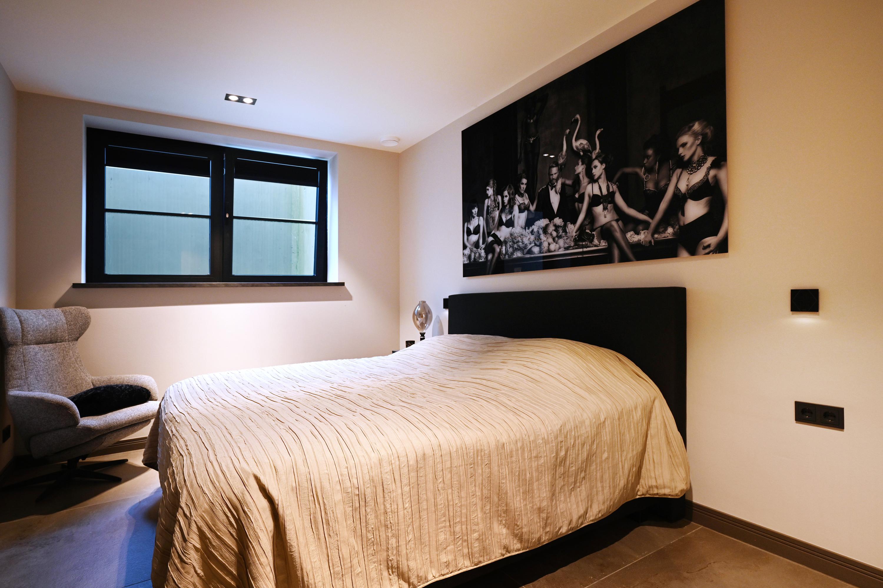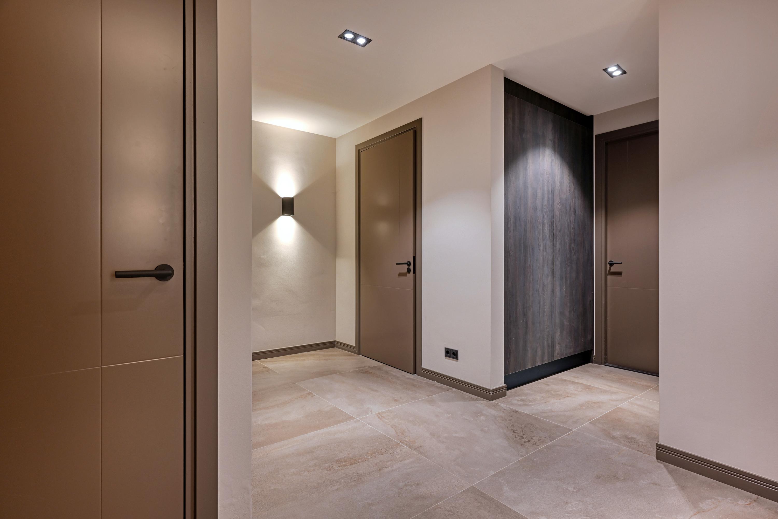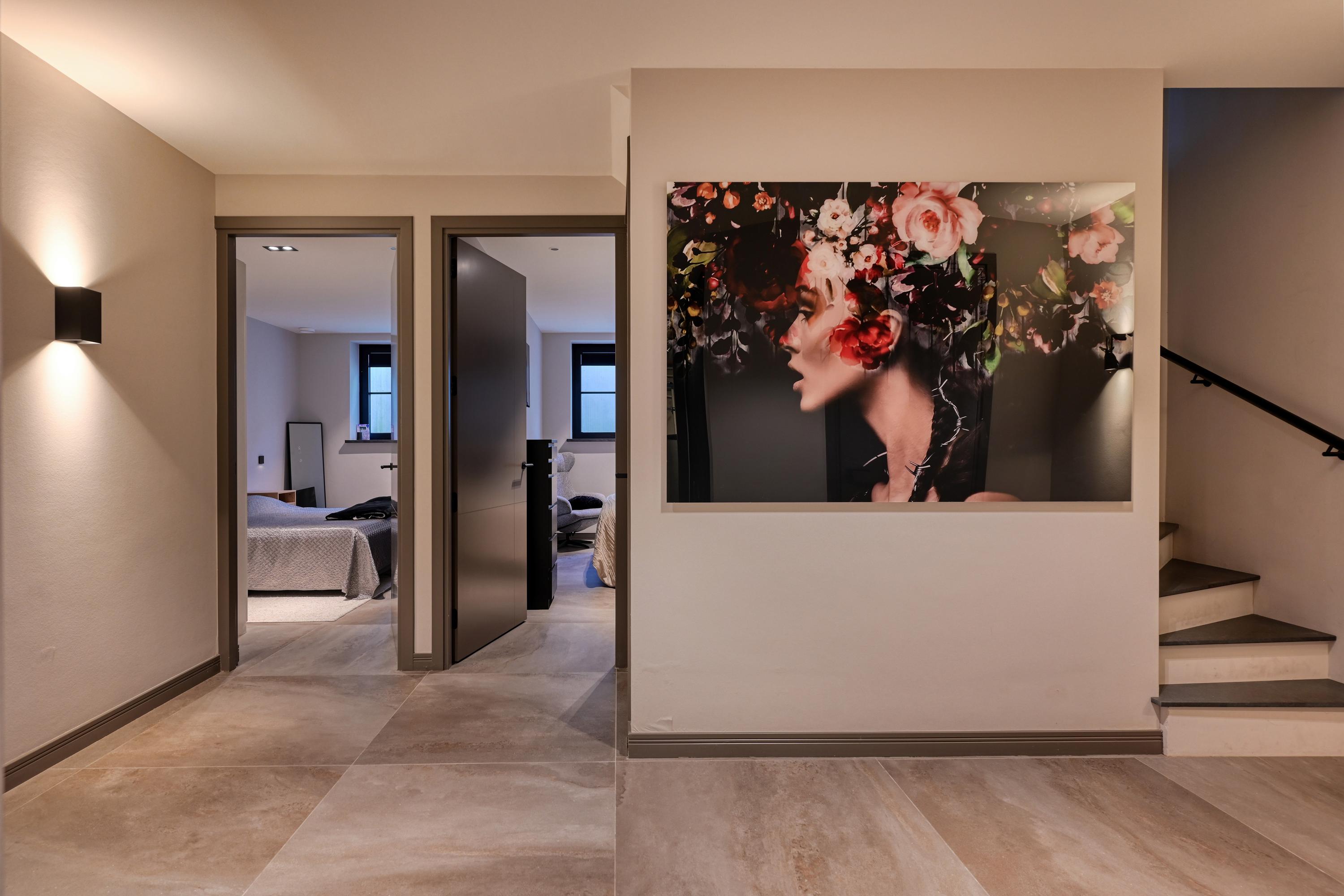Upon entering, you’ll find a spacious entryway with a loft and a beautiful staircase; it immediately becomes clear that this villa was designed with a sense of space and elegance. Steel doors with smoked glass provide access to the living room.