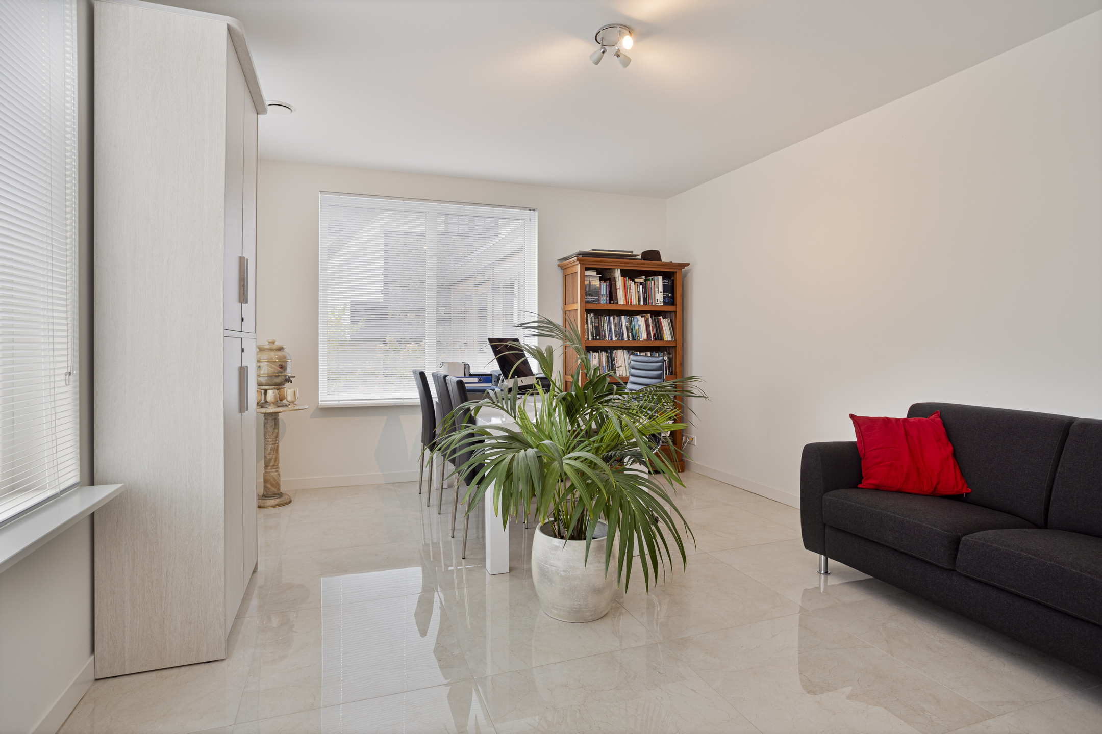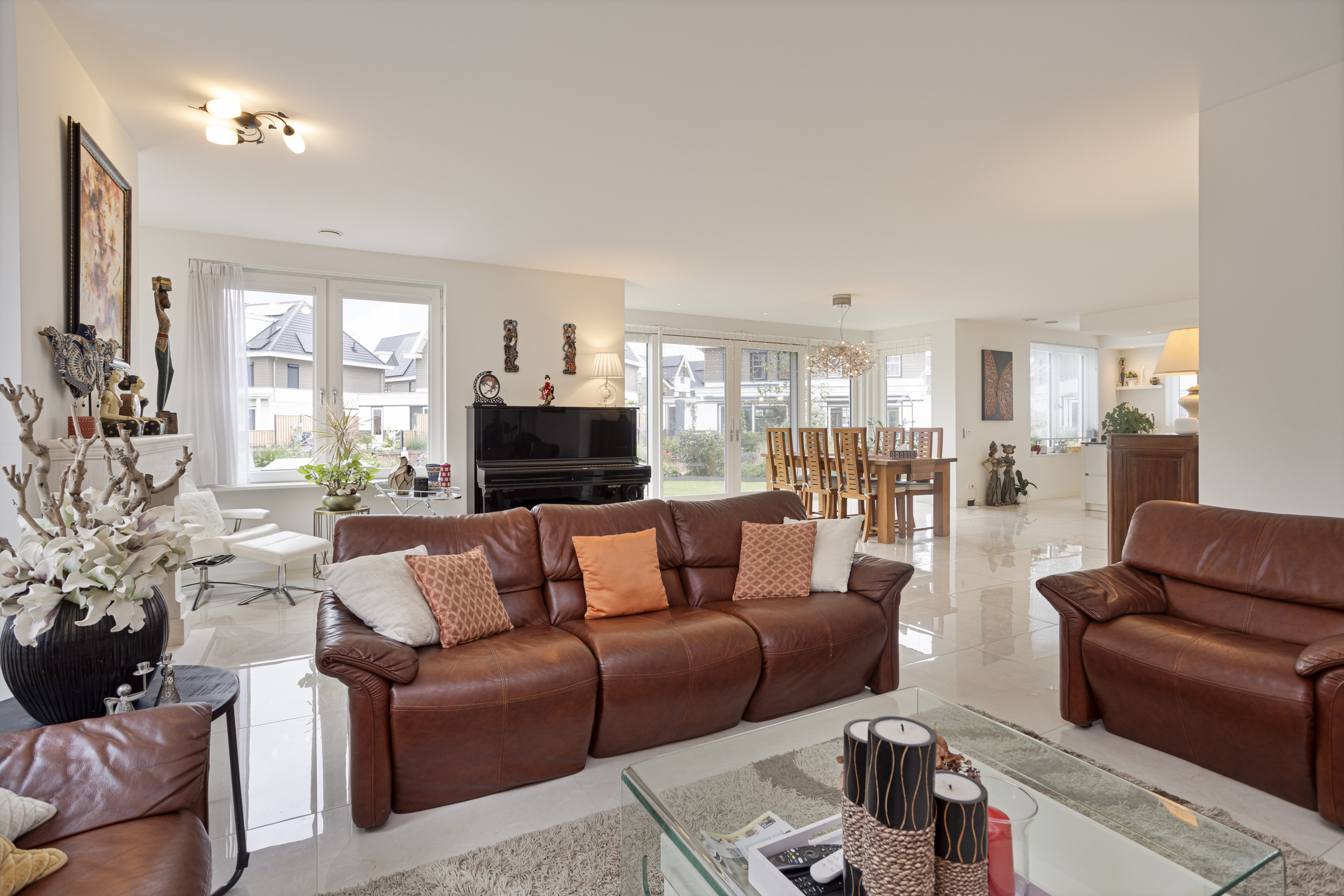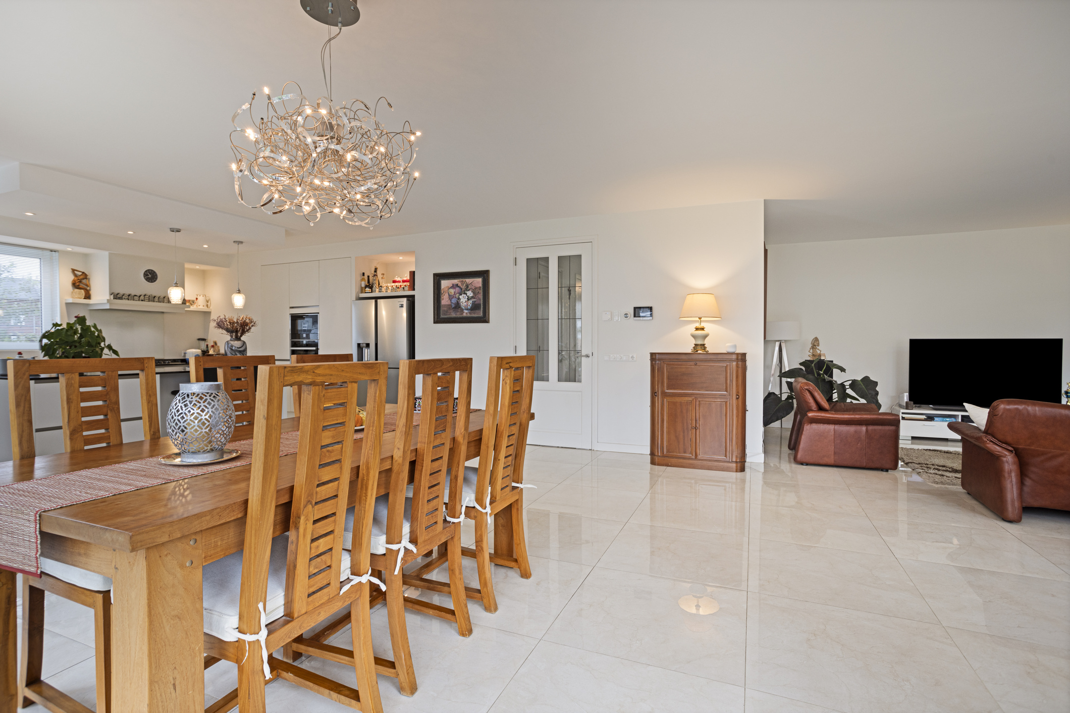 Spacious and bright entrance with toilet and storage cupboard. On the left there is a beautiful work or play room. On the right side, the door gives access to the double indoor garage. The living area (along with the kitchen) measures over 65 m2 and consists of a spacious and bright living room with fireplace, a dining area in the middle part with patio doors to the garden and a modern and luxurious open kitchen with an 'island', which is of course equipped with all modern equipment.