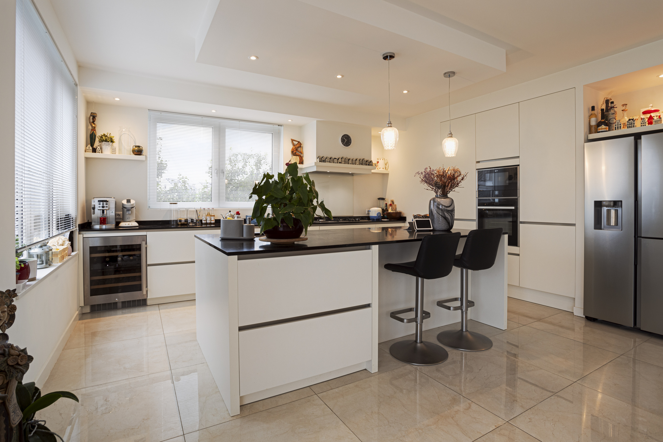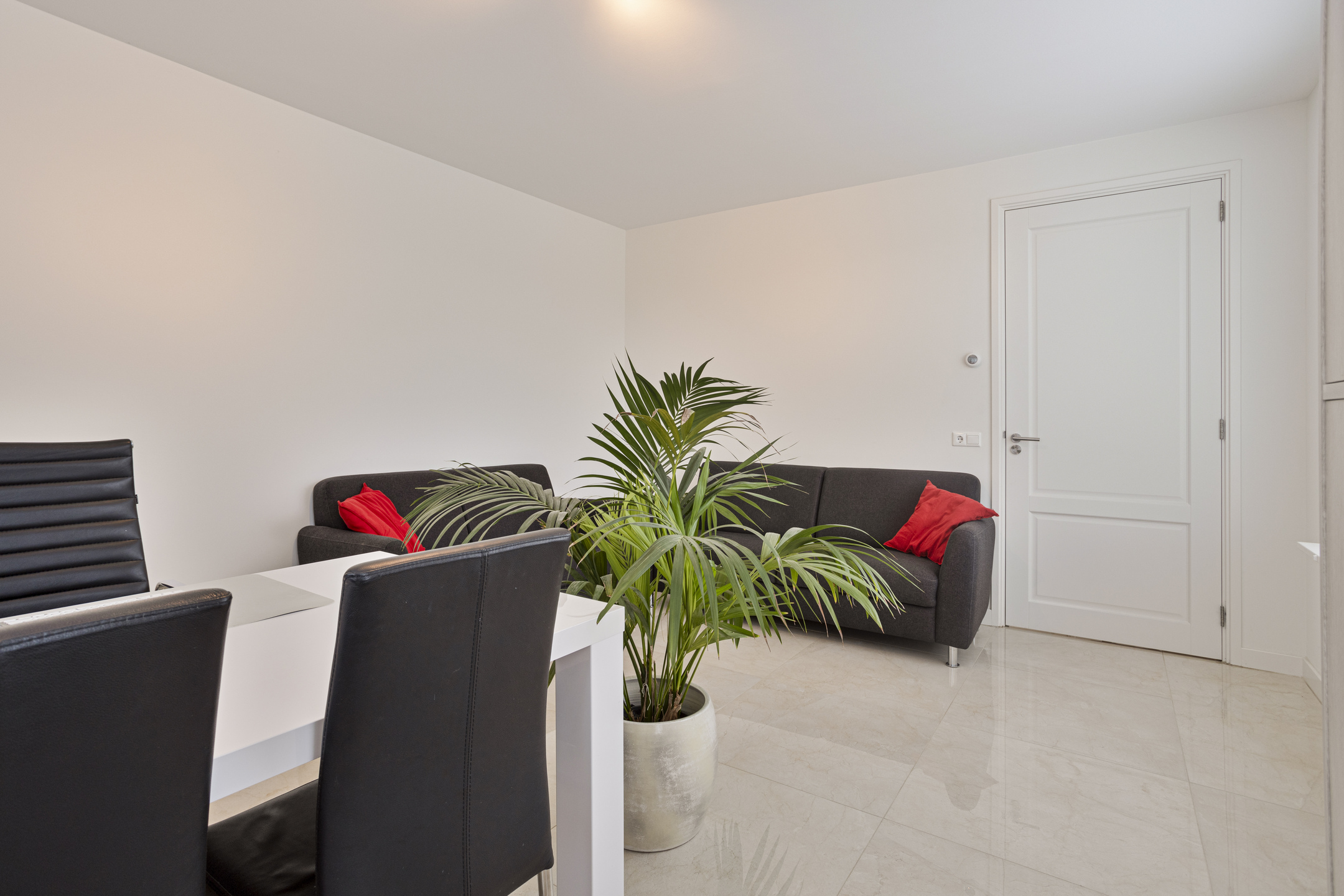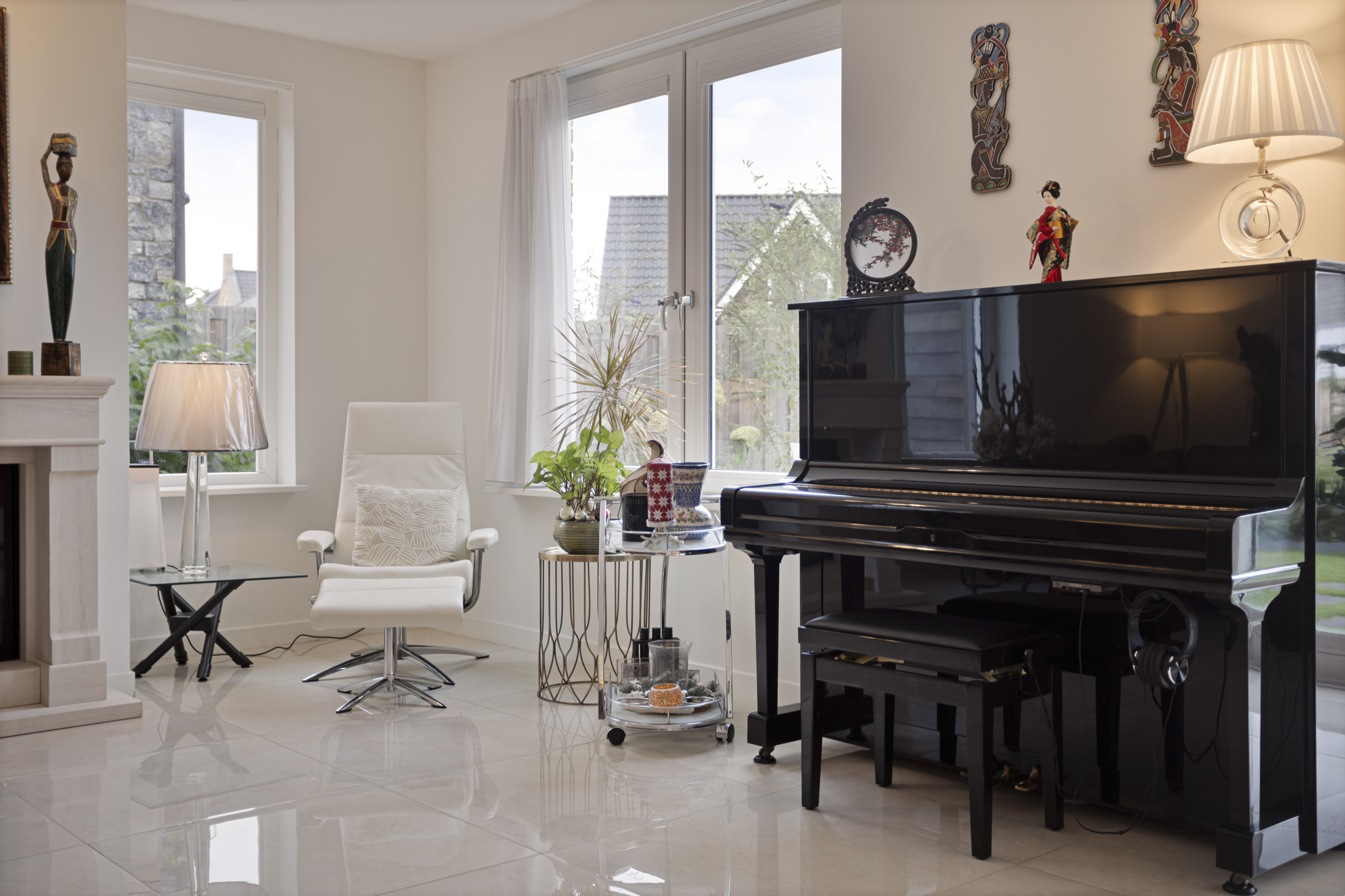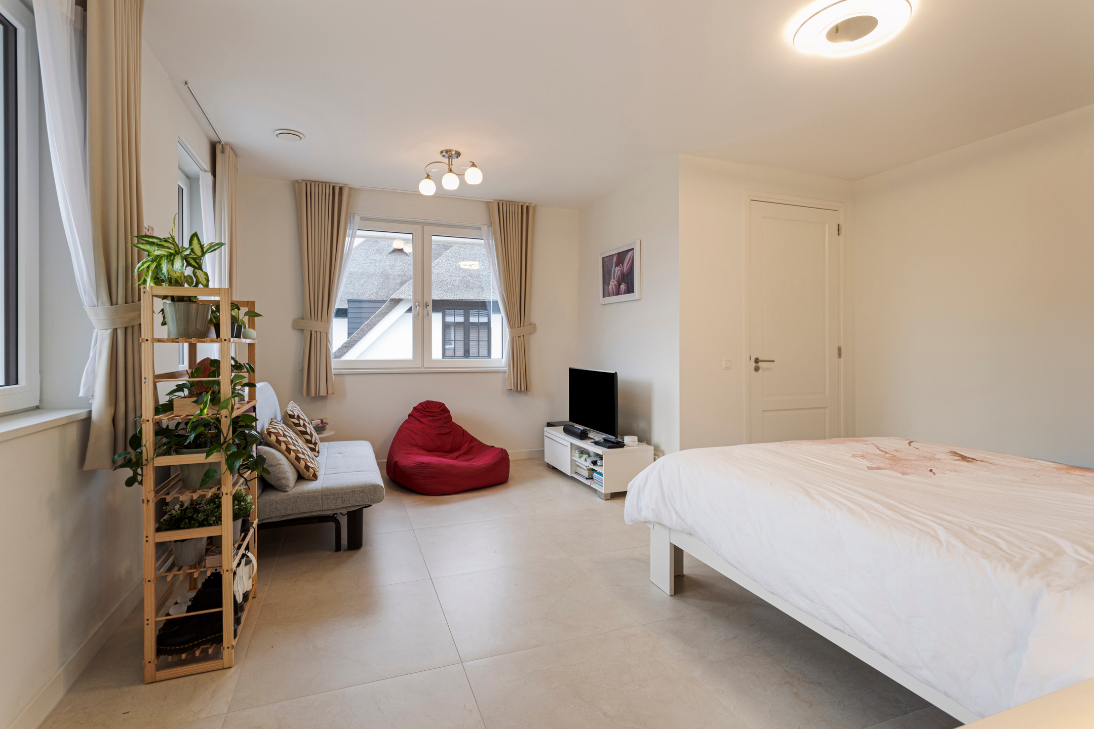 Spacious and bright entrance with toilet and storage cupboard. On the left there is a beautiful work or play room. On the right side, the door gives access to the double indoor garage. The living area (along with the kitchen) measures over 65 m2 and consists of a spacious and bright living room with fireplace, a dining area in the middle part with patio doors to the garden and a modern and luxurious open kitchen with an 'island', which is of course equipped with all modern equipment.