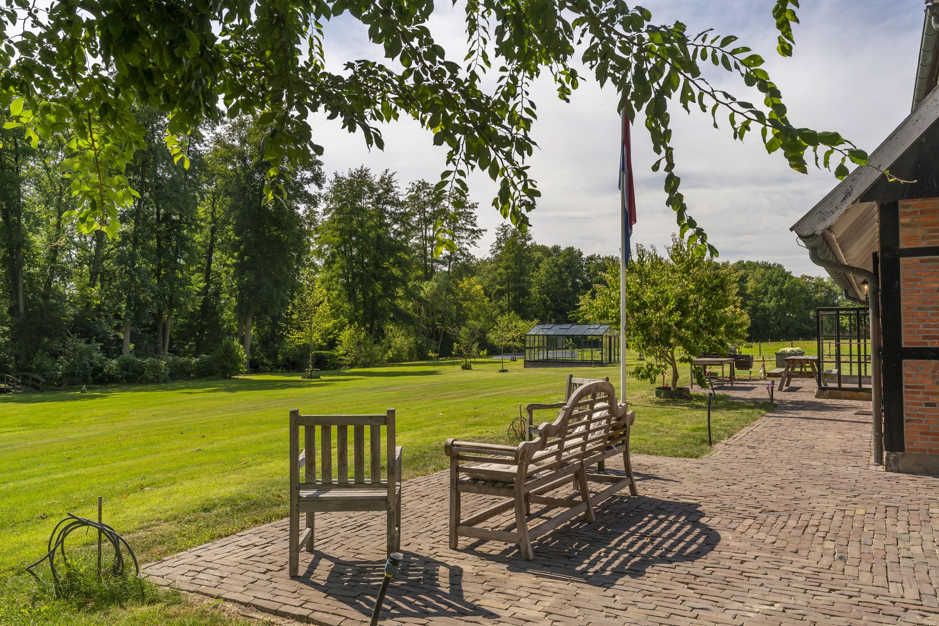 Rondom het landhuis zijn grote gazons aangelegd met verschillende terrassen. Voor de tuinliefhebbers zijn een kas en moestuin op niveau aanwezig. Nagenoeg het gehele terrein kan worden beregend zodat ook in de steeds droger en warmer wordende zomers het hier altijd fraai en lentegroen oogt.