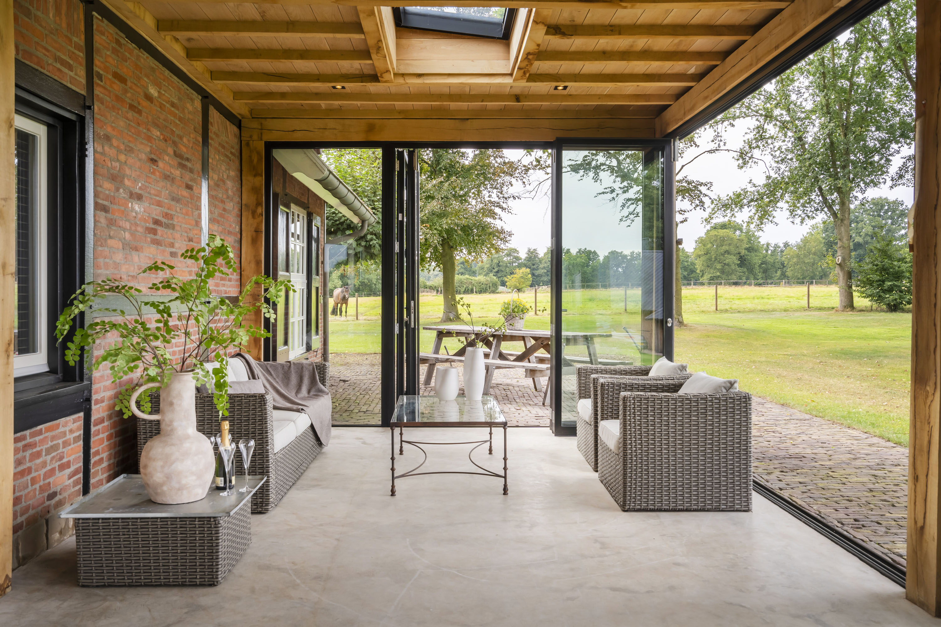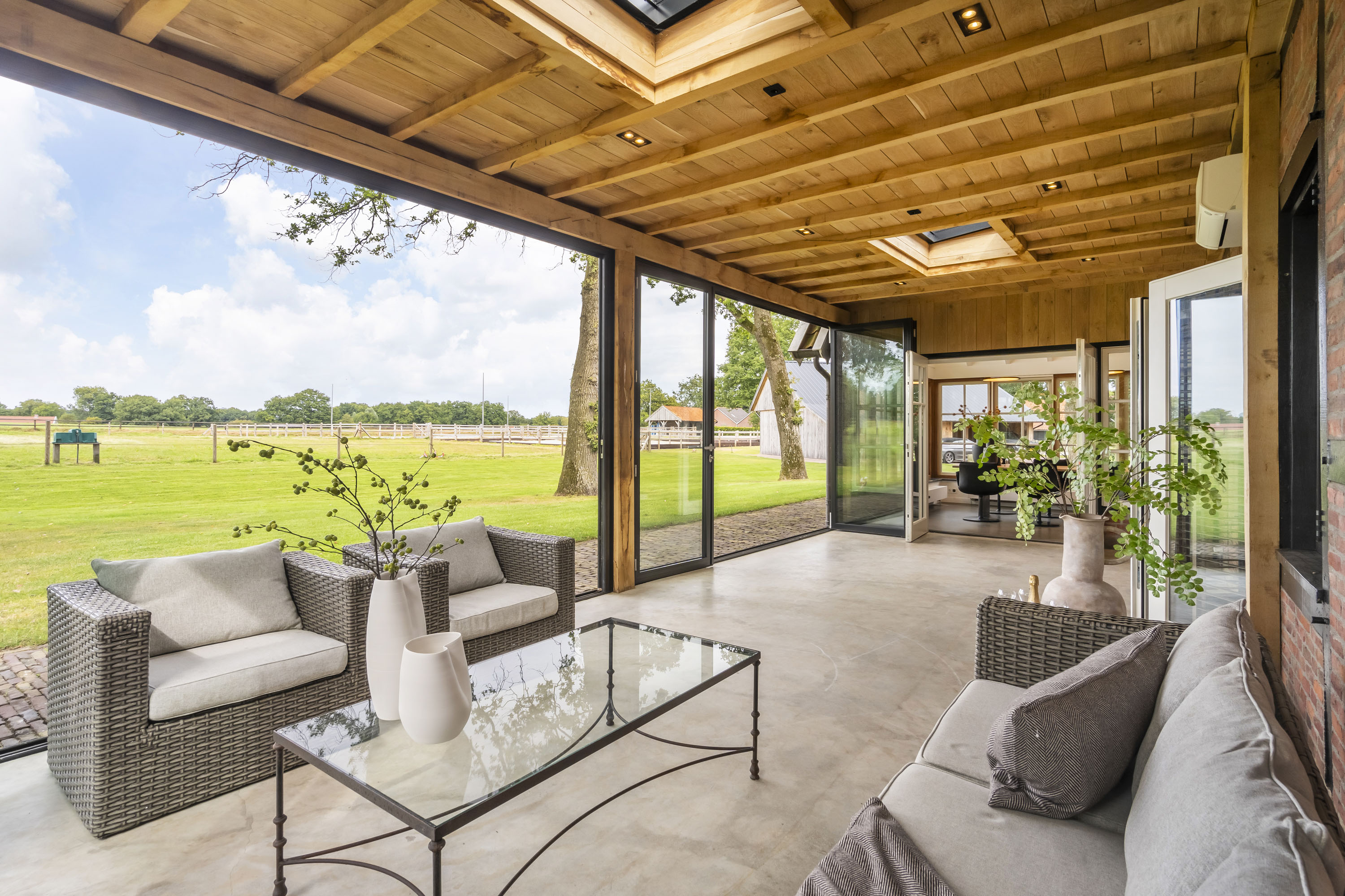 - aansluitend een grote serre, uitgevoerd in stijlvolle antracietkleurige kozijnen die in zijn geheel op kunnen worden gezet. Het eikenhout en de gietvloer combineren fraai en maken dit tot een geliefde multifunctionele ruimte;