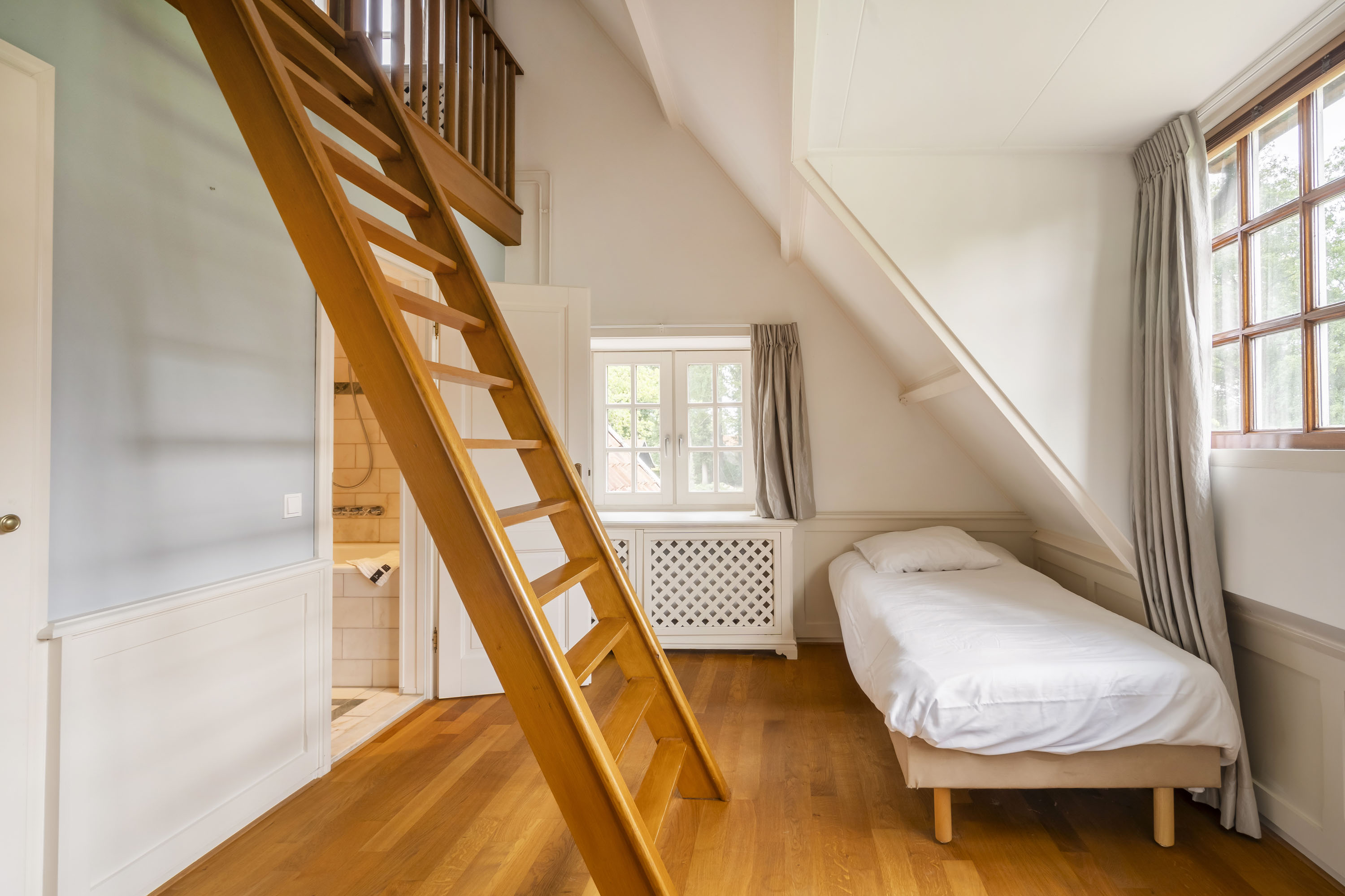 - slaapkamer met speelse via vaste trap te bereiken extra ruimte in de nok, badkamer met ligbad, douche, toilet en wastafel en designradiator