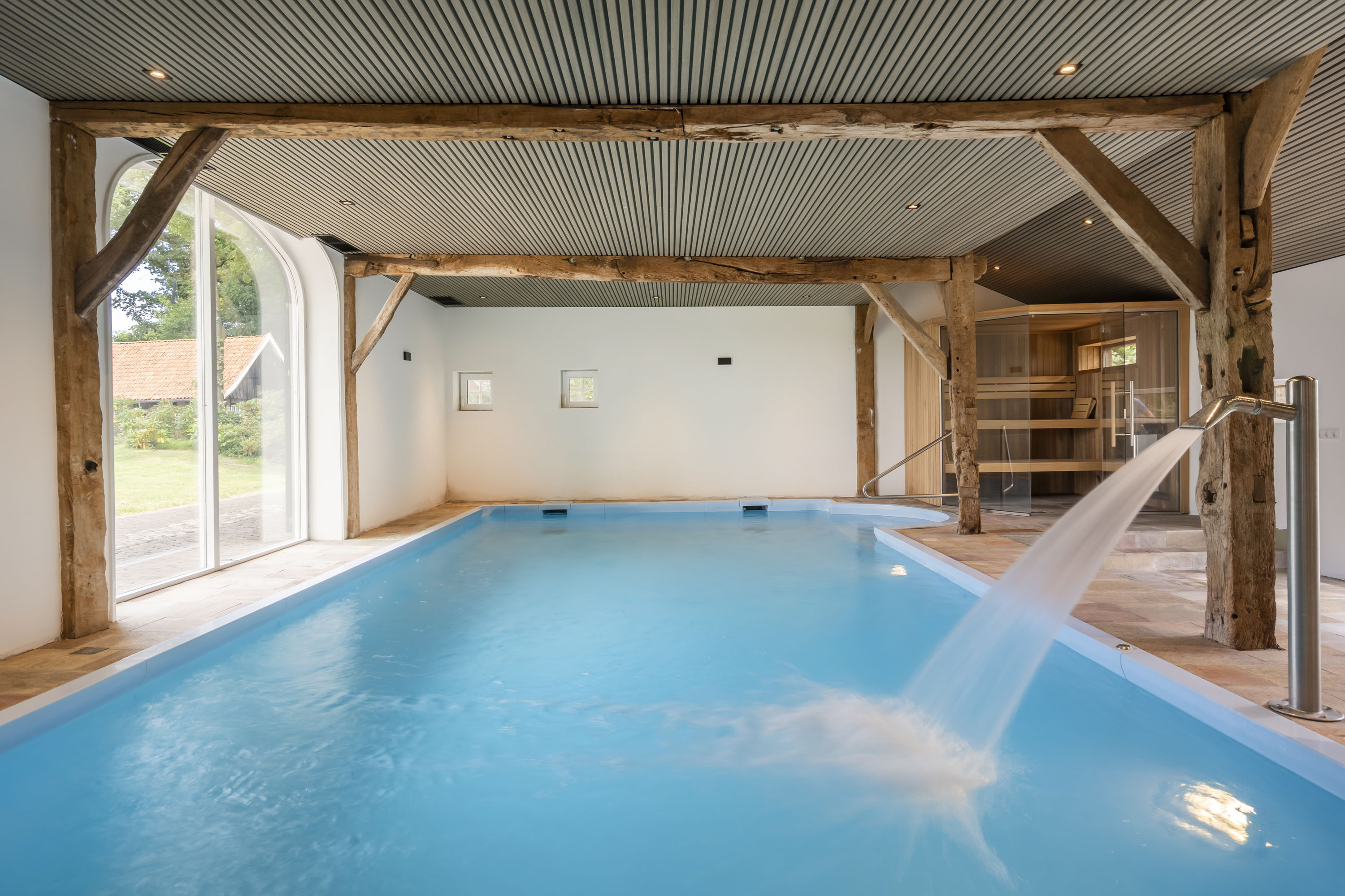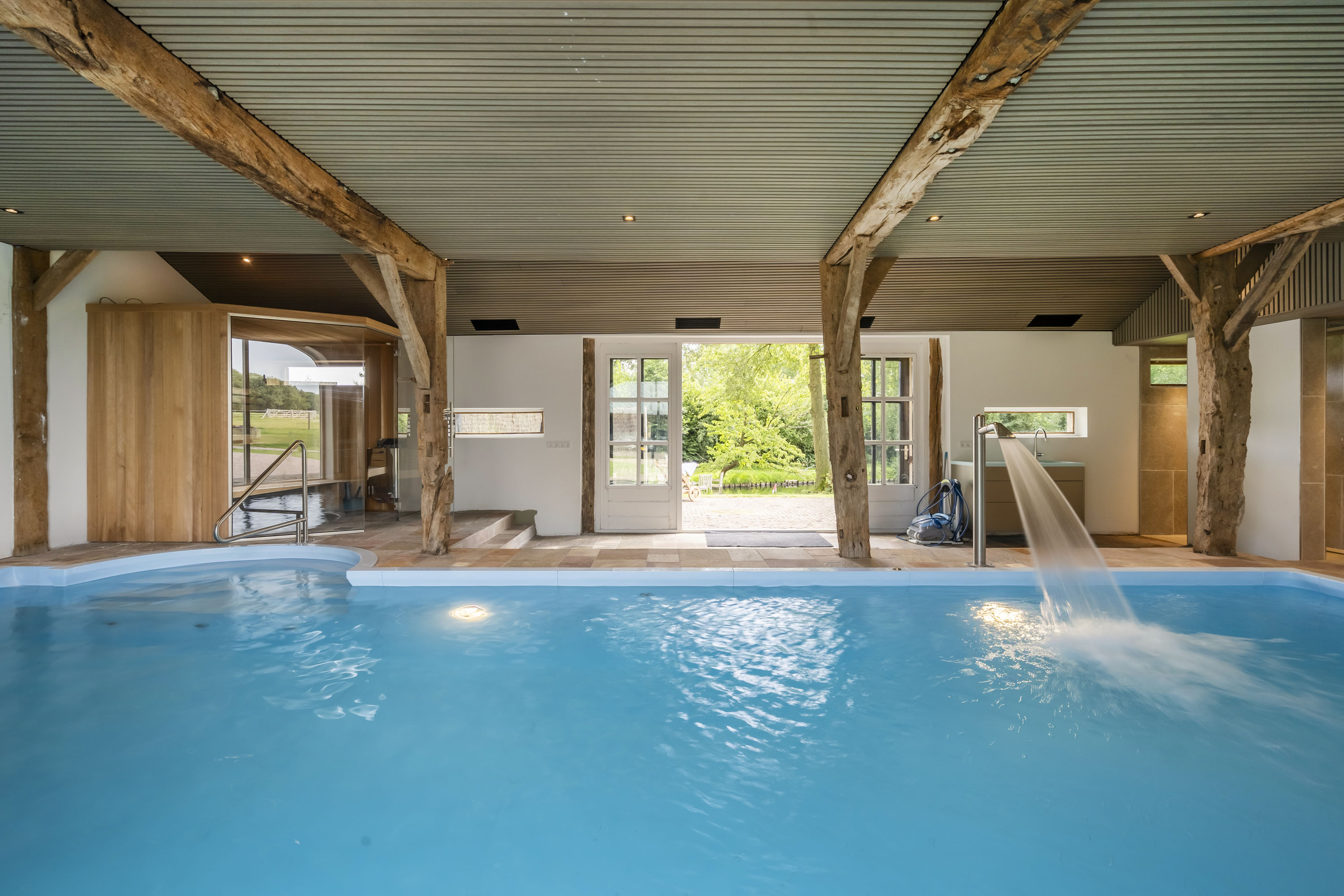 Een karakteristiek bijgebouw vormt een oase van ontspanning. Hier treft u een royaal zwembad, luxe sauna, exclusieve douche- en kleedruimte. En als klap op de vuurpijl een jacuzzi op het aangrenzende buitenterras. De perfecte plek om in alle rust tot uzelf te komen of gasten op exclusieve wijze te ontvangen. De verdieping van dit gebouw leent zich er zelfs voor om een gastenverblijf te realiseren.